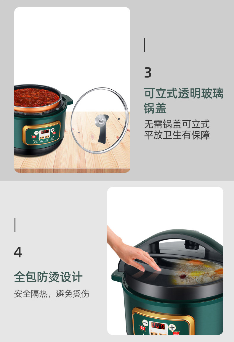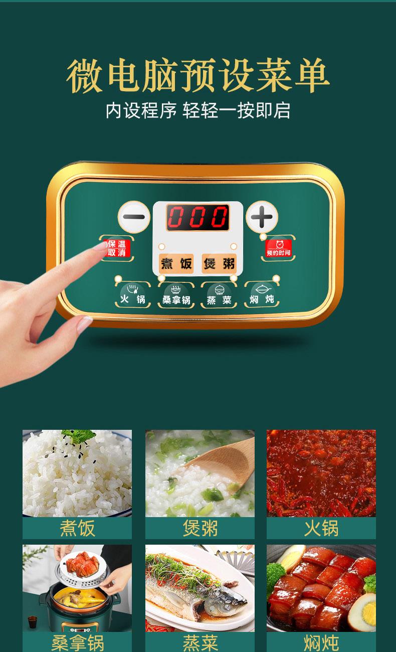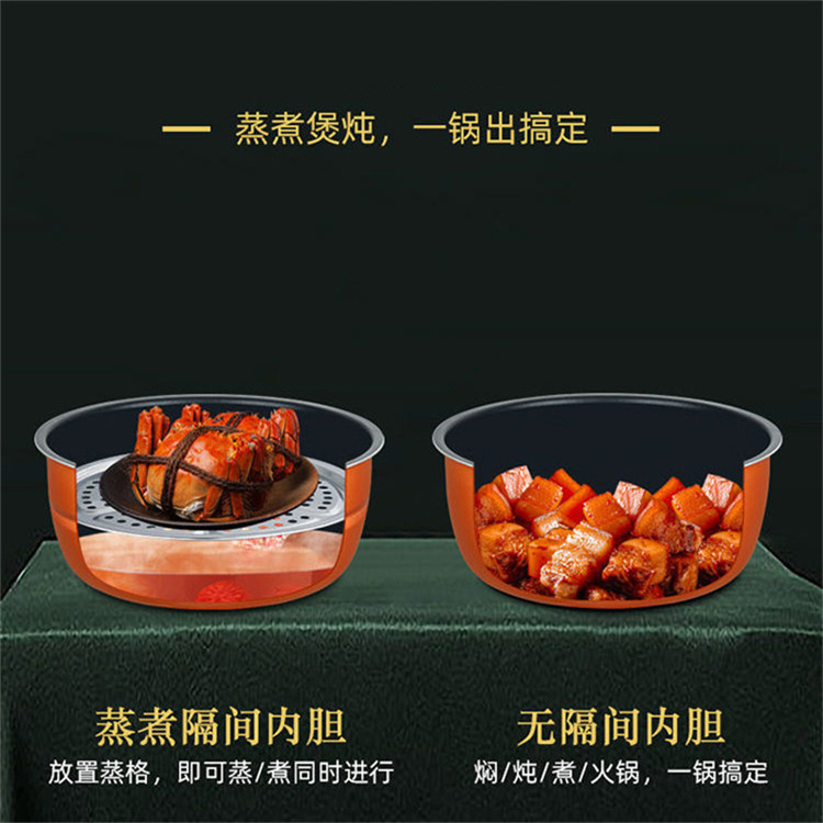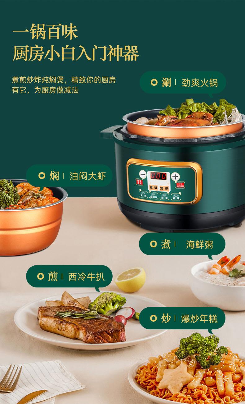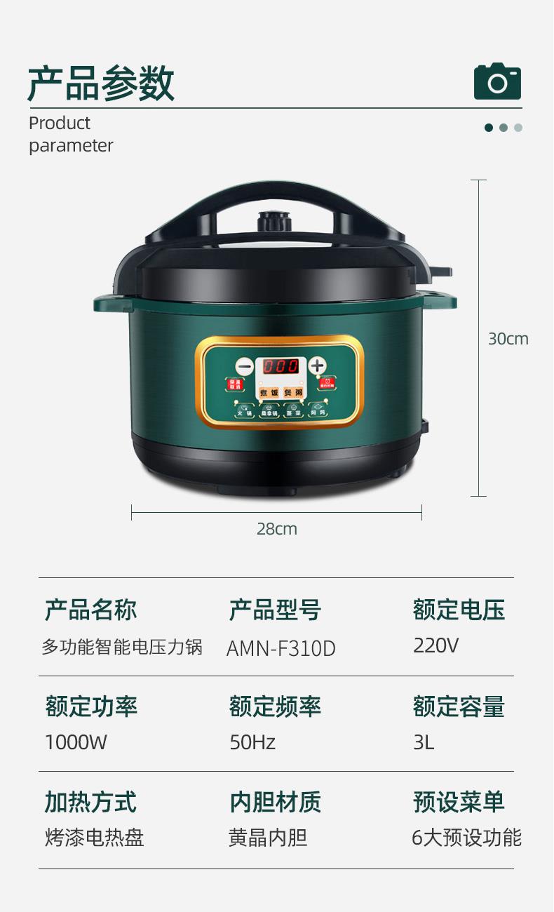 额定功率:1000W 加热方式:烤漆电热盘 额定频率:50HZ 内胆材质:黄晶内胆 额定电压:220V 额定容量:3L 预设菜单:6大预设功能 烹煮两用,带压力锅盖可立玻璃锅盖,锅盖自由切换,口感心选。煮煎炒炸焖锅。1000W速热底盘加热,可快速导热至整个热盘,实现均火效果受热更均匀。一锅双胆,蒸煮间隔内胆放置蒸格,即可蒸/煮同时进行,无隔间内胆,焖/煮/炖/火锅一锅搞定。五层加厚材质给健康增添煲。微电脑预设菜单,内设程序轻轻一按即启,两种烹煮模式,独特双重温控。内置营养烹煮程序,微电脑预约设计,预约时间档位长短可调控美味不过火候,一锅多能性价比高,可代替多种锅,10大安全保护贴心安全防护安心顺享美味。小巧机身一身技艺适合1-4人。放着不占地收纳起来也方便。