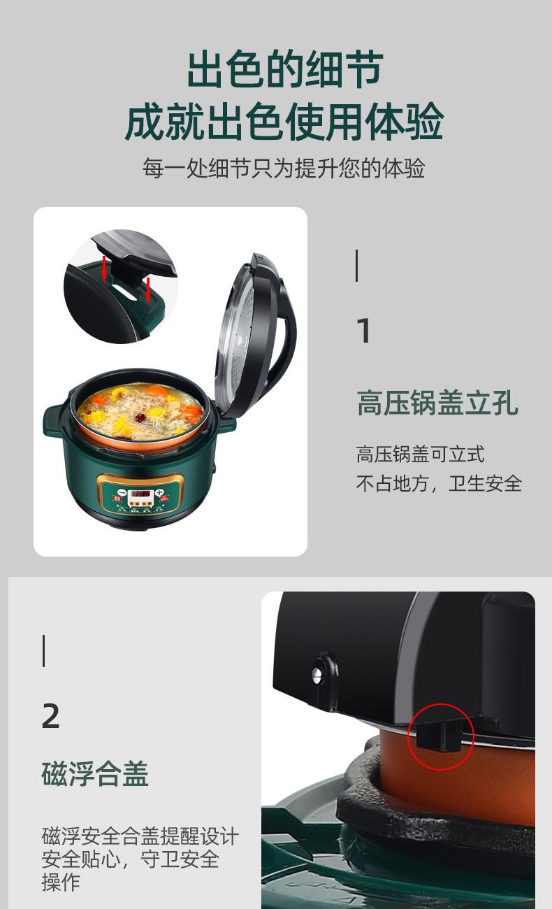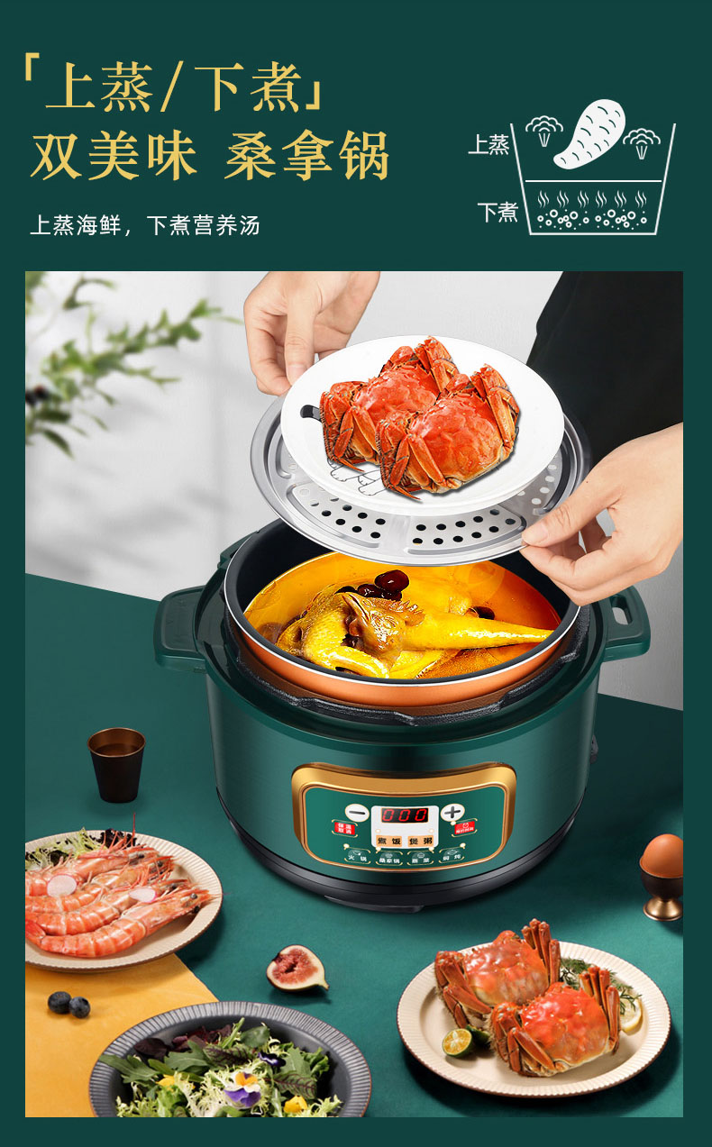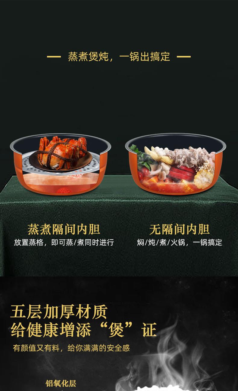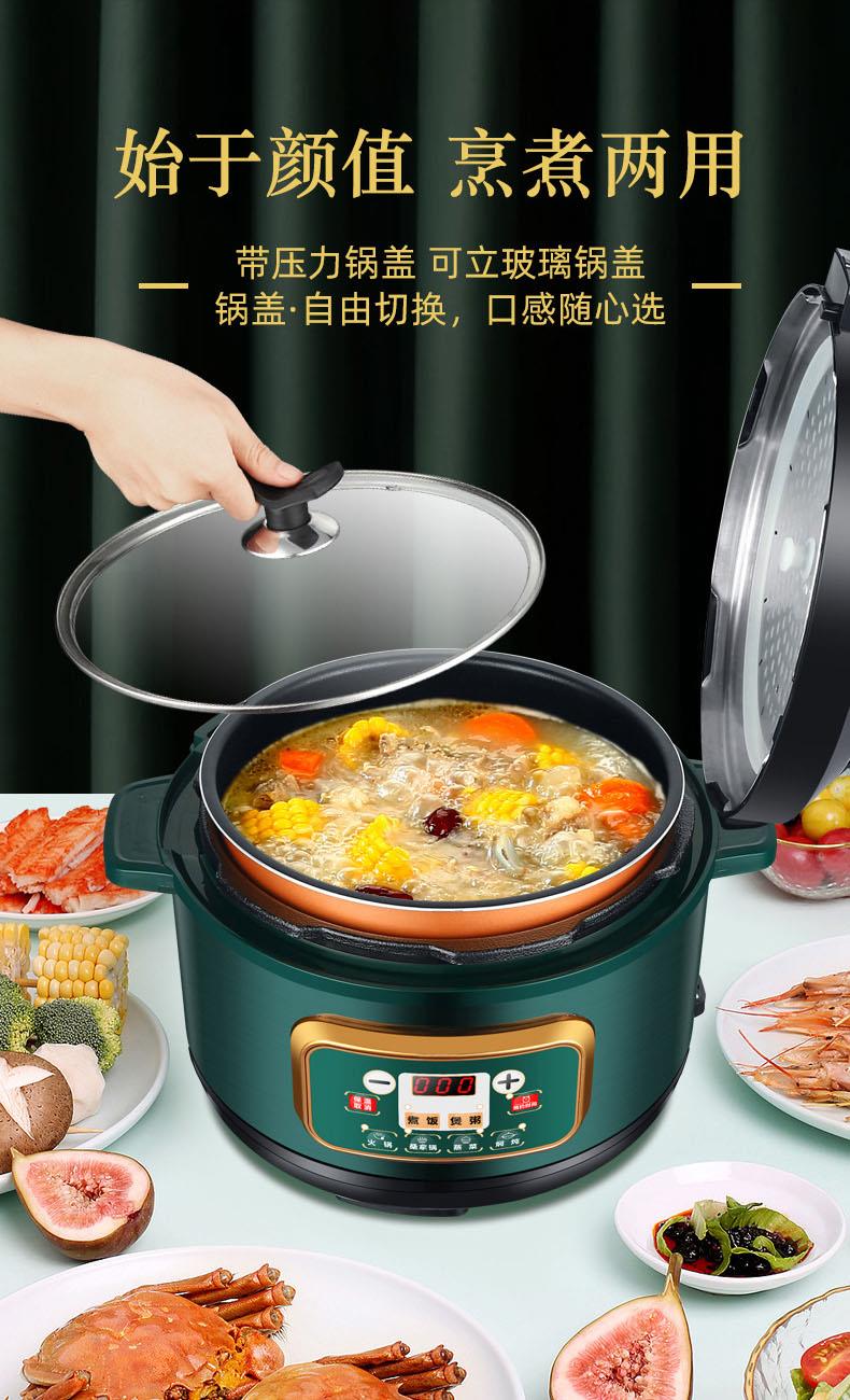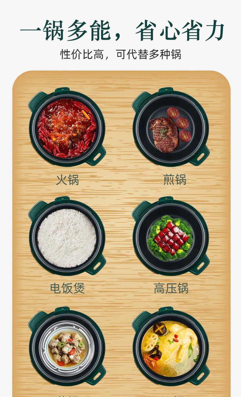 额定功率:1000W 加热方式:烤漆电热盘 额定频率:50HZ 内胆材质:黄晶内胆 额定电压:220V 额定容量:3L 预设菜单:6大预设功能 烹煮两用,带压力锅盖可立玻璃锅盖,锅盖自由切换,口感心选。煮煎炒炸焖锅。1000W速热底盘加热,可快速导热至整个热盘,实现均火效果受热更均匀。一锅双胆,蒸煮间隔内胆放置蒸格,即可蒸/煮同时进行,无隔间内胆,焖/煮/炖/火锅一锅搞定。五层加厚材质给健康增添煲。微电脑预设菜单,内设程序轻轻一按即启,两种烹煮模式,独特双重温控。内置营养烹煮程序,微电脑预约设计,预约时间档位长短可调控美味不过火候,一锅多能性价比高,可代替多种锅,10大安全保护贴心安全防护安心顺享美味。小巧机身一身技艺适合1-4人。放着不占地收纳起来也方便。