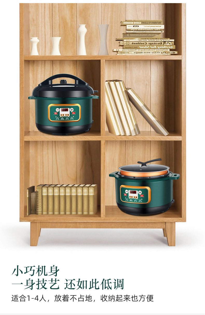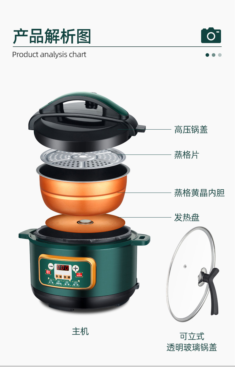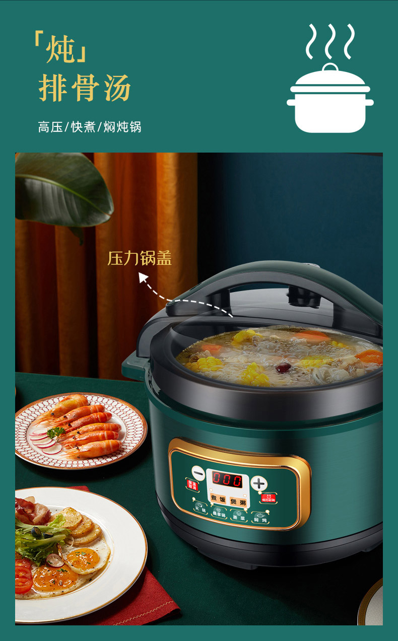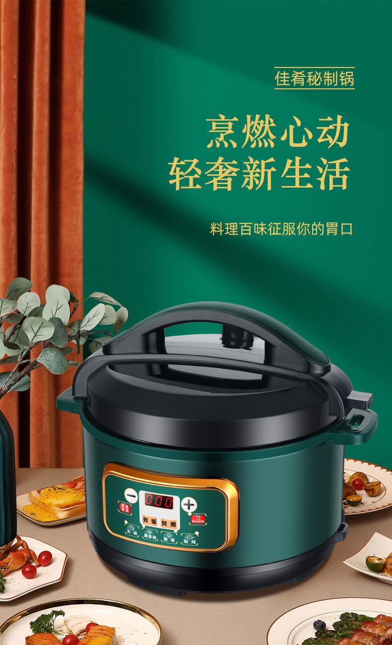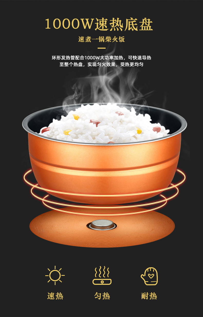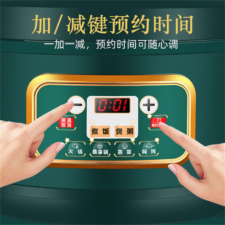 额定功率:1000W 加热方式:烤漆电热盘 额定频率:50HZ 内胆材质:黄晶内胆 额定电压:220V 额定容量:3L 预设菜单:6大预设功能 烹煮两用,带压力锅盖可立玻璃锅盖,锅盖自由切换,口感心选。煮煎炒炸焖锅。1000W速热底盘加热,可快速导热至整个热盘,实现均火效果受热更均匀。一锅双胆,蒸煮间隔内胆放置蒸格,即可蒸/煮同时进行,无隔间内胆,焖/煮/炖/火锅一锅搞定。五层加厚材质给健康增添煲。微电脑预设菜单,内设程序轻轻一按即启,两种烹煮模式,独特双重温控。内置营养烹煮程序,微电脑预约设计,预约时间档位长短可调控美味不过火候,一锅多能性价比高,可代替多种锅,10大安全保护贴心安全防护安心顺享美味。小巧机身一身技艺适合1-4人。放着不占地收纳起来也方便。