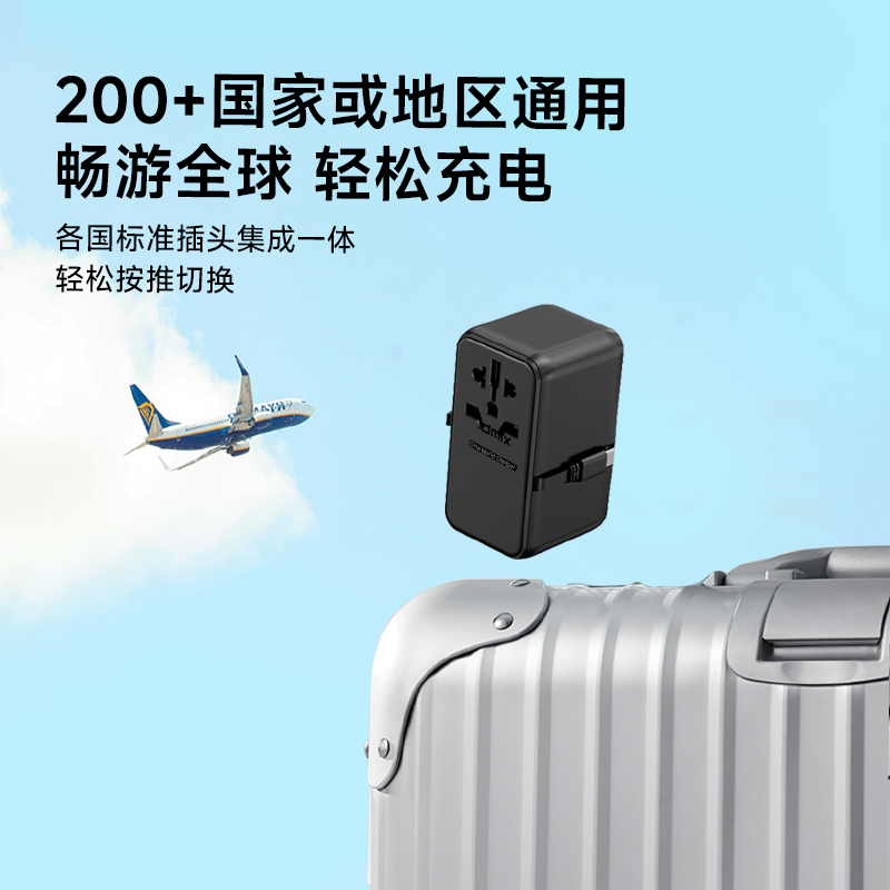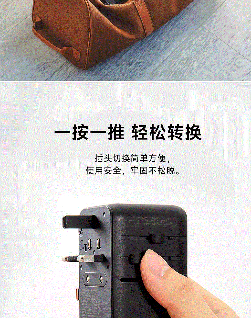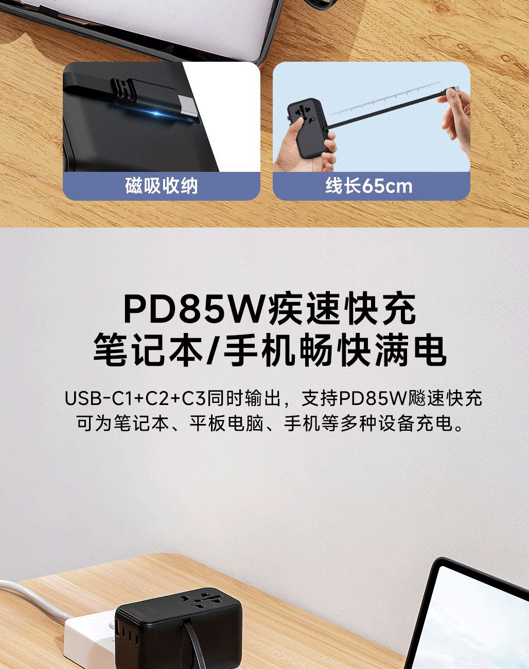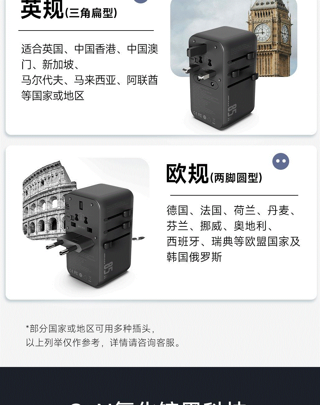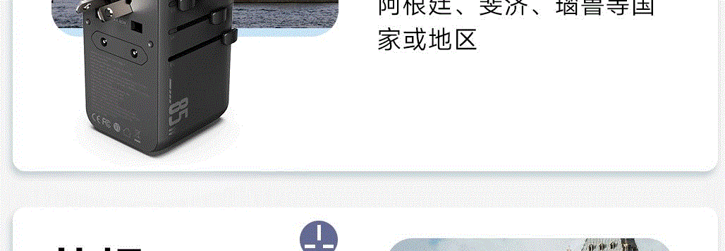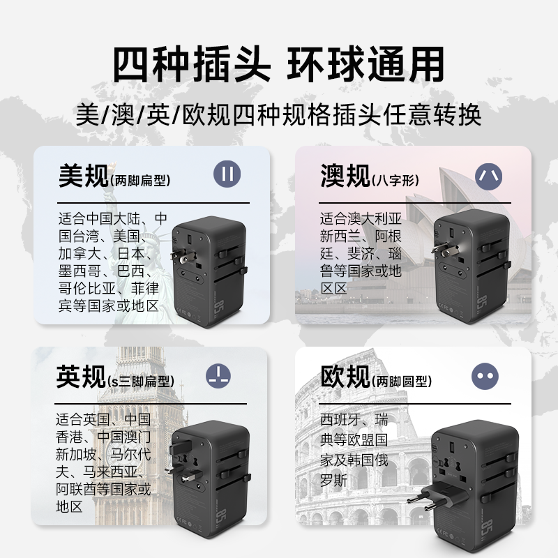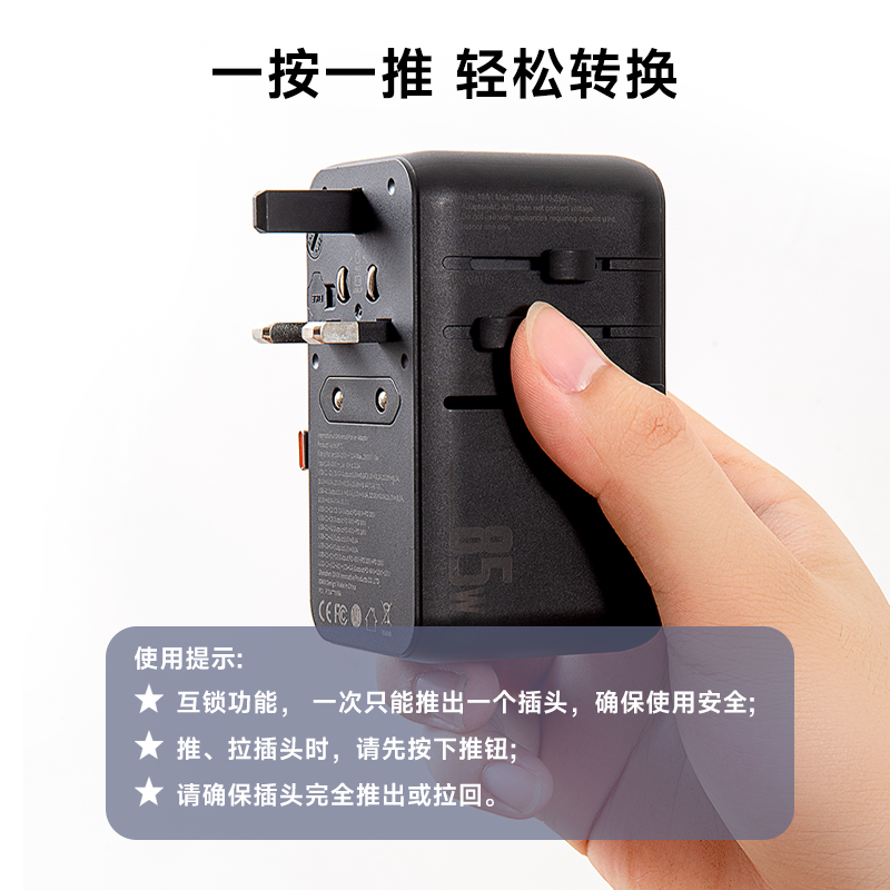 100V-250V宽电压设计,各国标准插头集成一体,轻松按推切换,三口85W快充 全球差旅充电一个就够