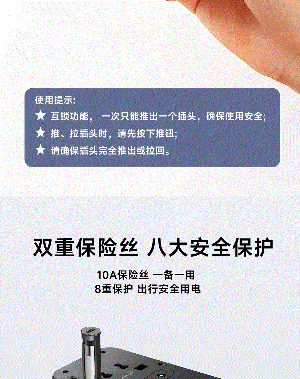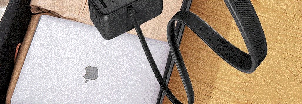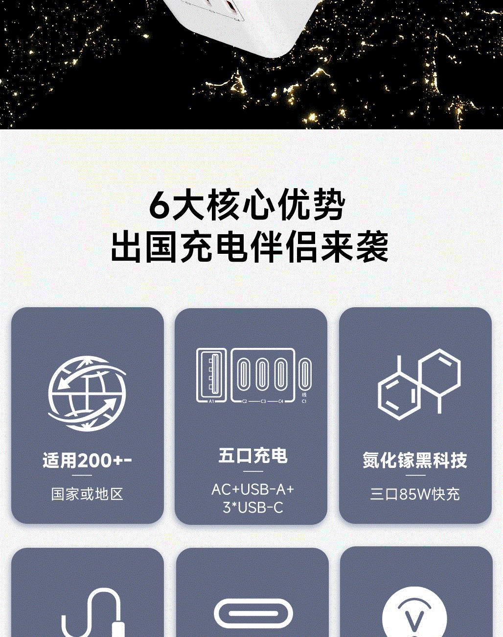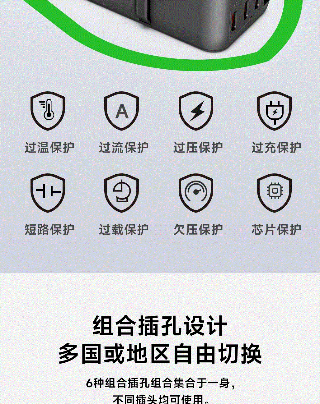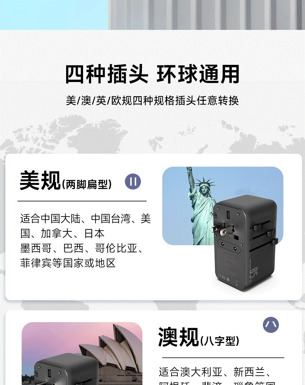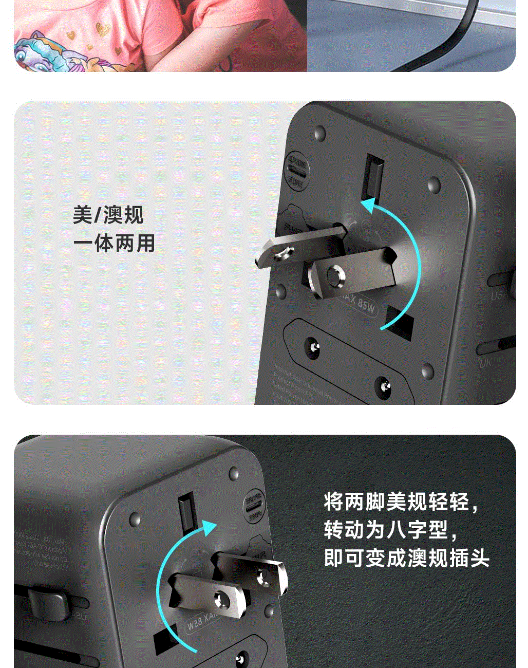 100V-250V宽电压设计,各国标准插头集成一体,轻松按推切换,三口85W快充 全球差旅充电一个就够
