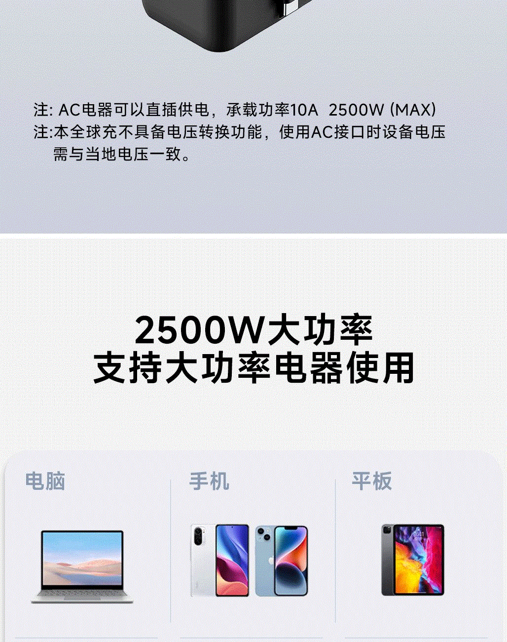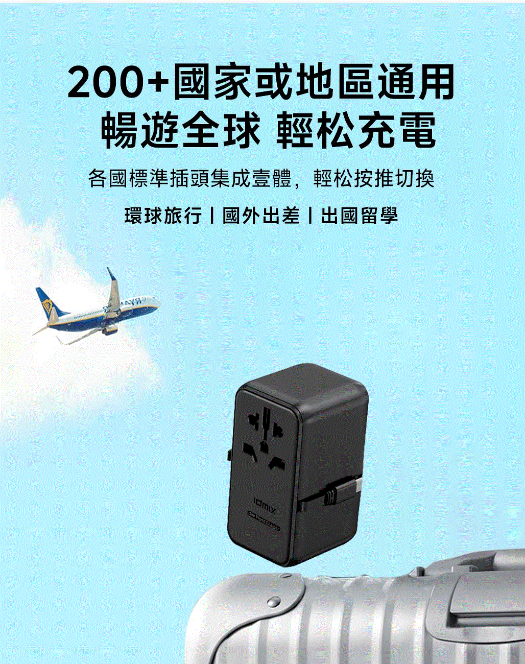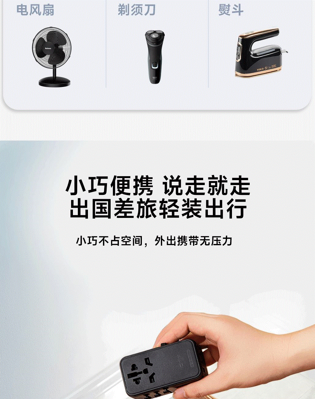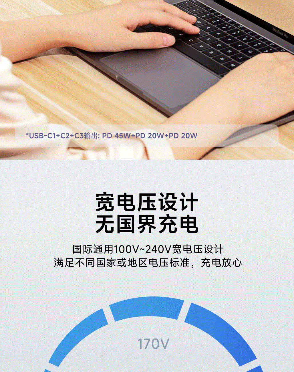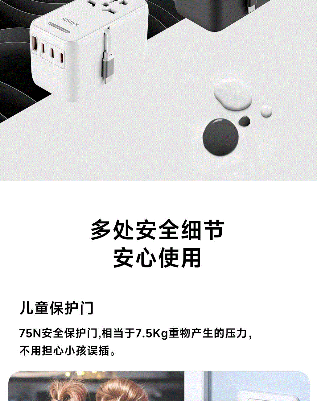 100V-250V宽电压设计,各国标准插头集成一体,轻松按推切换,三口85W快充 全球差旅充电一个就够