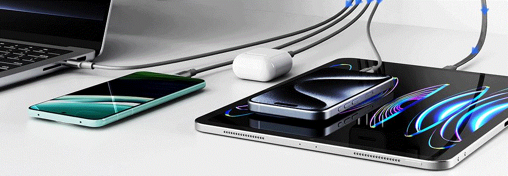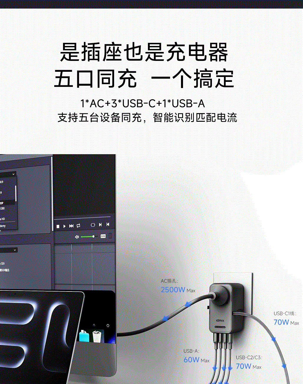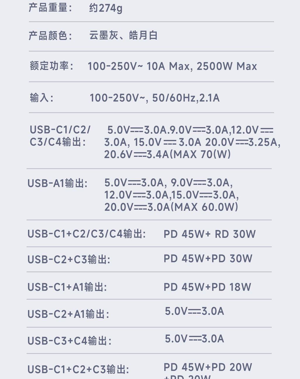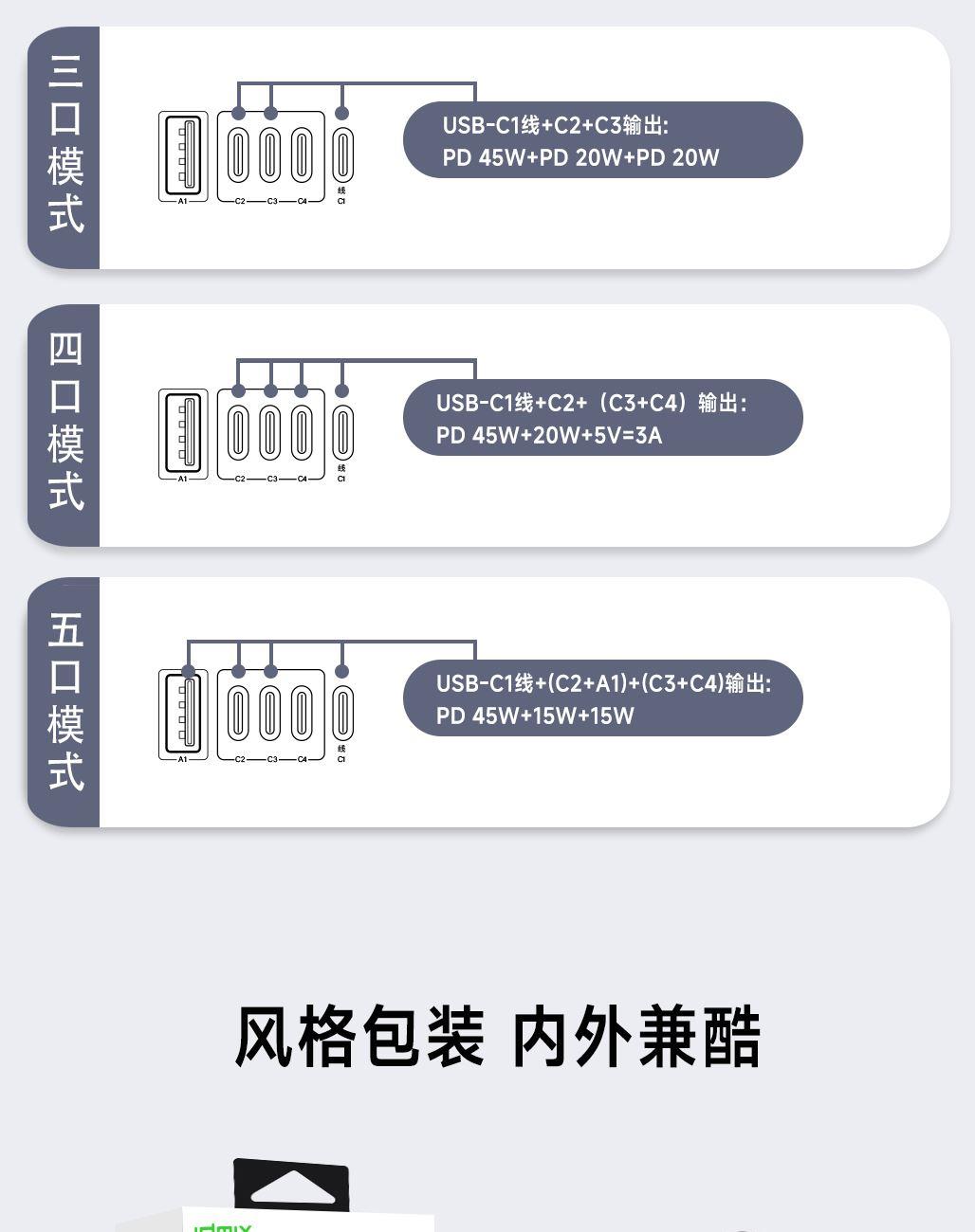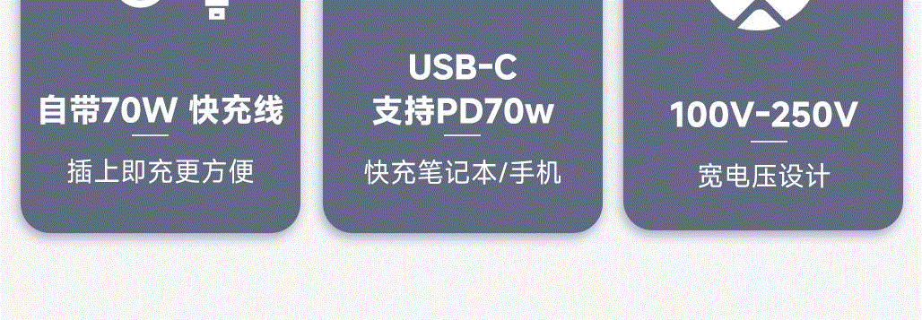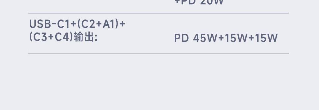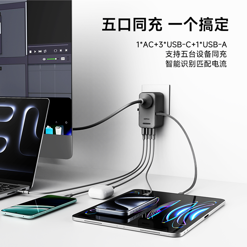 五口充电AC+USB-A+3*USB-C,USB-C支持PD70W,USB-C1+C2+C3同时输出,支持PD85W飚速快充,可为笔记本、平板电脑、手机等多种设备充电,多个设备同时充电,功率自动分配