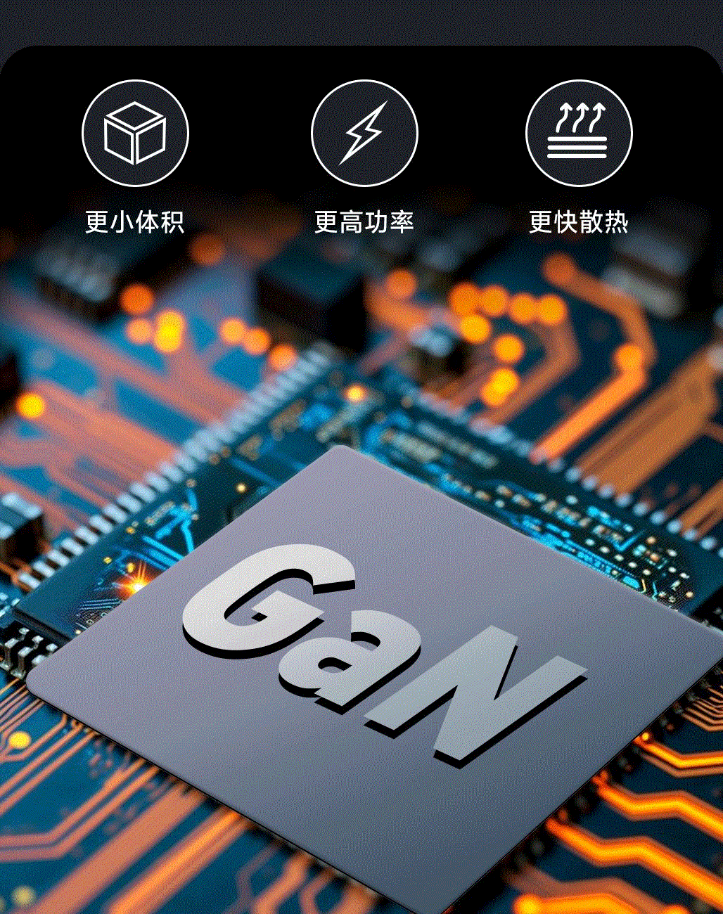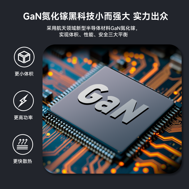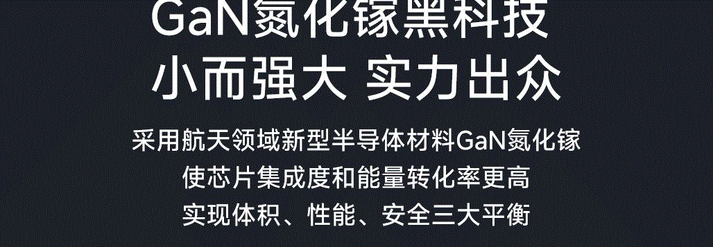 采用航天领域新型半导体材料GaN氮化镓,使芯片集成度和能量转化率更高,实现体积、性能、安全三大平衡