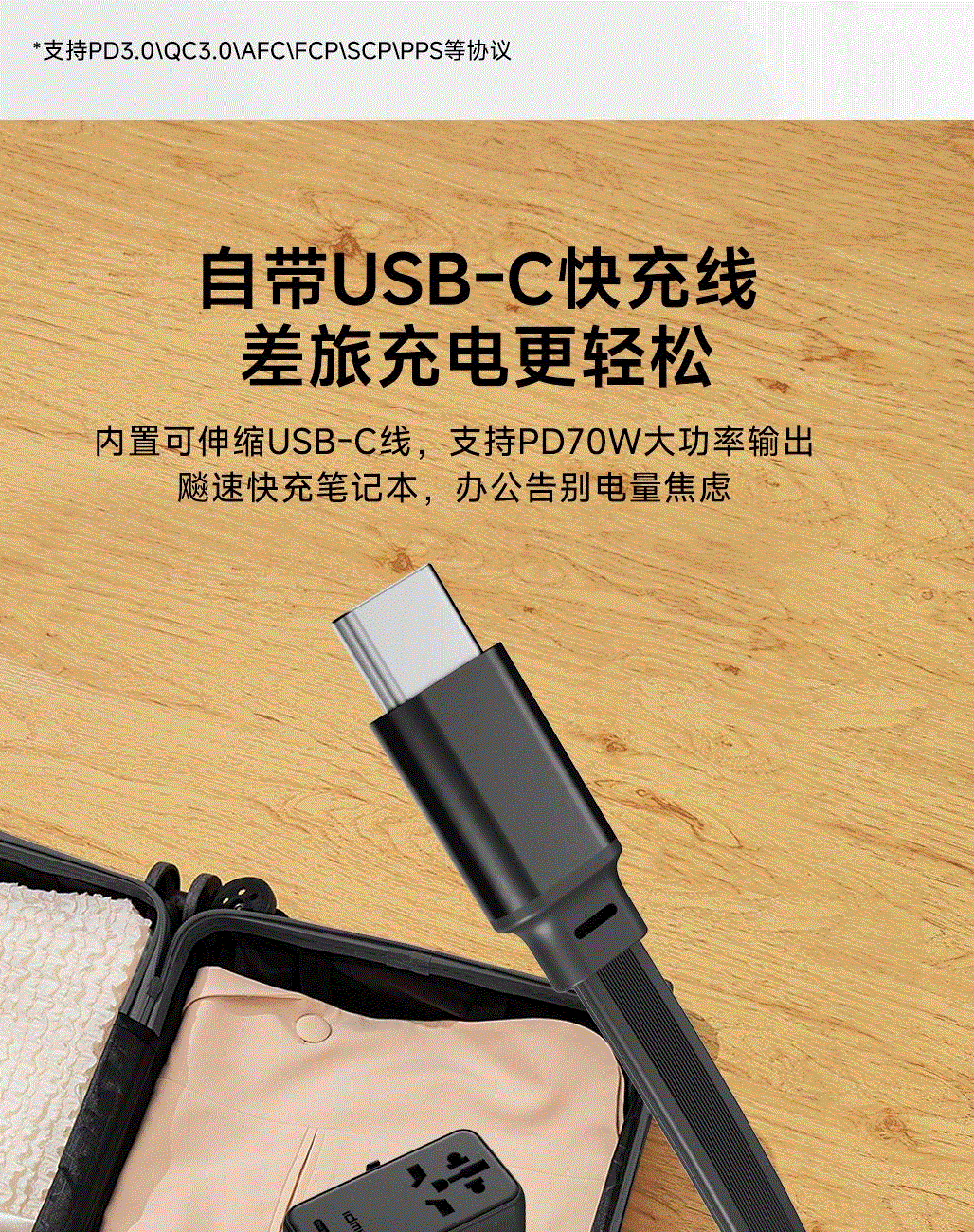 内置65cm可伸缩USB-C线,支持PD70W大功率输出,飚速快充笔记本,办公告别电量焦虑