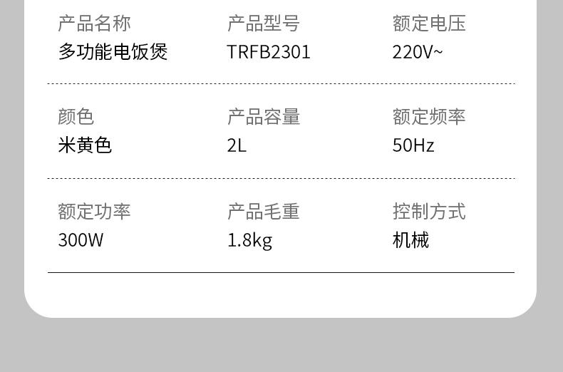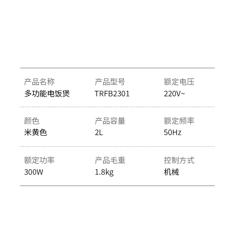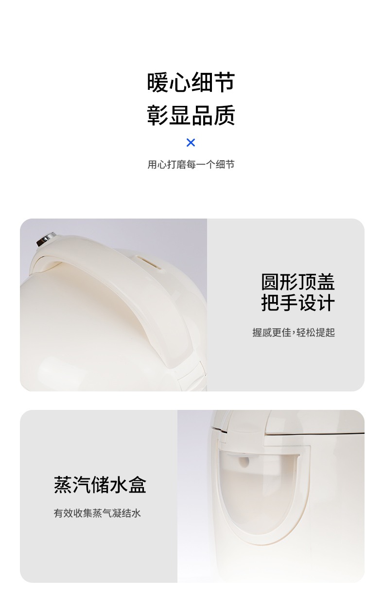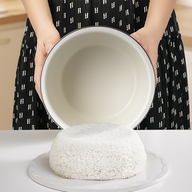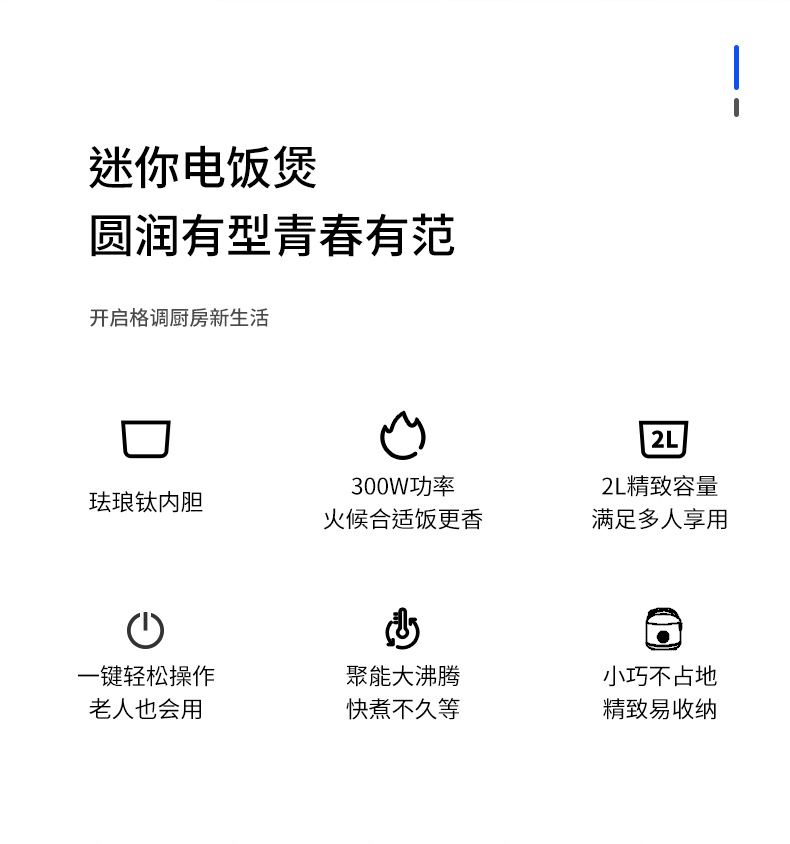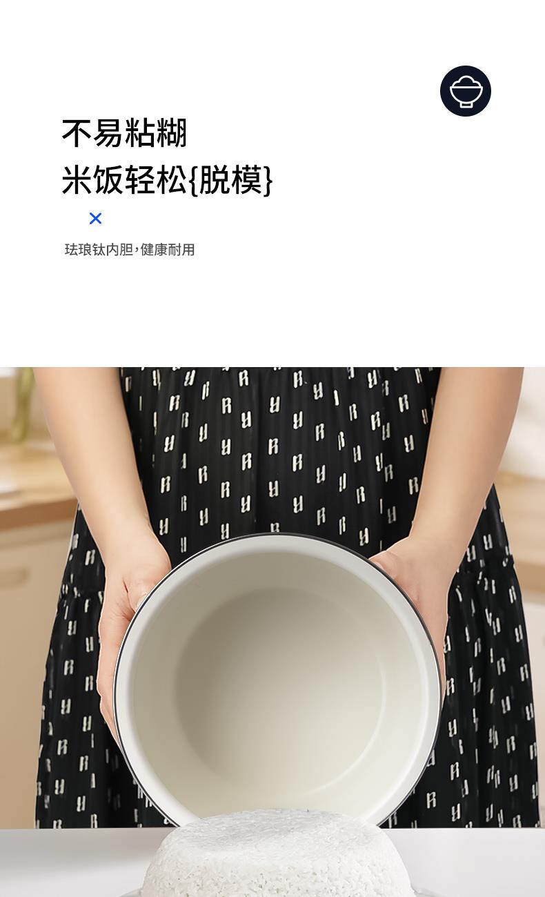 2L精致小巧容量,一杯米也能煮 珐琅钛内胆,不易粘锅,米饭轻松脱模 一键简单操作,父母轻松用 多功能小锅,煮饭煮粥炖汤样样精通