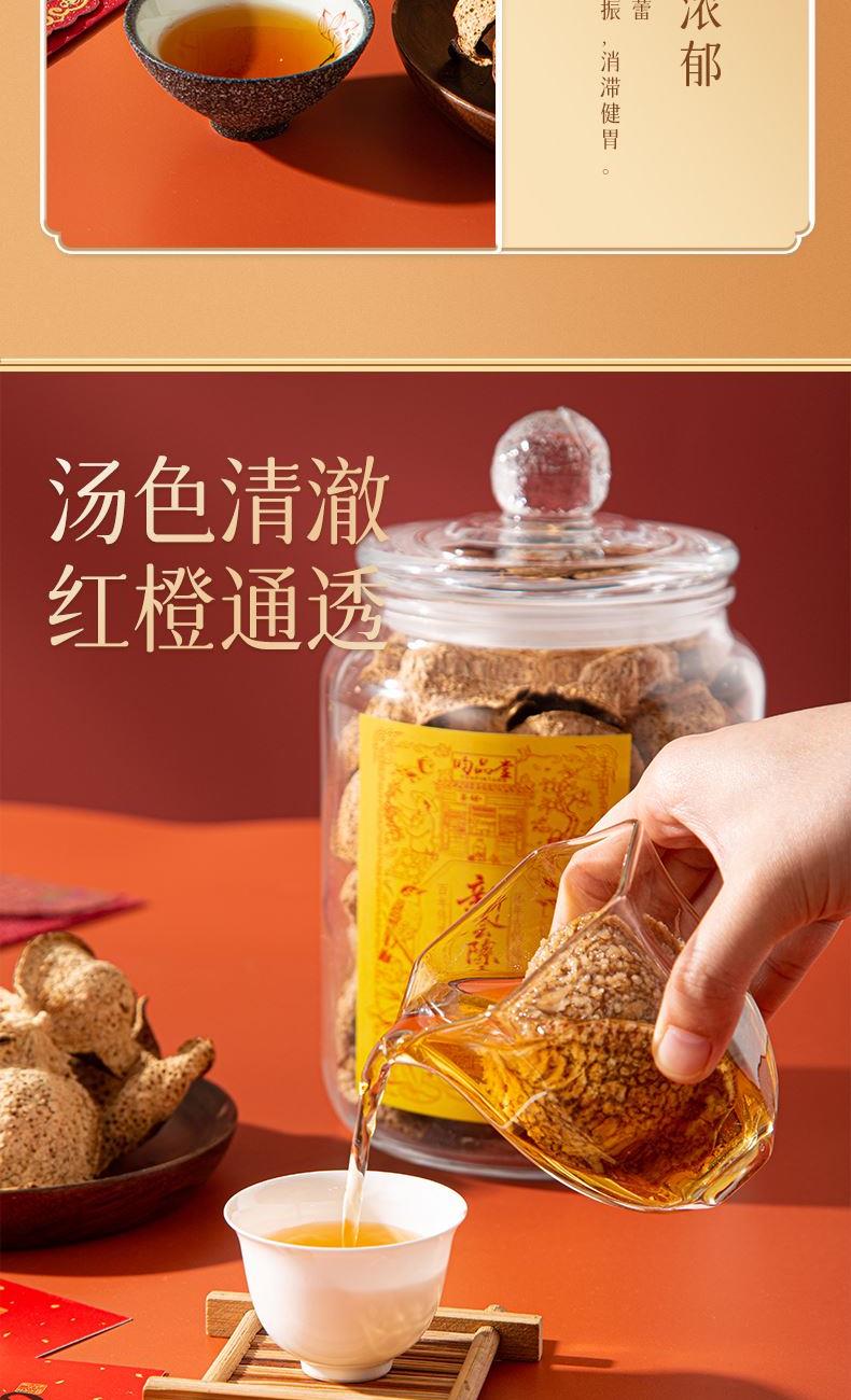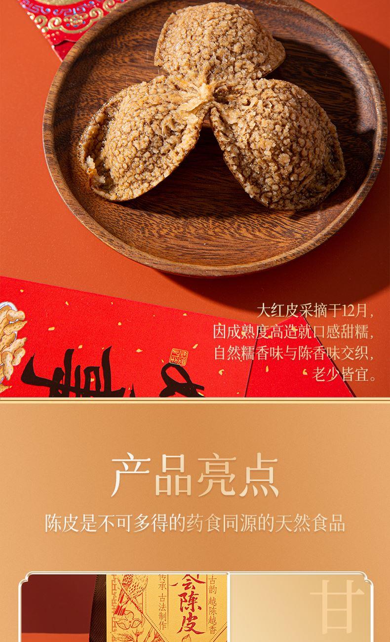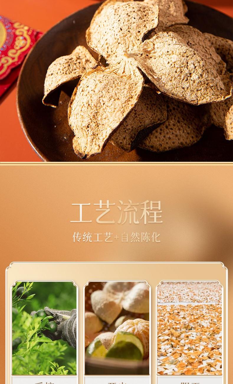 净含量:150g 毛重:1.85kg 产区:广东新会三江产区 原料:新会干仓大红皮 规格:单瓶 1.选用广东新会三江产区陈皮10年陈化原料 2.大红皮采摘于12月,因成熟度高造就口感甜糯,自然糯香味与陈香味交织,老少皆宜。 3.新会陈皮味辛性温,甘香醇陈,油包粒大,油室饱满,芳香浓郁,具有唤醒味蕾,改善食欲不振,消滞健胃。 4.新会陈皮不仅能单独泡茶,还可以用来与其他茶叶搭配冲泡,白茶,红茶,普洱等。
