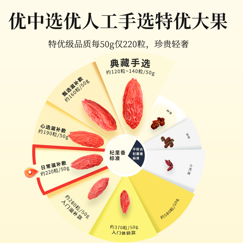 品 牌:杞里香 质量等级:特优(约220粒/50g) 产地:宁夏银川 品 名:头茬枸杞 净含量:300g(15罐) 配料:头茬枸杞 保质期:12个月 贮藏方法:请置于阴凉干燥处密封保存