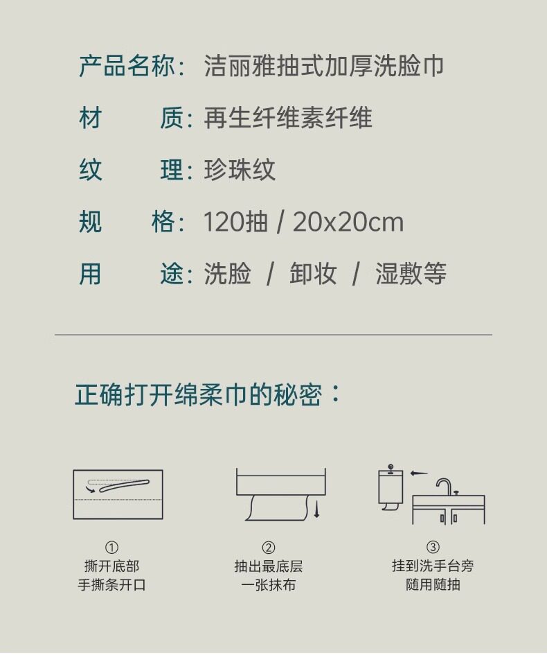 组 合:1包(opp袋包装) 型 号:MRJ790 材 质:再生纤维素纤维 规 格:20*20cm/120抽 克 数:480 等 级:合格品