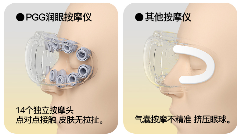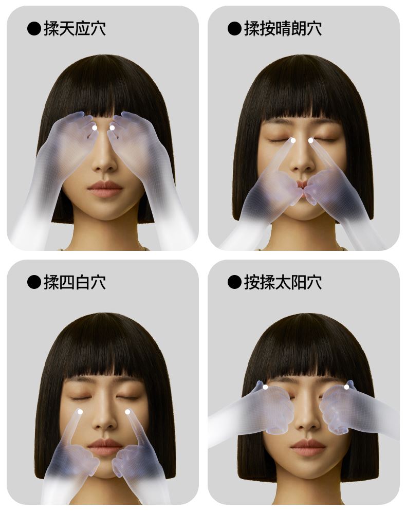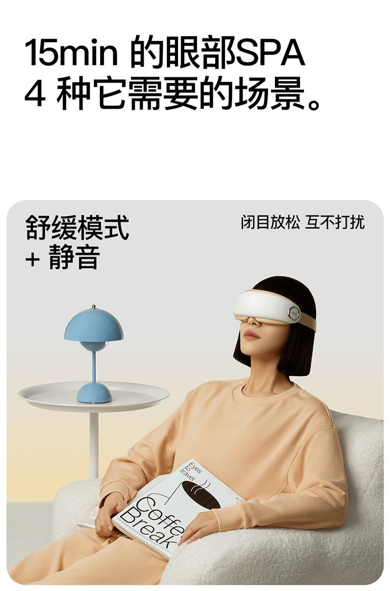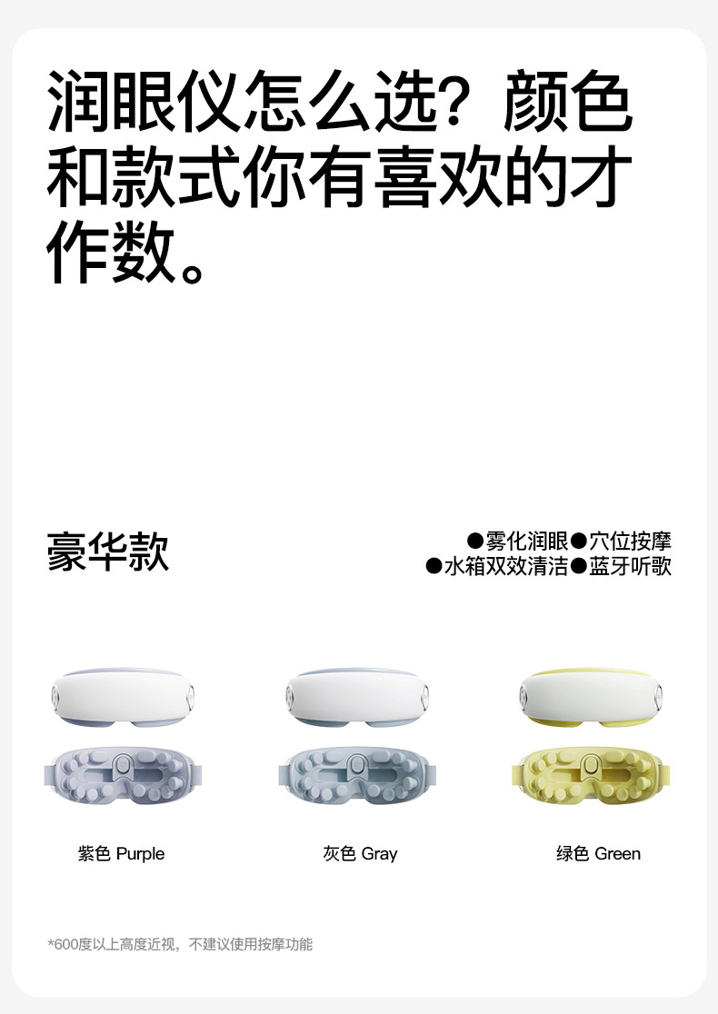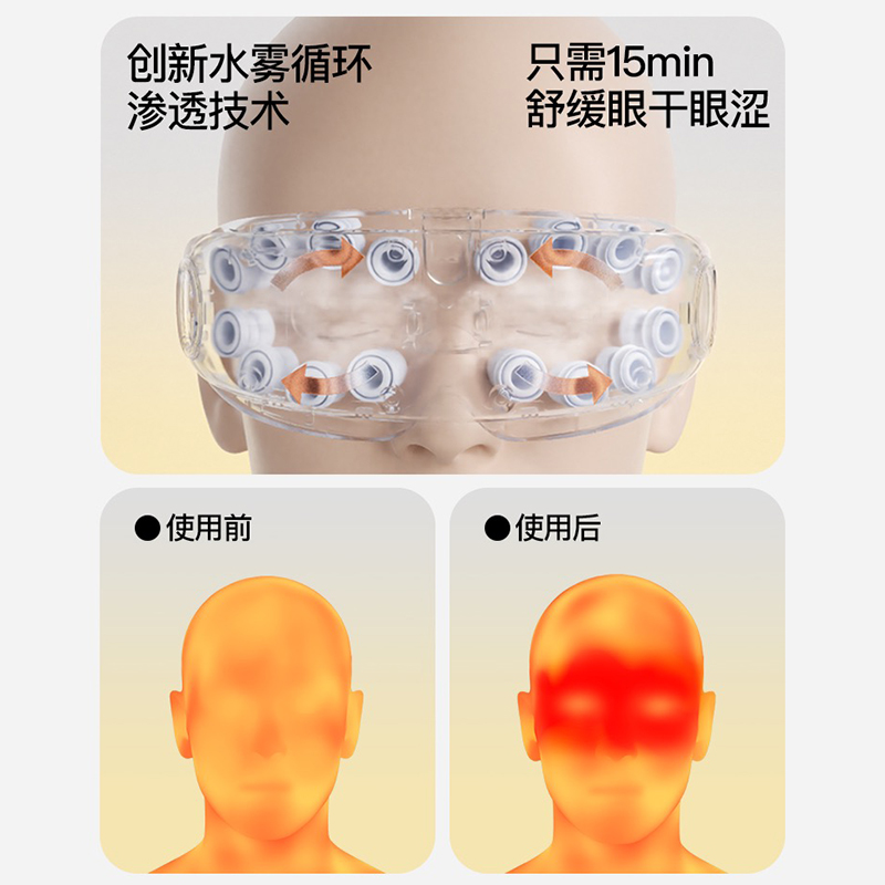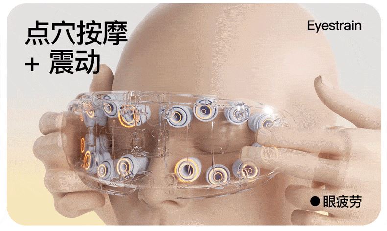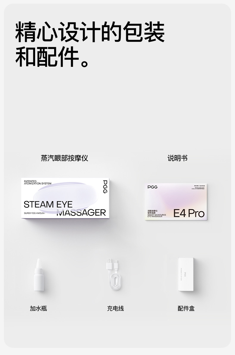 ● 产品型号:E4pro ● 产品尺寸: 183*77*81mm ● 产品材质:ABS/PC/ 硅胶/布 带 ● 电池容量: 1800mAh ● 水箱容量: 6.5ml ● 3小时 ● 90-120分钟(档位大小喷雾时长而定) 产品卖点: • 采用超声微米雾化技术 ,每秒喷出10万个水分子, 瞬间包裹眼周围,给眼干眼涩直接补水。 •14个点对穴的按摩头,模拟真人指压按摩,加上3D镂空无压贴设计,佩戴不挑无感脸型不压眼球。 •38-45°C蒸汽热敷,通过上下眼周发热让热力覆盖到全眼, 减轻疲劳,快速舒缓眼干、 眼涩眼疲劳;眼上热敷眼眶,眼下热敷眼袋,解决眼肿眼胀,解决眼干眼涩,放松。 适用人群:长期用眼、戴隐形/美瞳、近视、加班一族、学生党、考研党、游戏屏幕眼、长途开车。 适用场景:公司午休,出差旅行,晚上躺床、节日送礼。