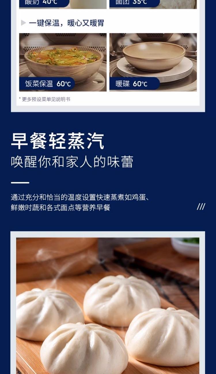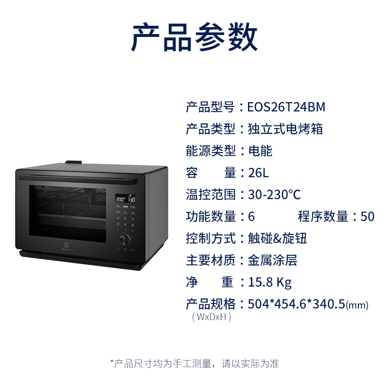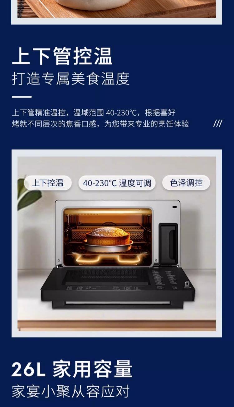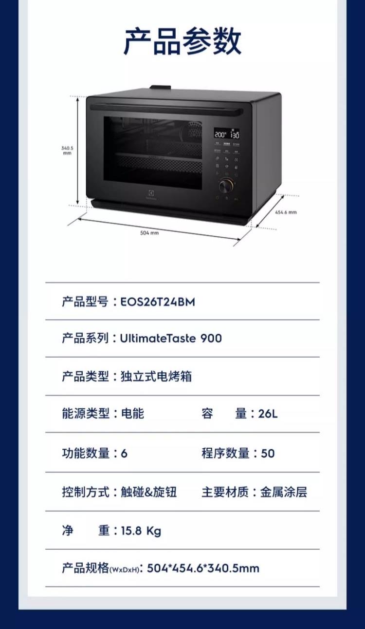 额定电压:220V 额定功率:50Hz 额定功率:1500W 产品容量:26L 功能数量:6 程序数量:50 内胆材质:不锈钢 产品尺寸:504*454*340mm 产品净重:15.8kg 主要材质:金属涂层 控制方式:触碰&旋钮 开门方式:下拉式开门 玻璃材质:三层隔热玻璃,中层LOW-E玻璃 腔体材质:304不锈钢 蒸发模式:蒸发盘加热 蒸汽系统|热风蒸烤|焗烤功能|早餐清蒸汽|蒸汽自清洁|童锁功能|26L