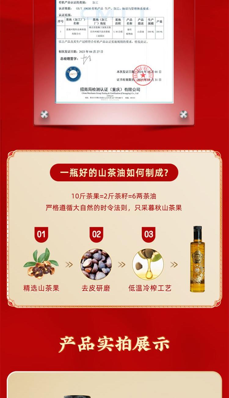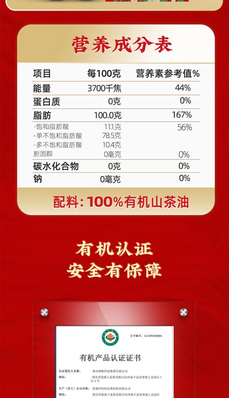1、纯正有机,物理压榨,世界硒都,恩施原产; 2、脂肪酸黄金配比1:8:1,符合欧米伽膳食食用油标准; 3、不饱和脂肪酸含量为88.9%,居所列食用油首位; 4、高烟点,少油烟。