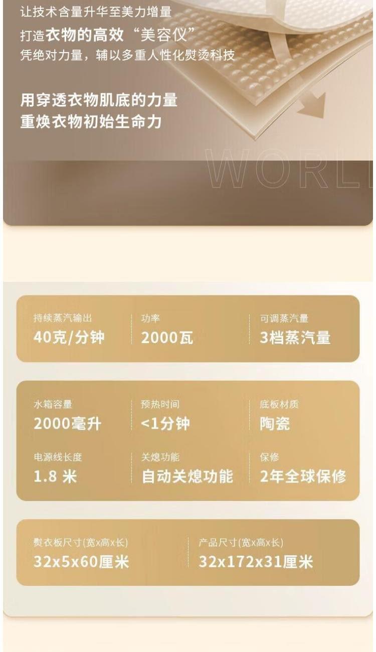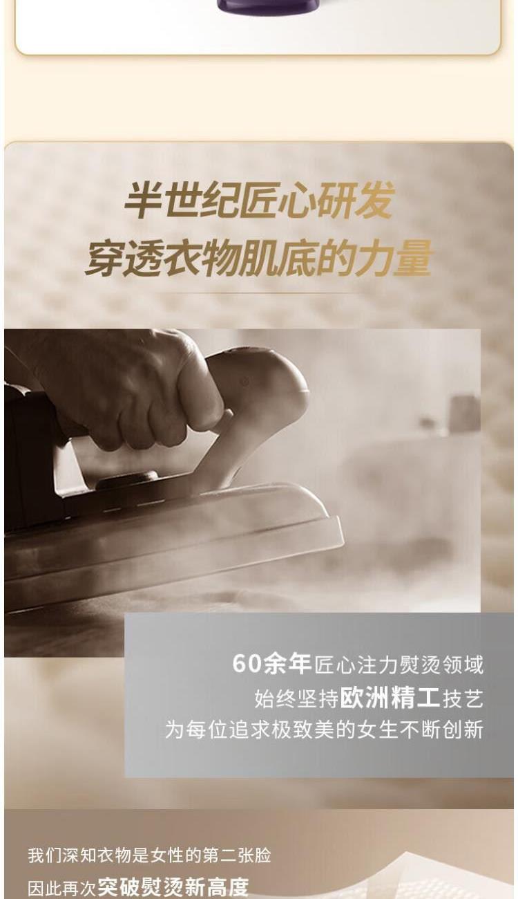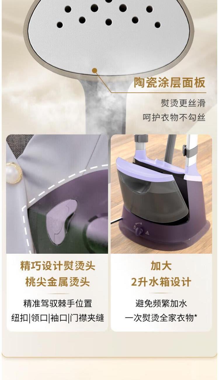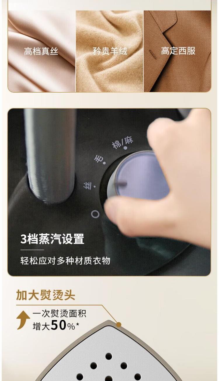 1、40克/分钟持续蒸汽,高效除皱,60s快速预热 2、4大专业熨烫技术 3、灵动加大挂熨烫板,竖直挂烫、倾斜熨烫,两种角度灵活慰烫 4、不同衣料专属呵护 5、3档蒸汽设置 6、加大熨烫头 7、陶瓷涂层面板 8、精巧设计慰烫头桃尖金属烫头 9、加大2升水箱设计