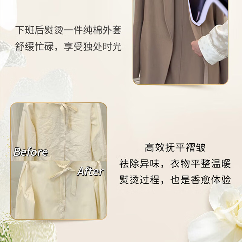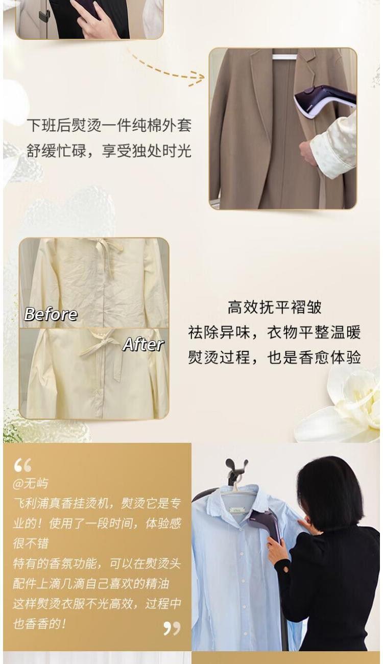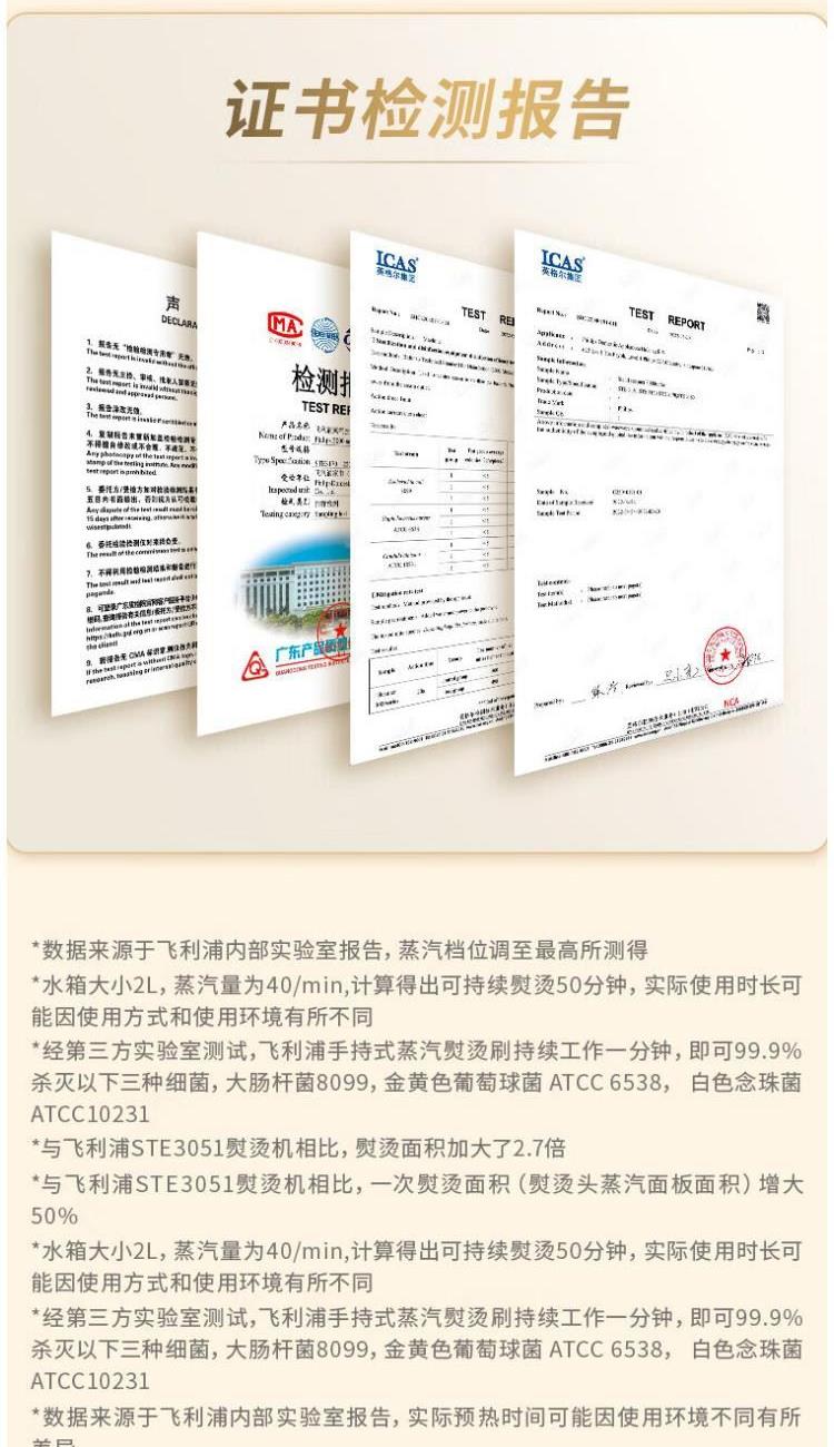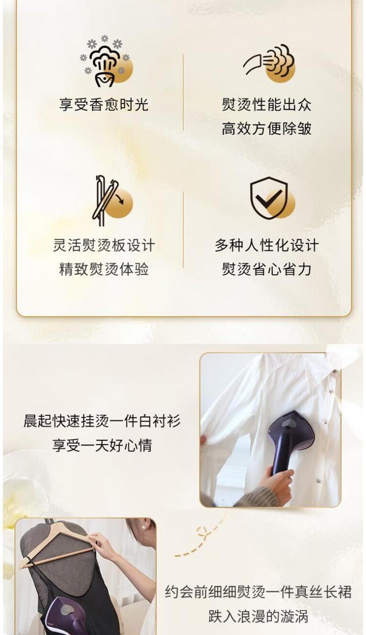 1、40克/分钟持续蒸汽,高效除皱,60s快速预热 2、4大专业熨烫技术 3、灵动加大挂熨烫板,竖直挂烫、倾斜熨烫,两种角度灵活慰烫 4、不同衣料专属呵护 5、3档蒸汽设置 6、加大熨烫头 7、陶瓷涂层面板 8、精巧设计慰烫头桃尖金属烫头 9、加大2升水箱设计