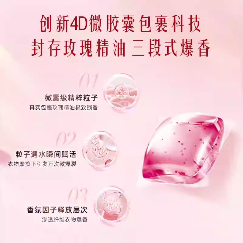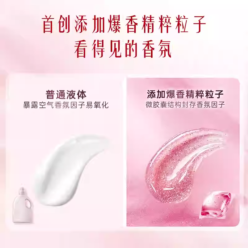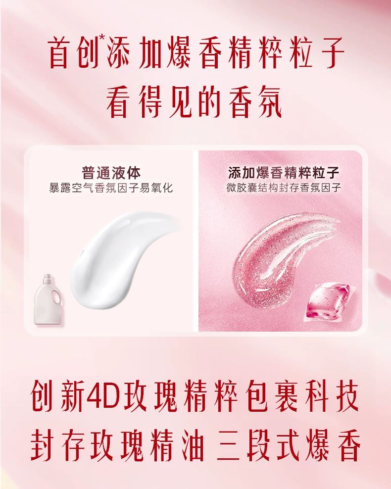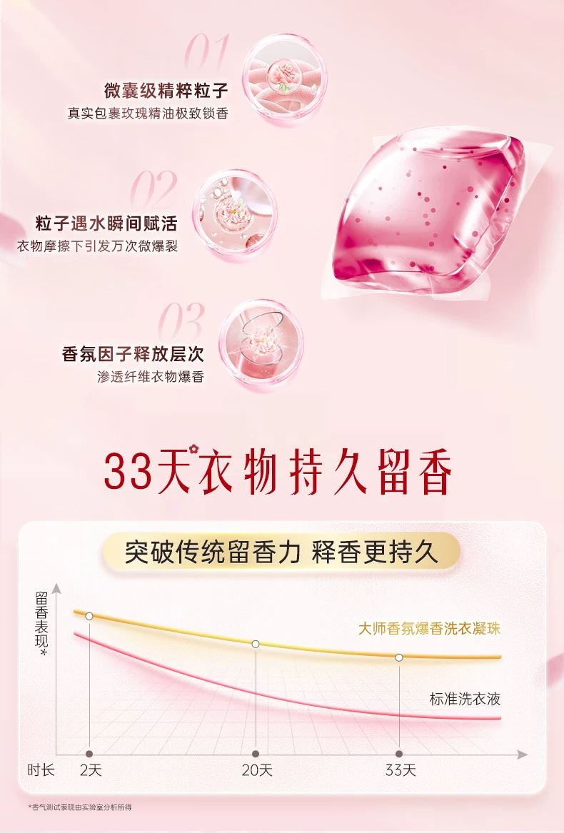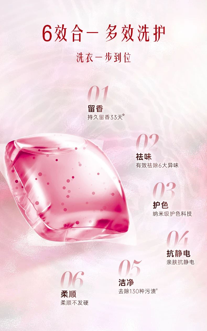 保质期限:3年 产品成分: 表面活性剂(含椰子油精华、橄榄油精华)、助剂(含稳定剂、污垢分散剂)、酶制剂(天然酵素)、香精、着色剂、爆香精粹粒子、柔顺因子 产品功效: 6效合1:33天留香、12倍浓缩更洁净、6大异味祛除、纳米级护色科技、亲肤抗静电、柔顺不发硬;15分钟快洗无残留
