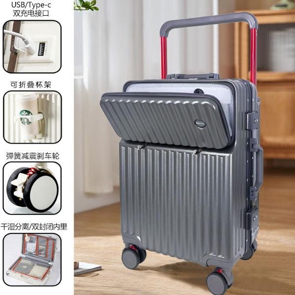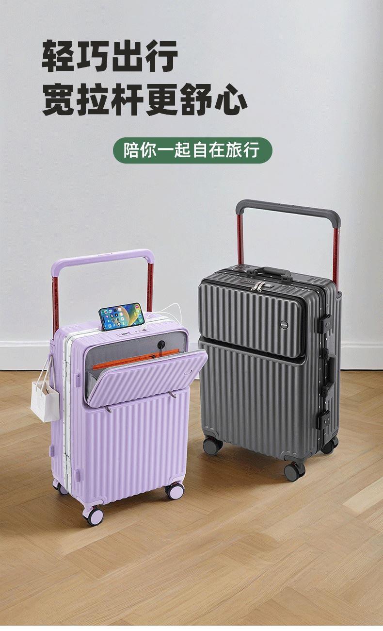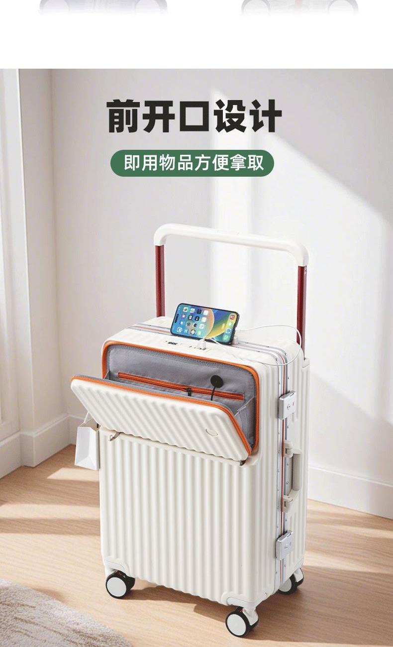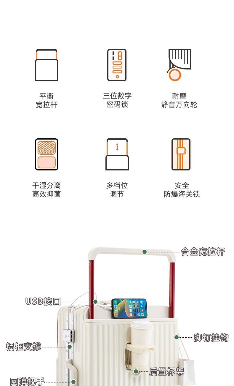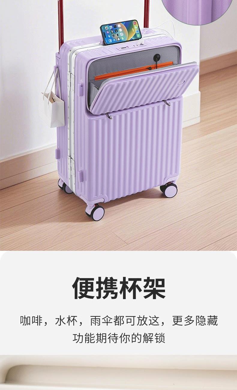 箱壳采用三层复合材料,坚固强韧受到冲击可有效回弹,合金宽拉杆,受力均匀省力又稳固,后置拉杆更省空间,箱内空间使用率更高;前置开口设计,即用物品方便拿取,后置可折叠便携杯架,咖啡、水杯、雨伞都可放这,侧边实用挂钩,更多隐藏功能期待你的解锁,轻音万向轮,采用高弹性TPE轮皮,畅滑省力,多路面行走不卡顿、不费劲,旅途优雅不打扰;嵌入式密码锁,安全出行有保障,大容量双封闭内衬,分区收纳更合理,轻松出行无负担~