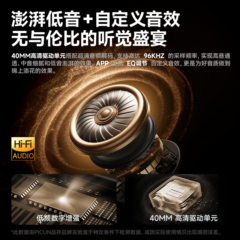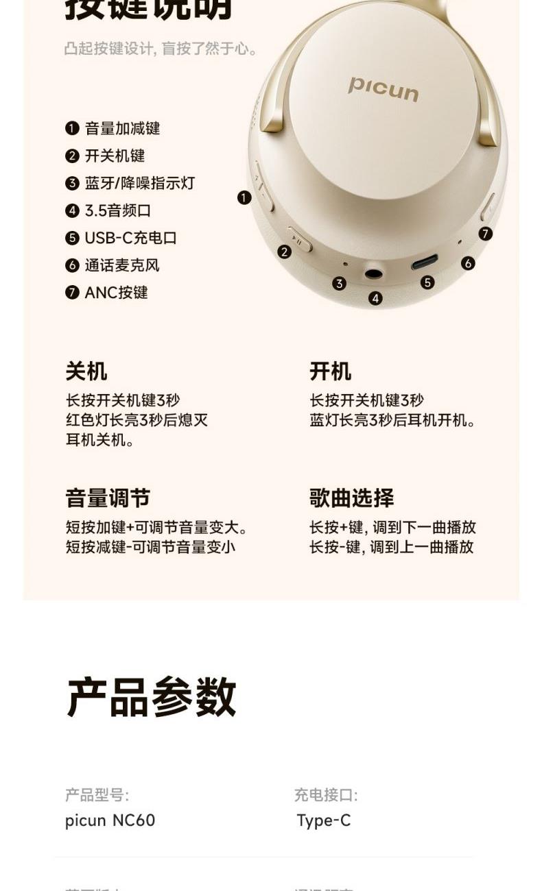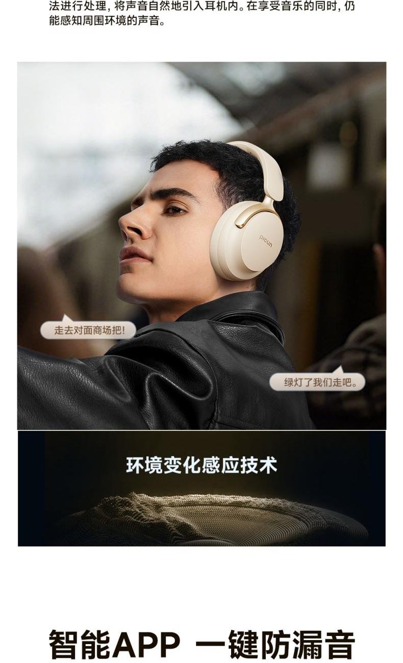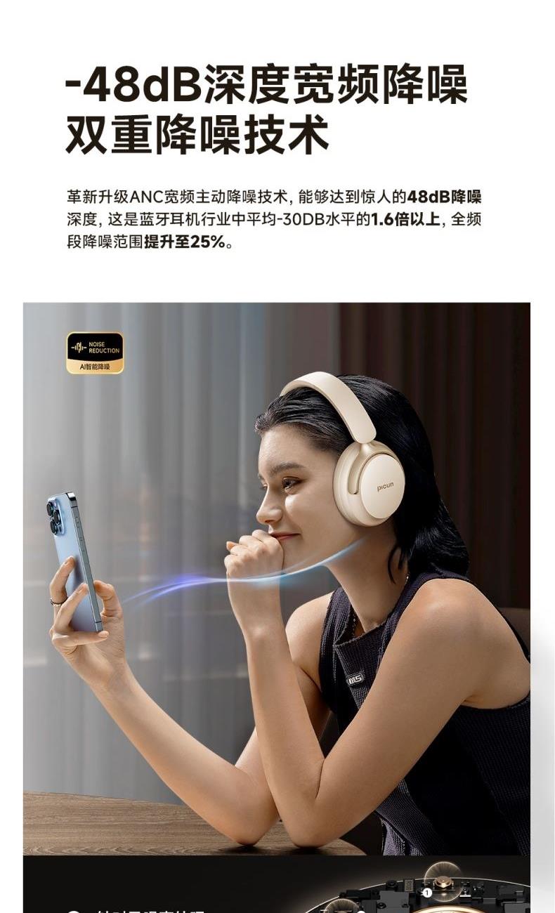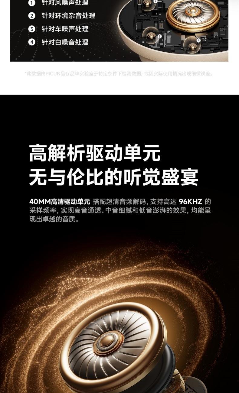 颜色:墨黑色、湖蓝色、卡其白 连接模式:插音频线、蓝牙 蓝牙方案:AC7018 降噪深度:-35dB 蓝牙版本:V5.4 接受距离:10m 频响范围:20HZ-20KHZ 使用时间(70%音量): 100小时, 开启降噪80小时 电池容量:1000mAh 充电时间:3H 喇叭尺寸:40mm 喇叭灵敏度:121±3dB 充电接口:type-c 1、支持【picun品存】APP智能互联控制 2、4麦阵列先进混馈降噪技术, 降噪深度达38DB 3、千元HIFI无损音质 大师级调教+自定义音效+空间音频 4、1000毫安大容量电池,可支持100小时续航