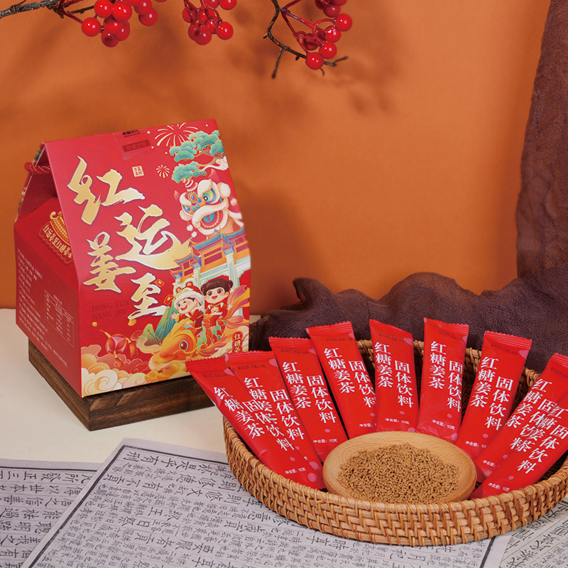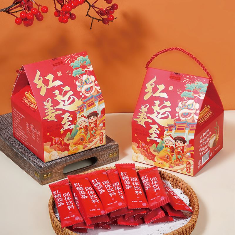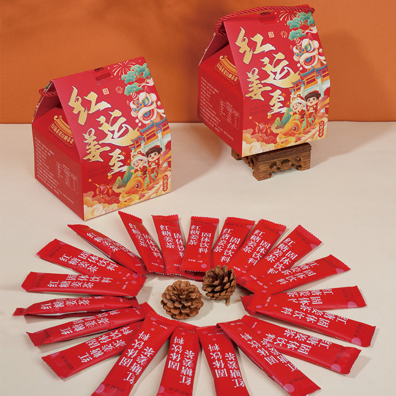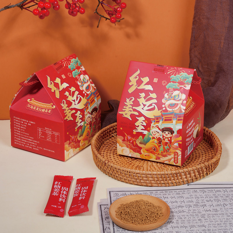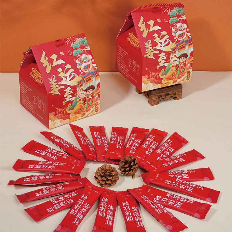 礼盒规格:130*170*130mm 产品配置:红糖姜茶10g*20条 推荐理由: 1、特色三角礼盒,国潮喜庆风格,鸿运将至好寓意。 2、忙碌的生活,繁重的压力,寒凉的身体,焦虑的心情,都需要一杯暖暖的热饮来舒缓。 3、红糖姜茶,暖身更暖心,给客户更多的温暖与陪伴。 4、只需10秒,一冲一拌,一杯暖暖的姜茶即刻呈现,品的是甘甜,喝的是温暖,享的是健康,送的是陪伴!