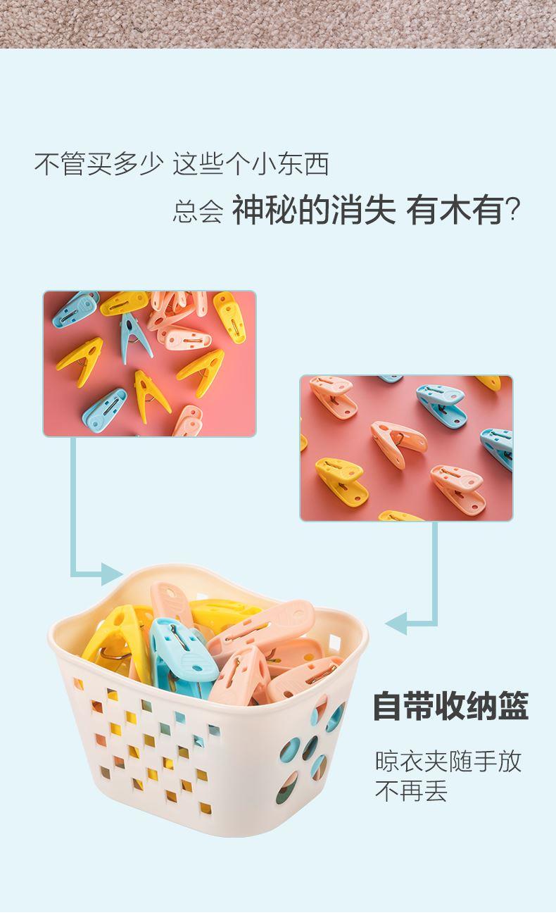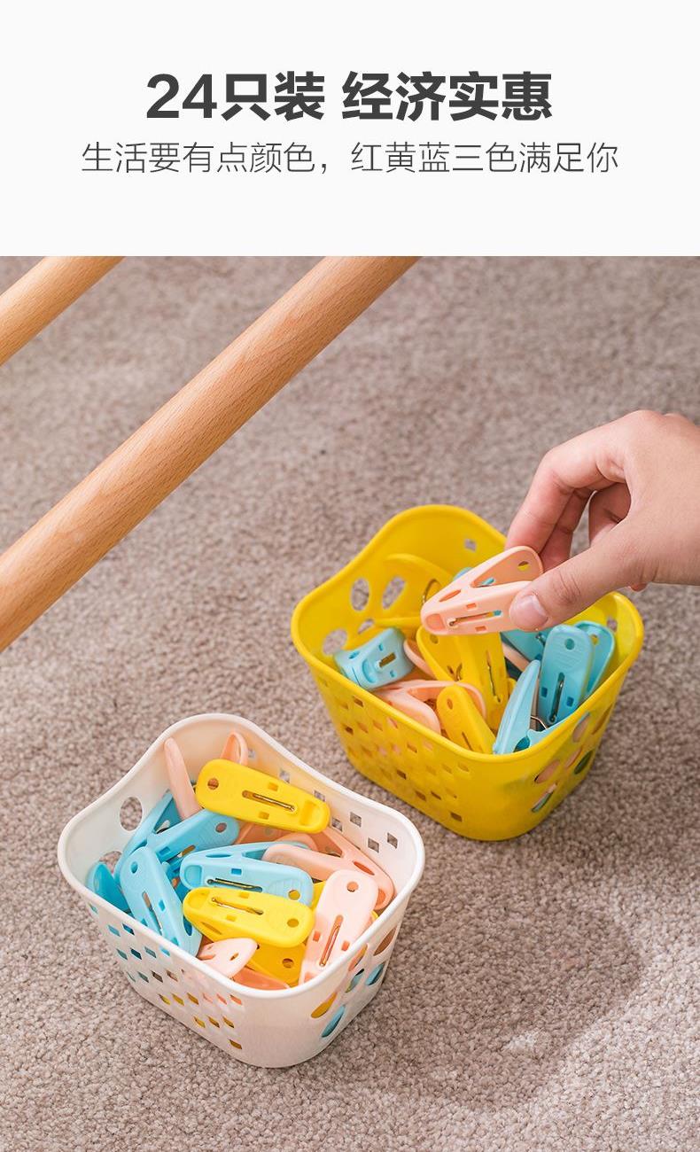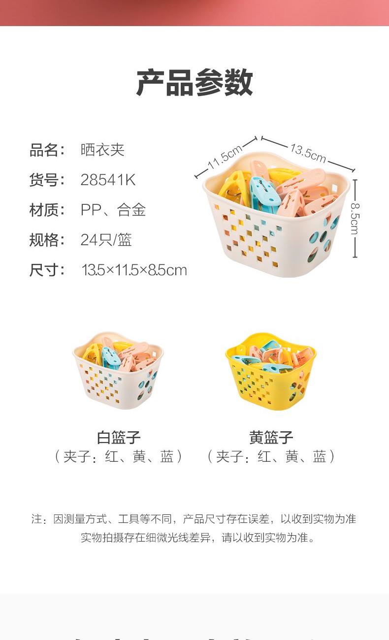 产品货号:28541K 产品尺寸:13.5*11.5*8.5CM 产品材质:PP,ALLOY 产品克重:196.7g 外箱尺寸:35.5*29*45.5CM 包装方式:1SET/Shrink Film 产品颜色:红色、蓝色、黄色 锯齿夹口、有效承重 PP材质、色彩丰富、带收纳篮 把手自带纹理,防止打滑 加粗金属弹簧,高弹金属强劲有力不生锈 篮身篮底镂空设计,沥水透气