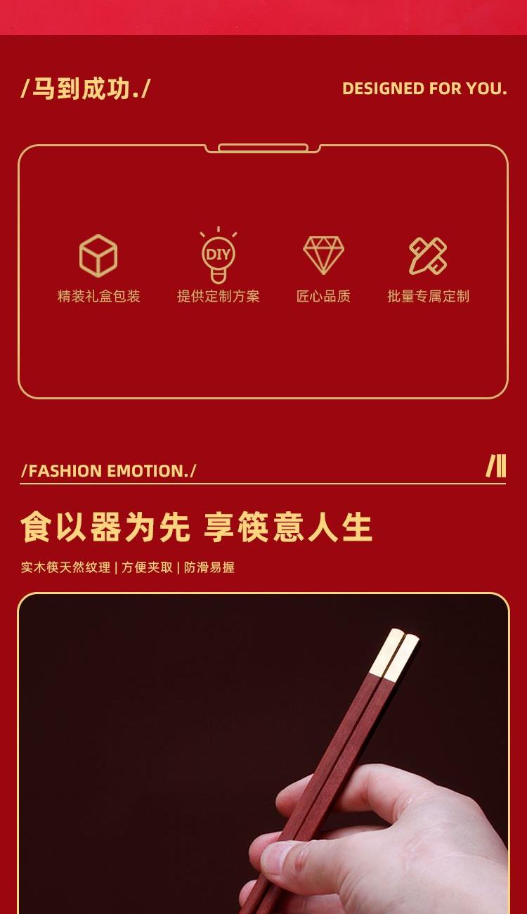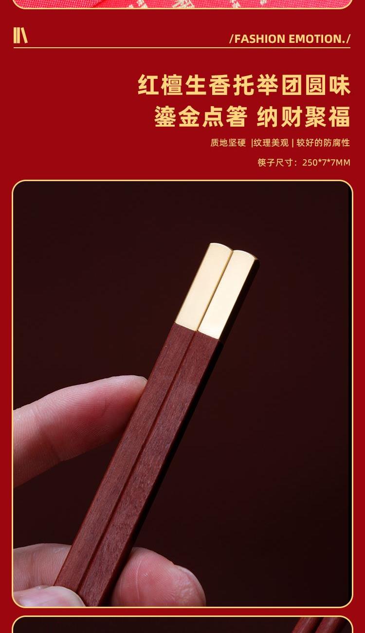 配置 红檀木筷x10 材质 黄铜镀真金 红檀木 尺寸 鸡翅木筷 250*7*7mm 包装 278*278*52mm 私人专属红木筷 生日赠送 / 会议活动礼赠 私人随手礼/企业拜访答谢礼 私人专属定制更显用心