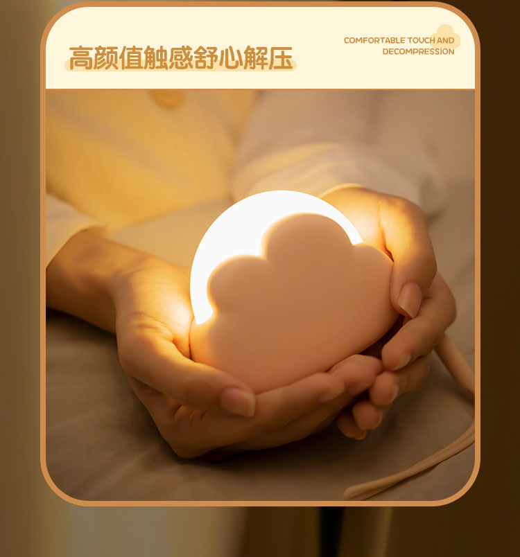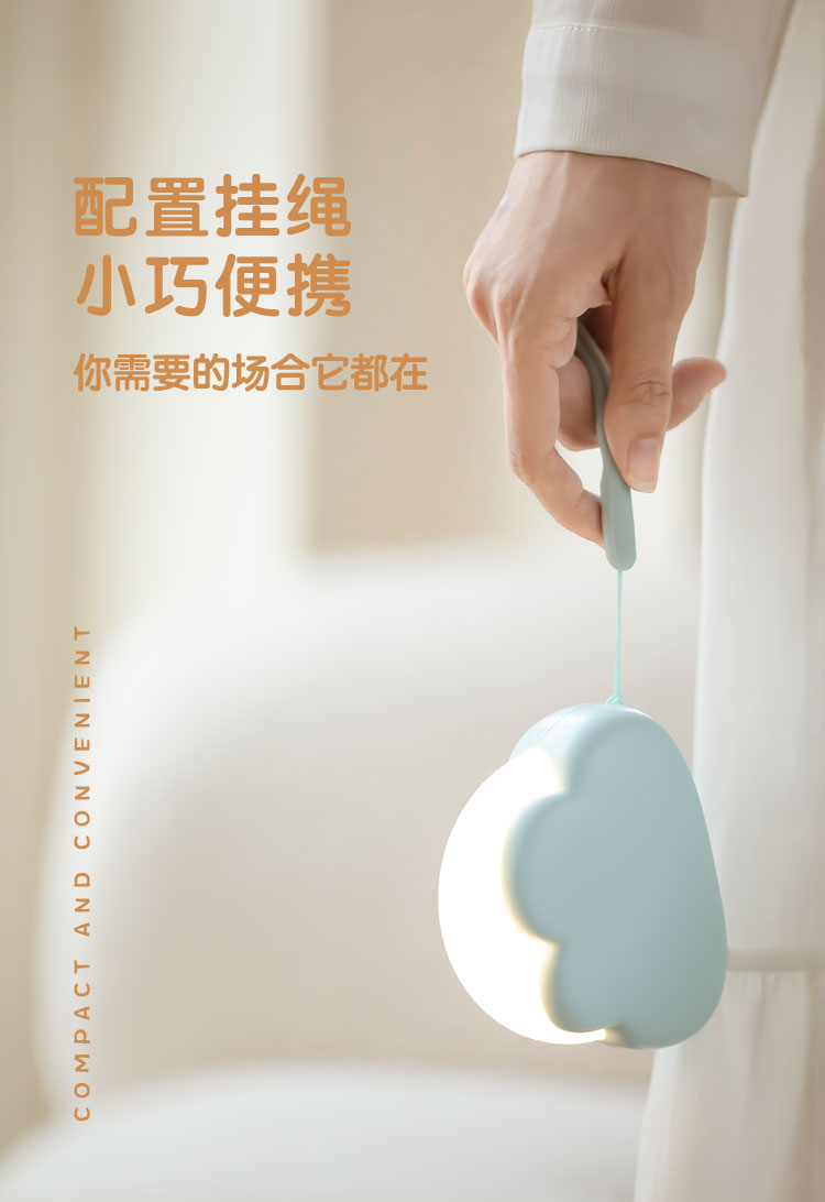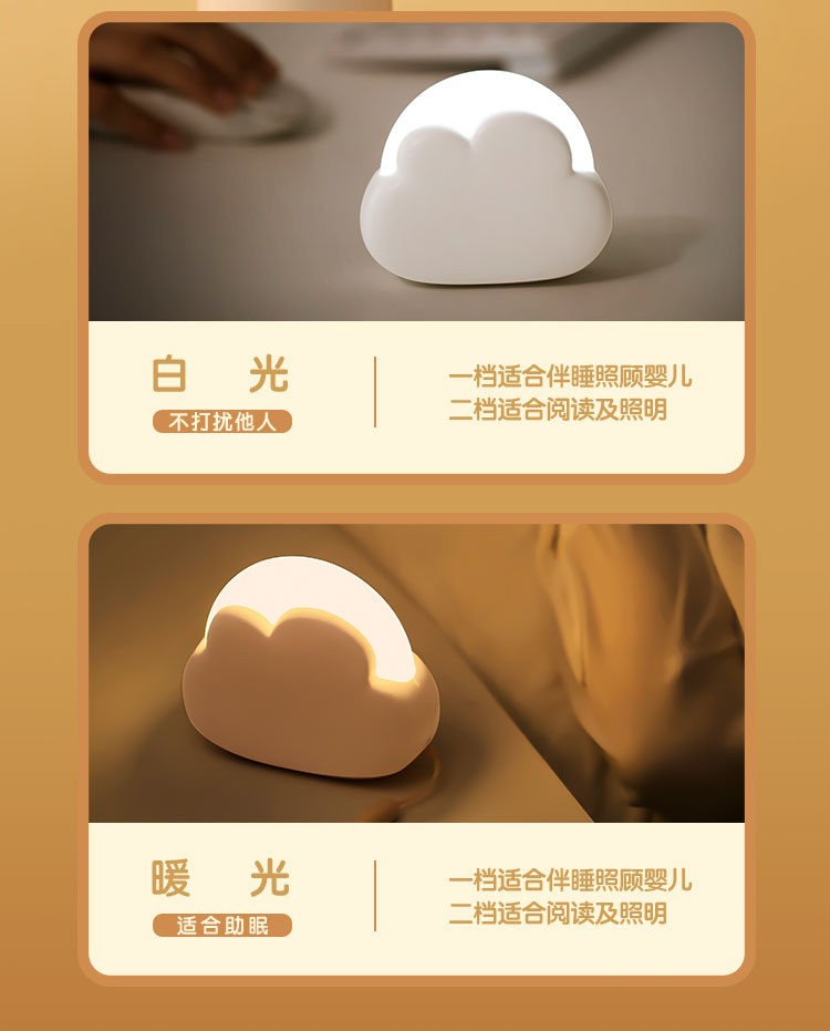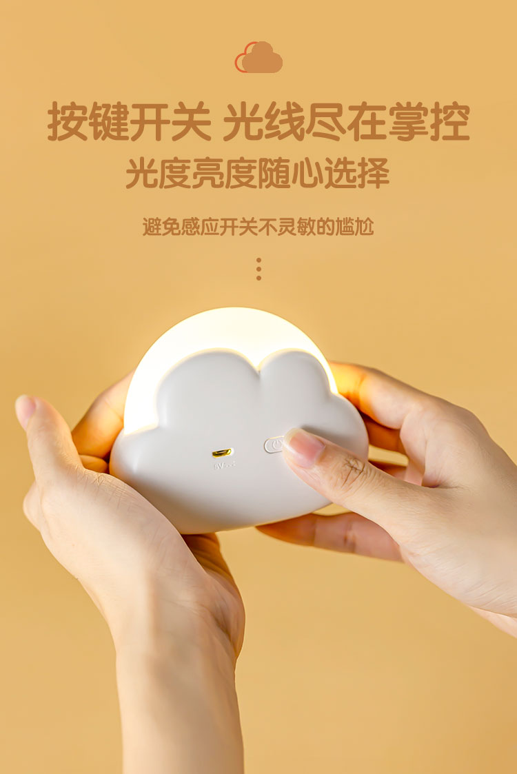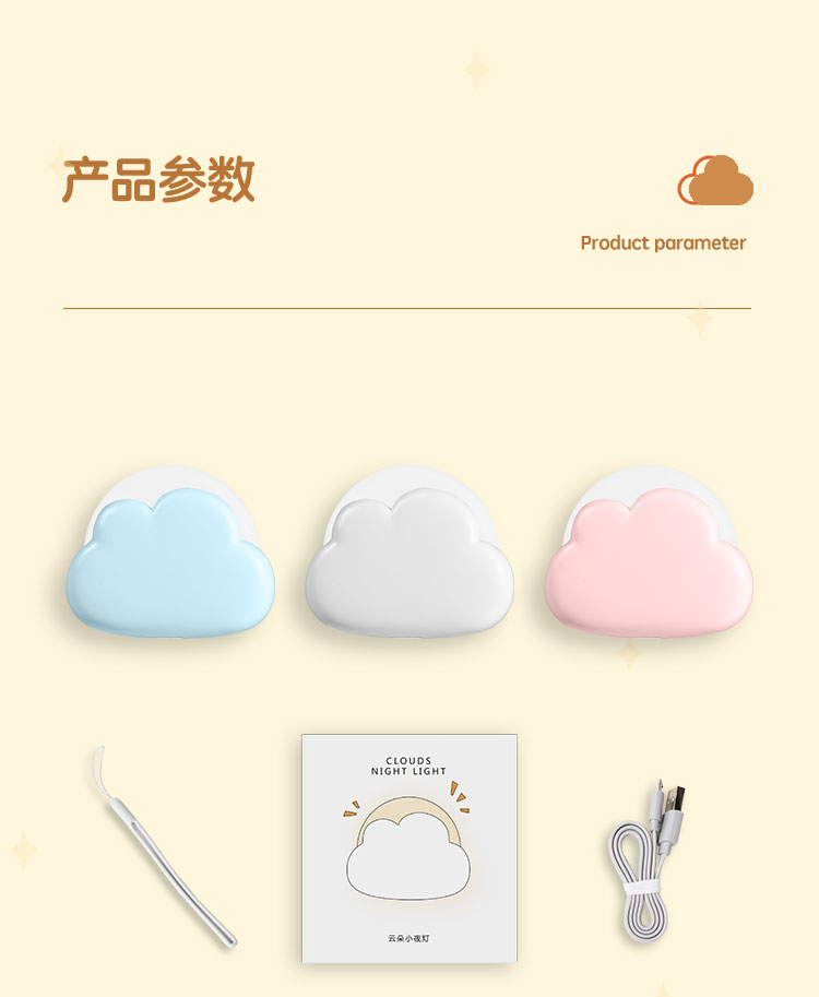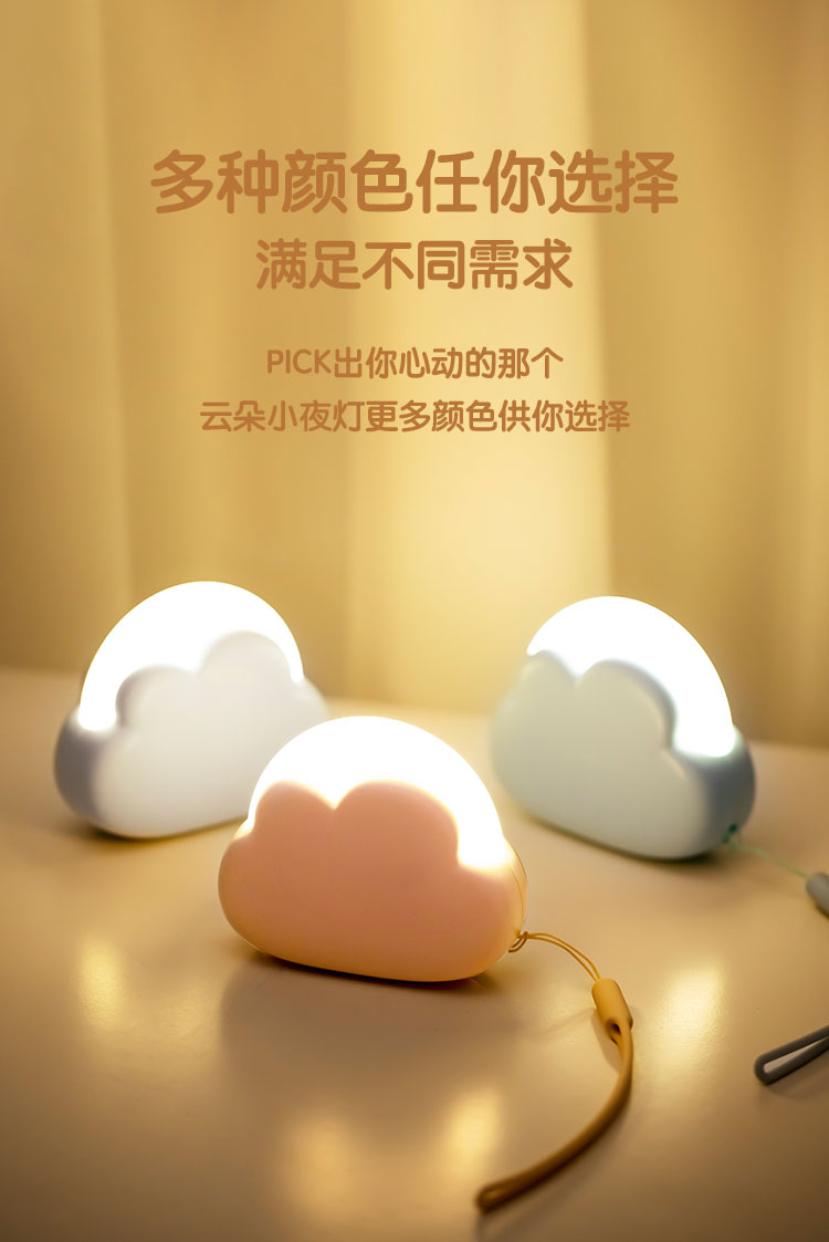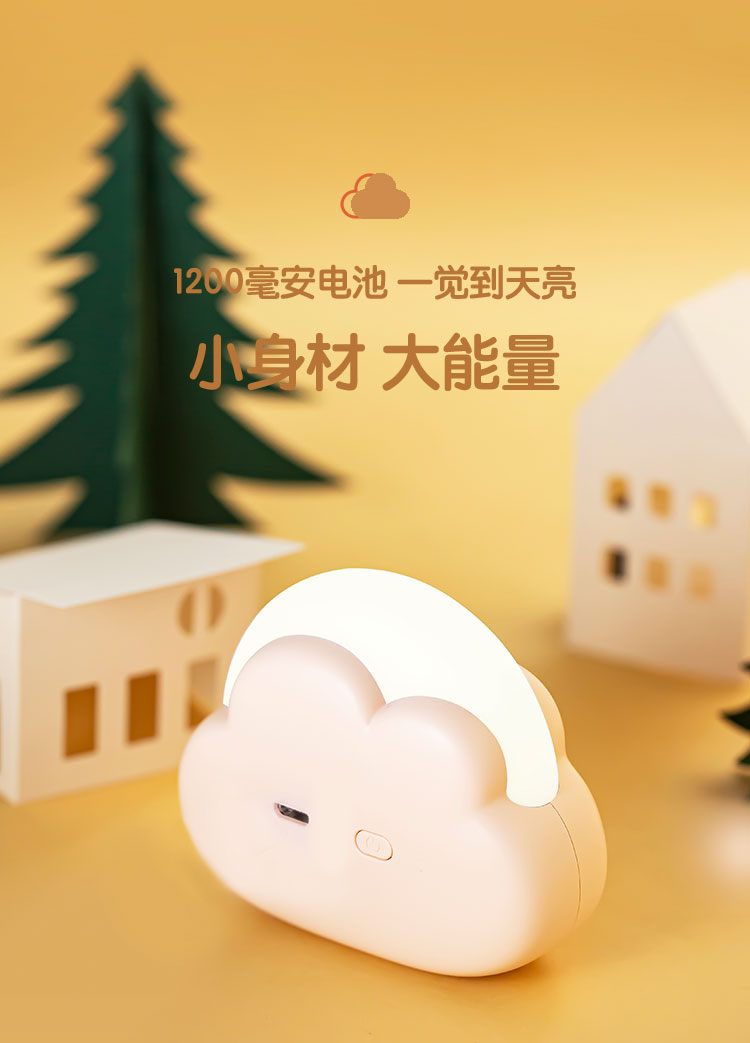 奥苏米云朵小夜灯 颜色:白 蓝 粉 材 质 : ABS+PP 1箱 : 60 pcs/箱 产品尺寸 : 94.2*78.6*36mm 款式/颜色 : 白色 粉色 蓝色 电池容量 : 1200毫安 续航时间 : 30-10小时 彩盒包装尺寸:96*37*102mm 外箱尺寸 ; 50*25*22.5 cm 产品认证:CE、ROSH、FCC、质检报告 单个毛重 :122G 功能特点: • 三档调节 长时续航 小巧便携 • 礼盒包装 柔光护眼 陪伴 • 定时关闭 • 使用A类电池 环保材质更安全健康
