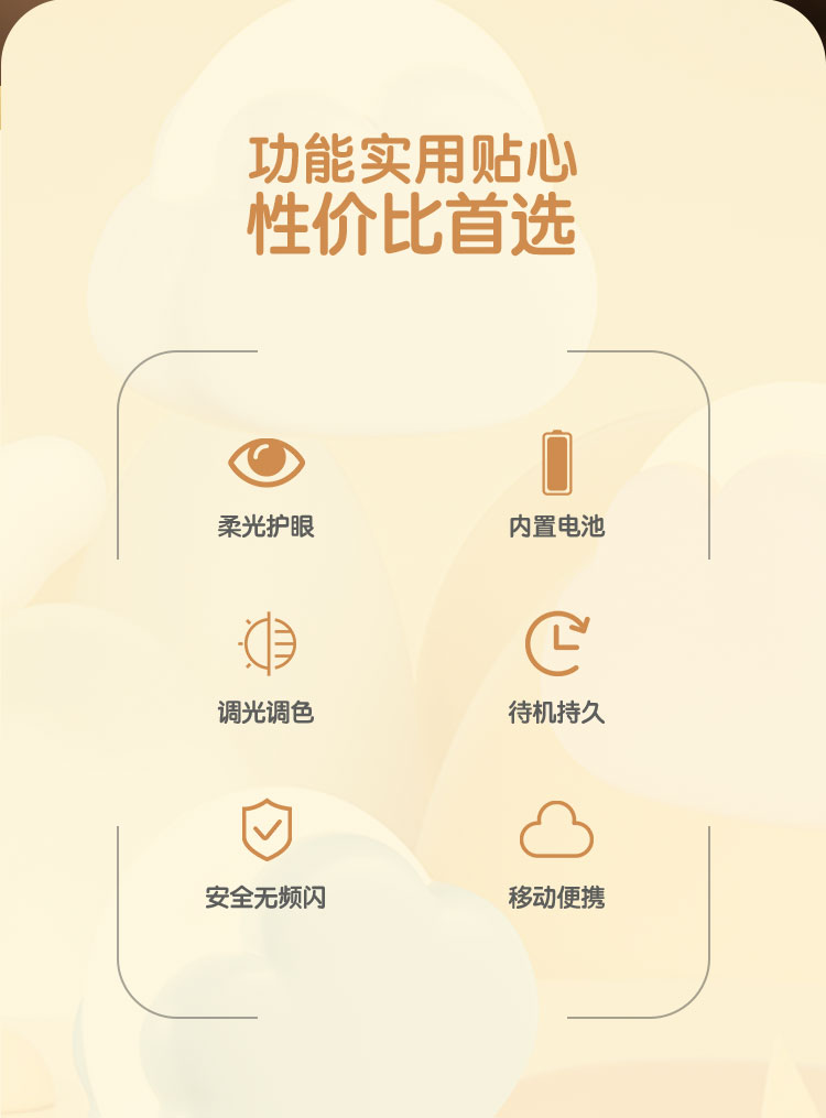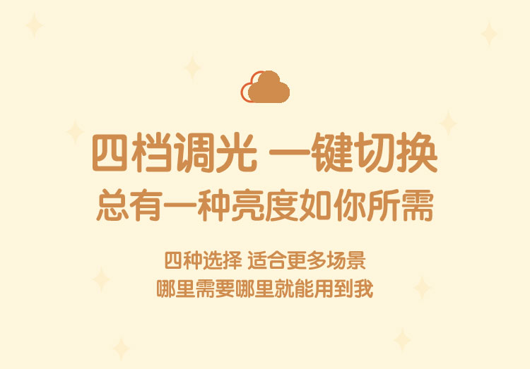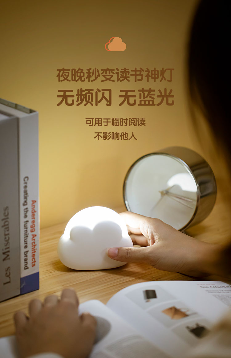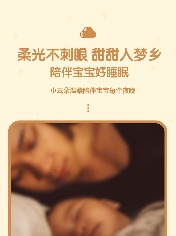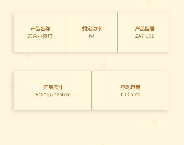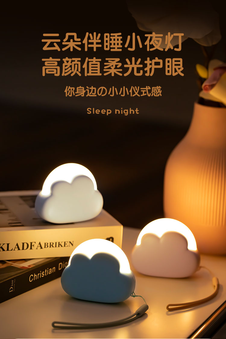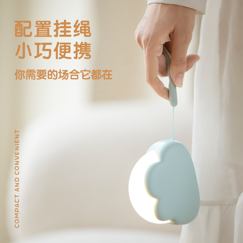 奥苏米云朵小夜灯 颜色:白 蓝 粉 材 质 : ABS+PP 1箱 : 60 pcs/箱 产品尺寸 : 94.2*78.6*36mm 款式/颜色 : 白色 粉色 蓝色 电池容量 : 1200毫安 续航时间 : 30-10小时 彩盒包装尺寸:96*37*102mm 外箱尺寸 ; 50*25*22.5 cm 产品认证:CE、ROSH、FCC、质检报告 单个毛重 :122G 功能特点: • 三档调节 长时续航 小巧便携 • 礼盒包装 柔光护眼 陪伴 • 定时关闭 • 使用A类电池 环保材质更安全健康