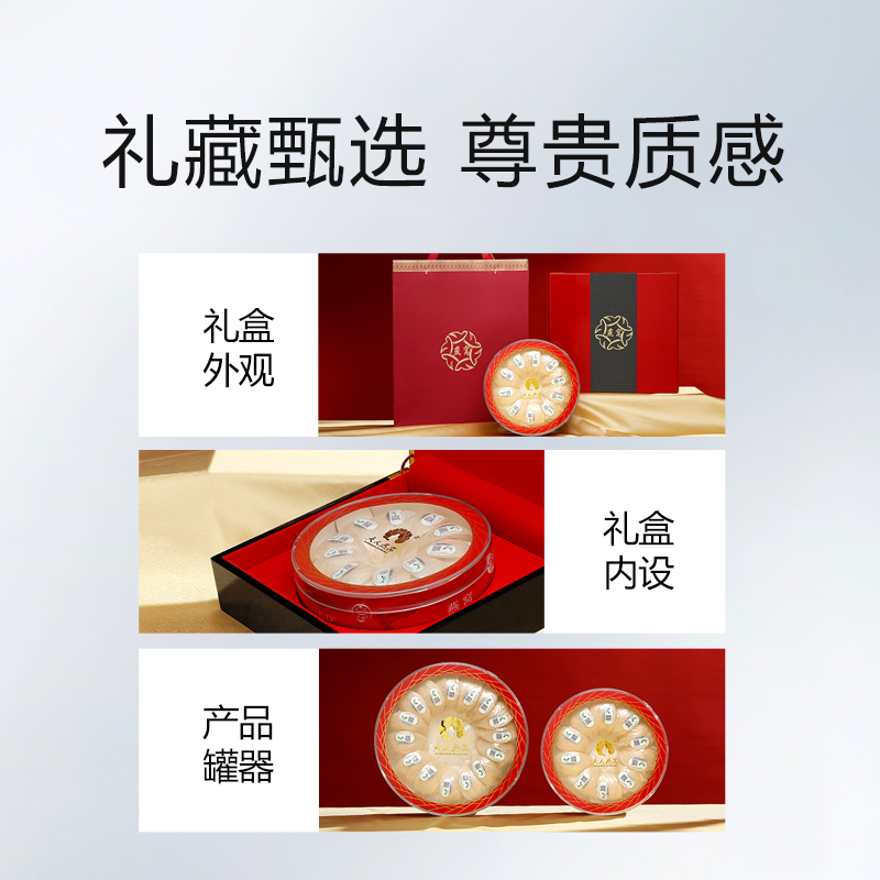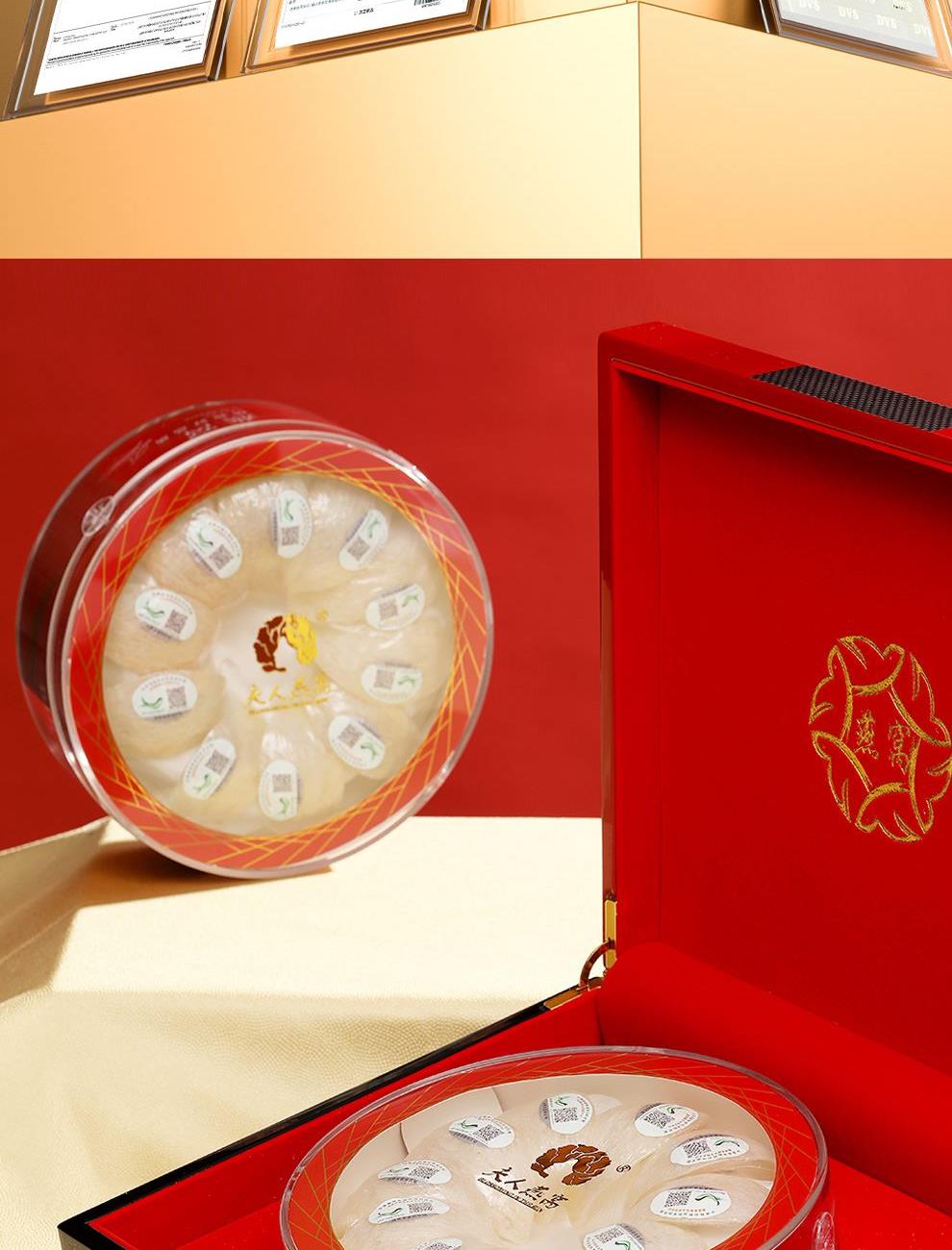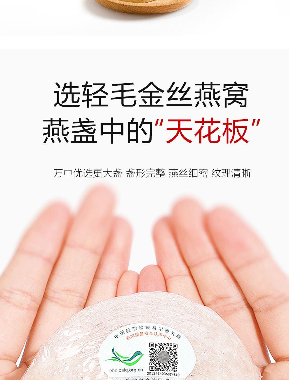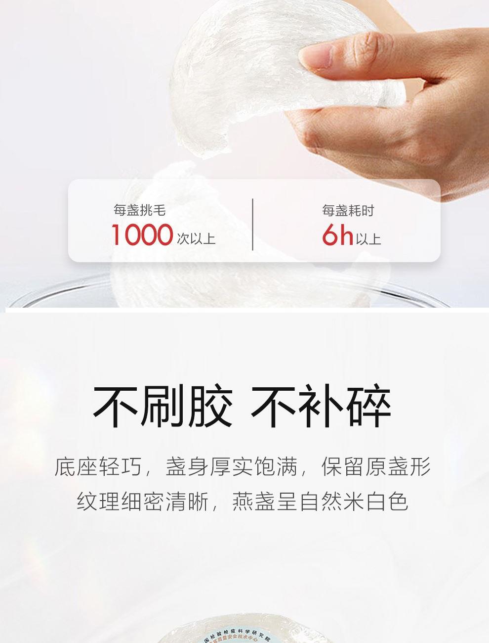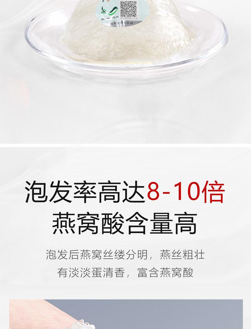 规格:溯源大盏100克 卖点: 1、一盏一码,溯源可查,品质有保障。 2、不刷胶,不补碎,泡发率高达8-10倍。 3、99.9%洁净度,足干足称,不为一滴水分买单。 4、节省时间、免泡发燕盏省去了泡发的时间,可以开始炖煮。 5、免泡发燕盏的加工过程更加标准化,品质更加稳定。