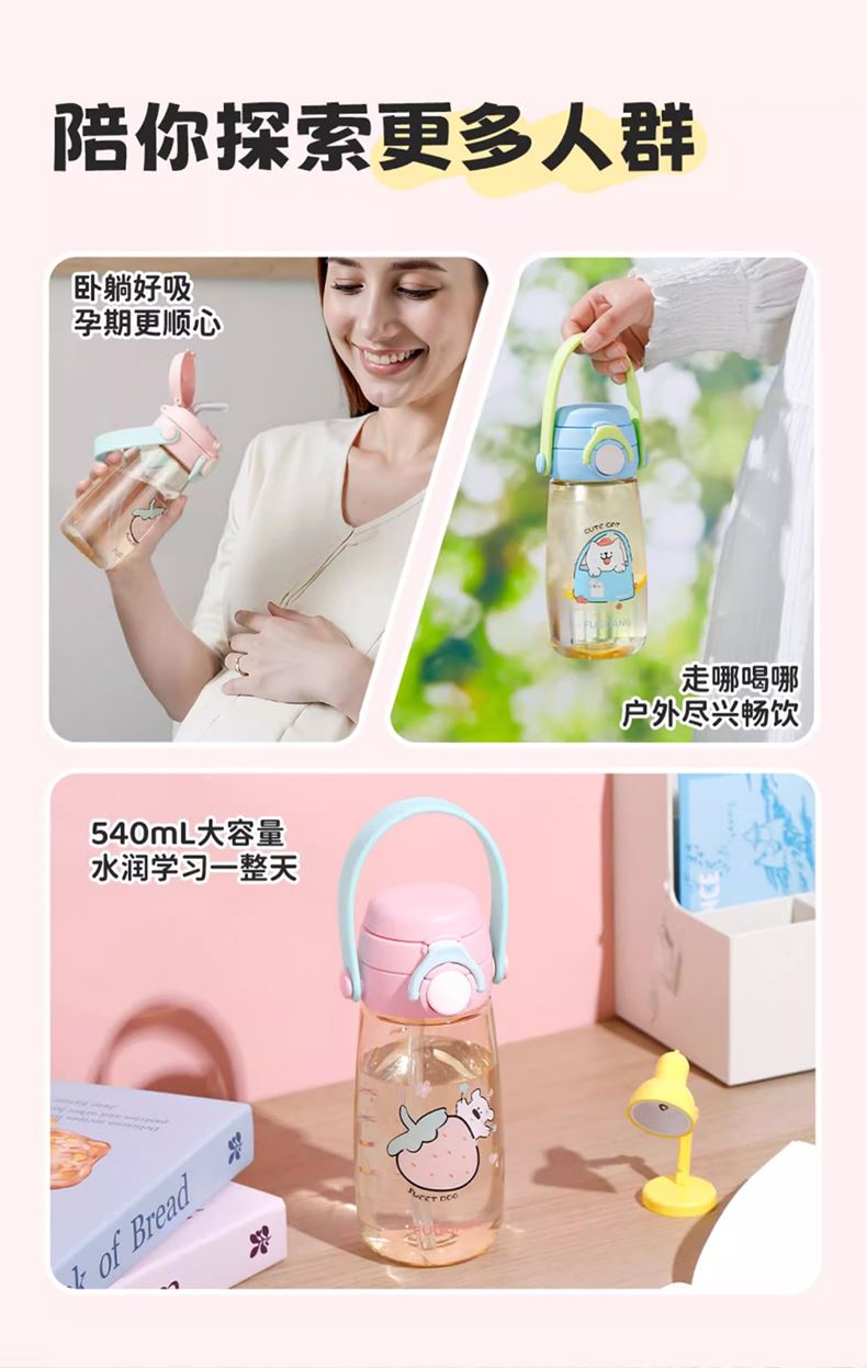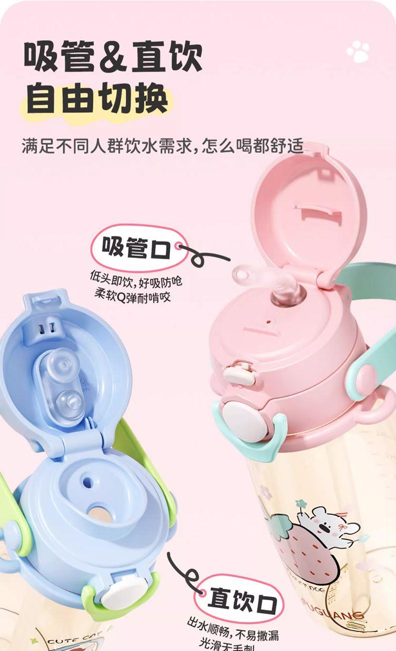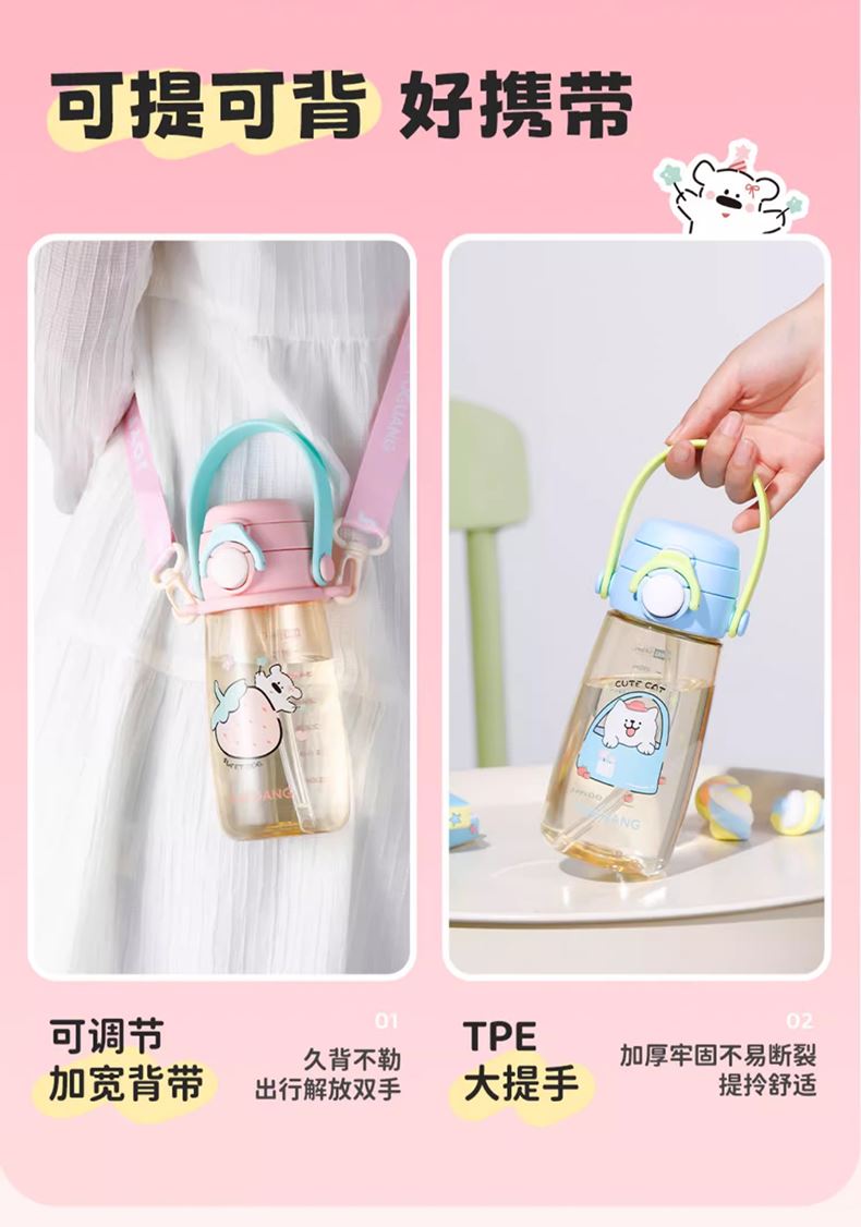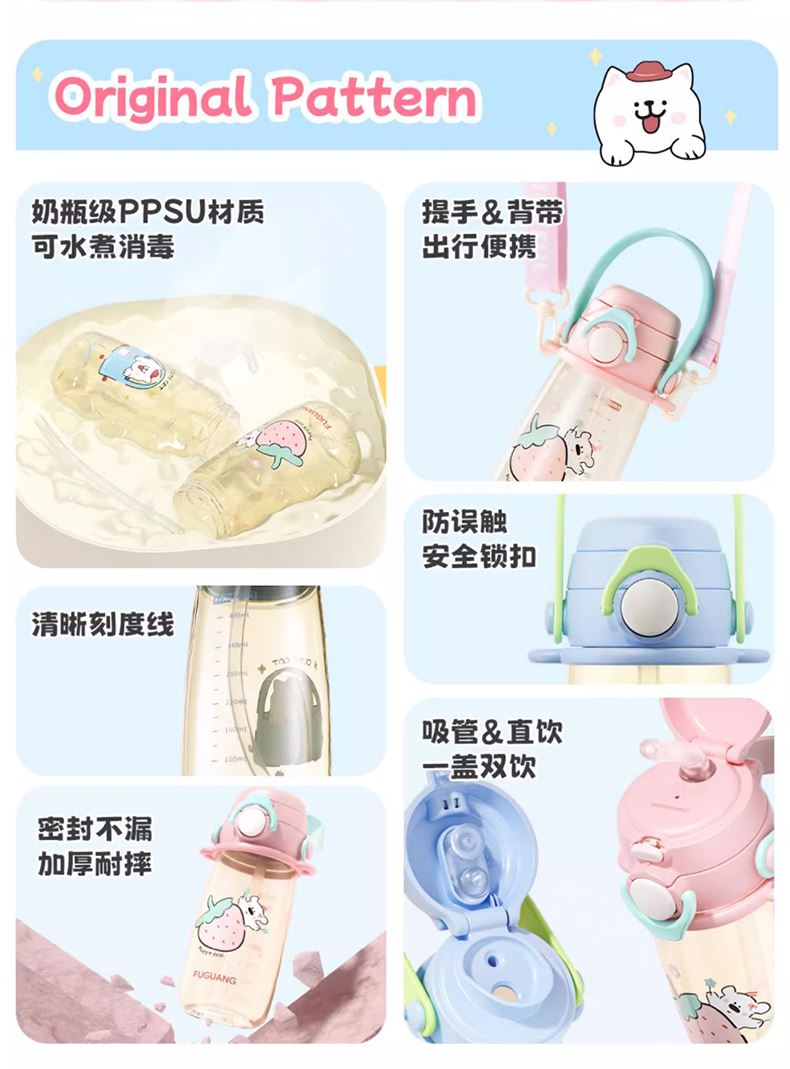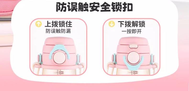 · 奶瓶级PPSU材质,可水煮消毒。 · 吸管&直饮一盖双饮,自由切换。 · 防误触安全锁扣。 · 柔软舒适提手&背带。