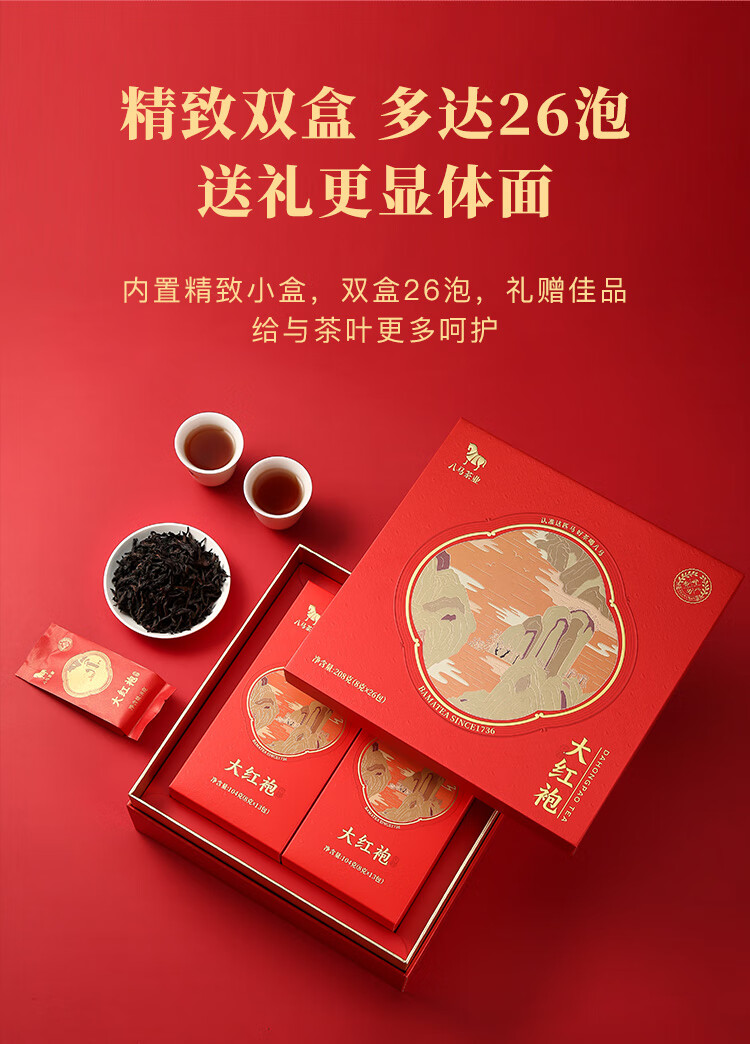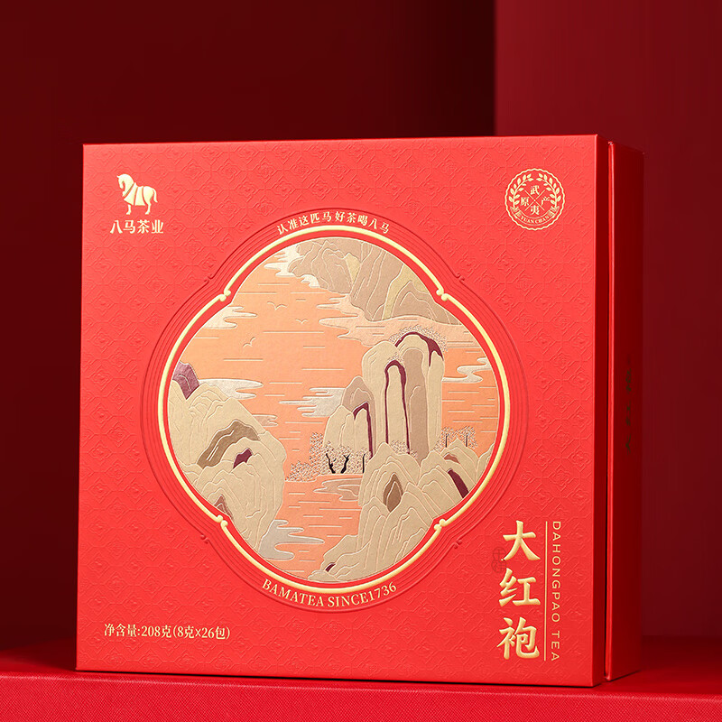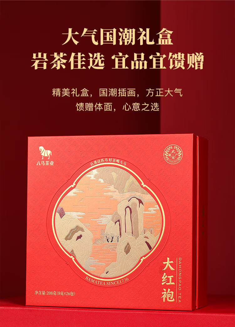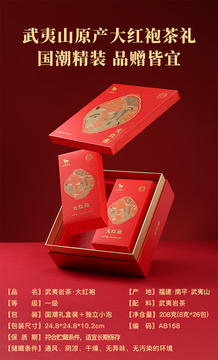 【编码】AB168 【包装尺寸】24.8*24.8*10.2cm 【净 含 量】8克*26包 【保 质 期】符合条件长期保存 【包装】精装礼盒装 【储藏条件】防潮湿,防异味,避光直射 推荐理由: 武夷核心产区,岩骨花香,滋味醇厚 传统焙火工艺,耐泡回甘,岩韵十足 八马礼盒,独立小泡,送礼体面