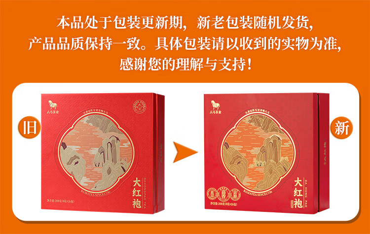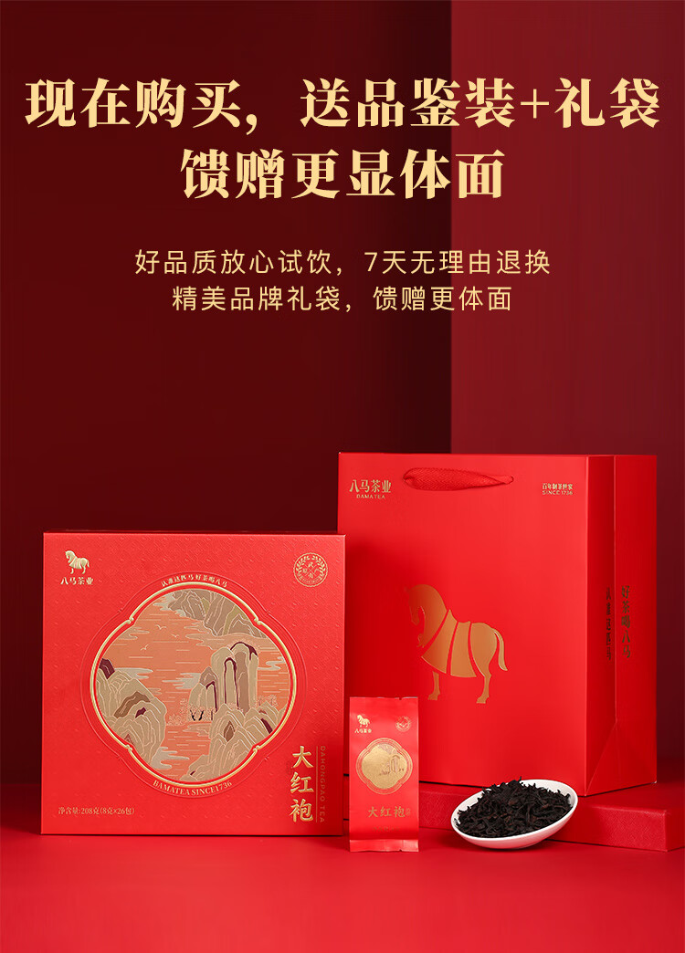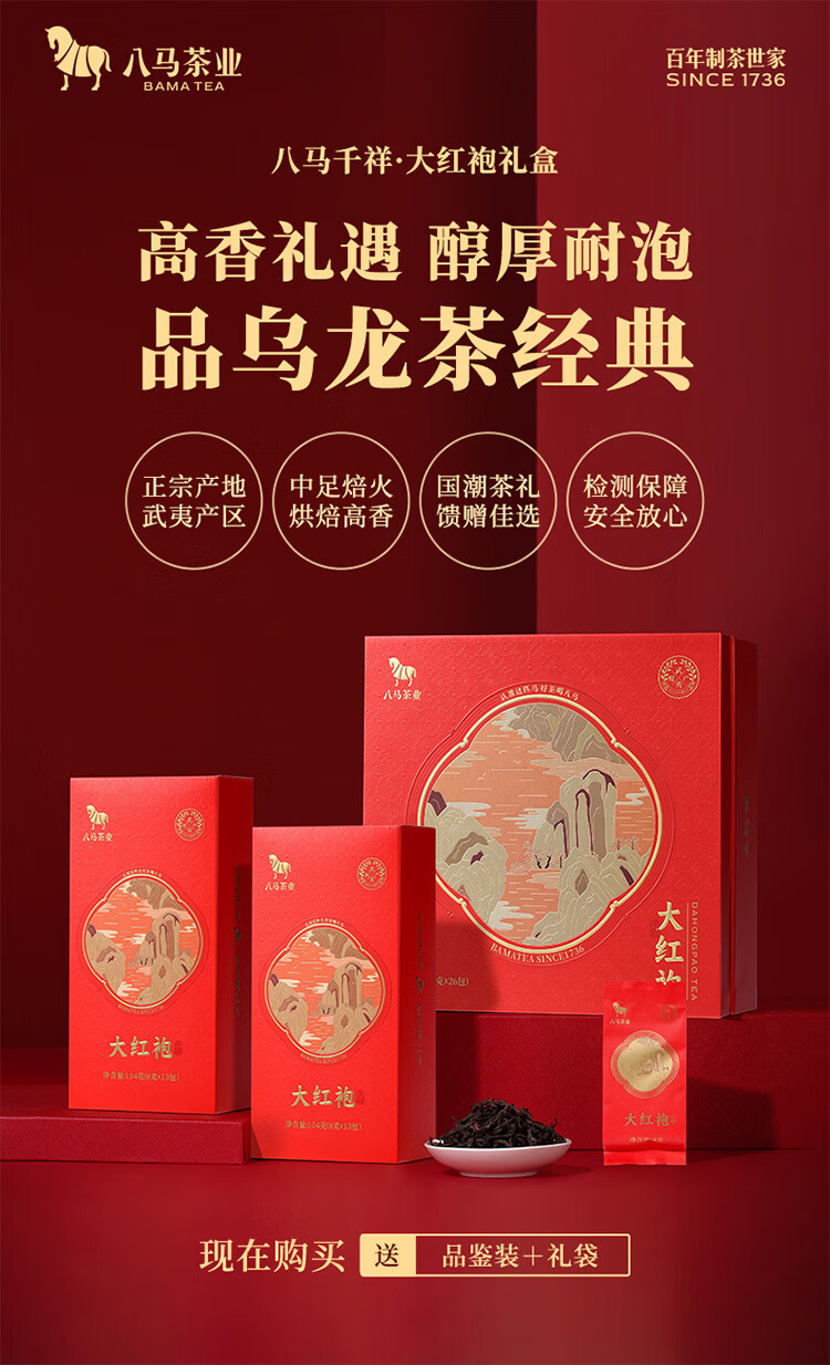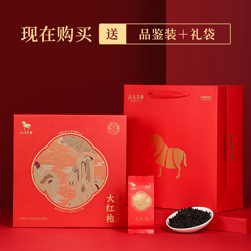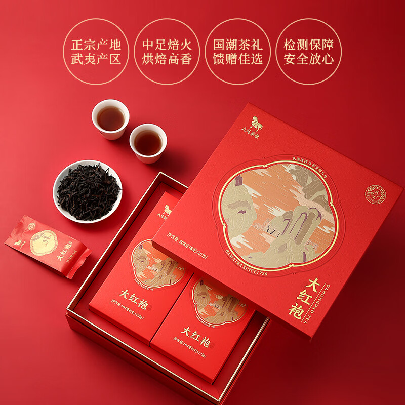 【编码】AB168 【包装尺寸】24.8*24.8*10.2cm 【净 含 量】8克*26包 【保 质 期】符合条件长期保存 【包装】精装礼盒装 【储藏条件】防潮湿,防异味,避光直射 推荐理由: 武夷核心产区,岩骨花香,滋味醇厚 传统焙火工艺,耐泡回甘,岩韵十足 八马礼盒,独立小泡,送礼体面