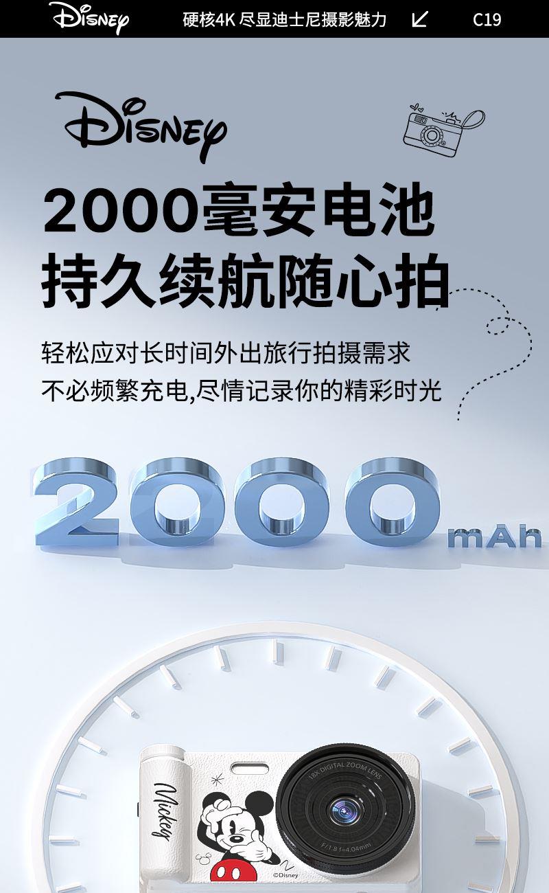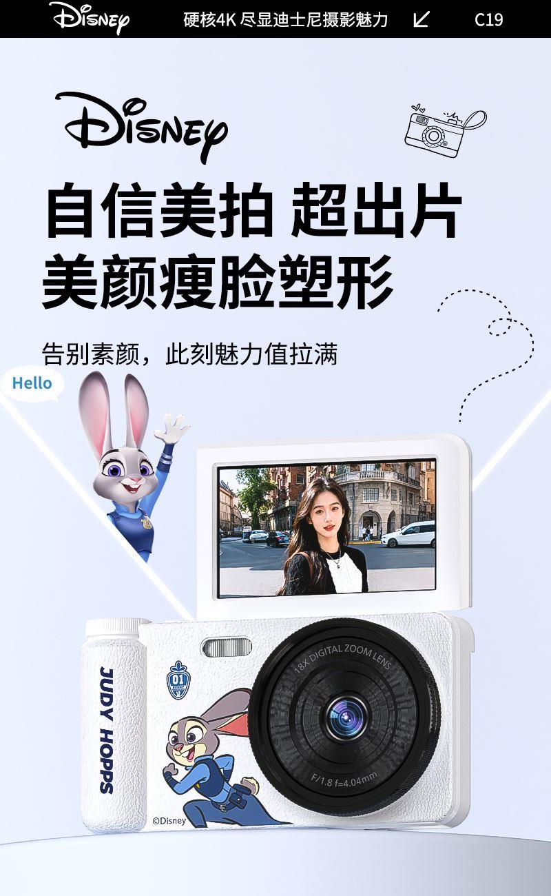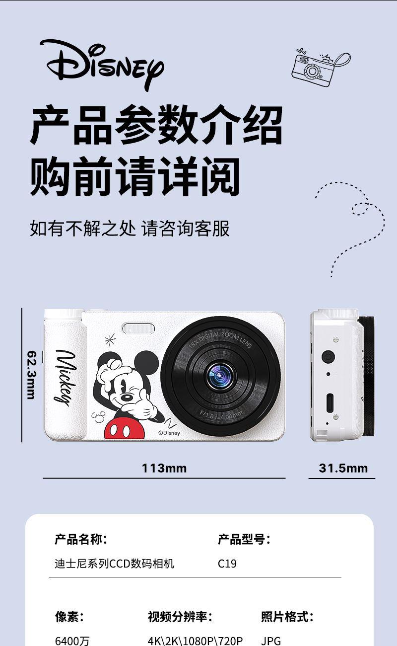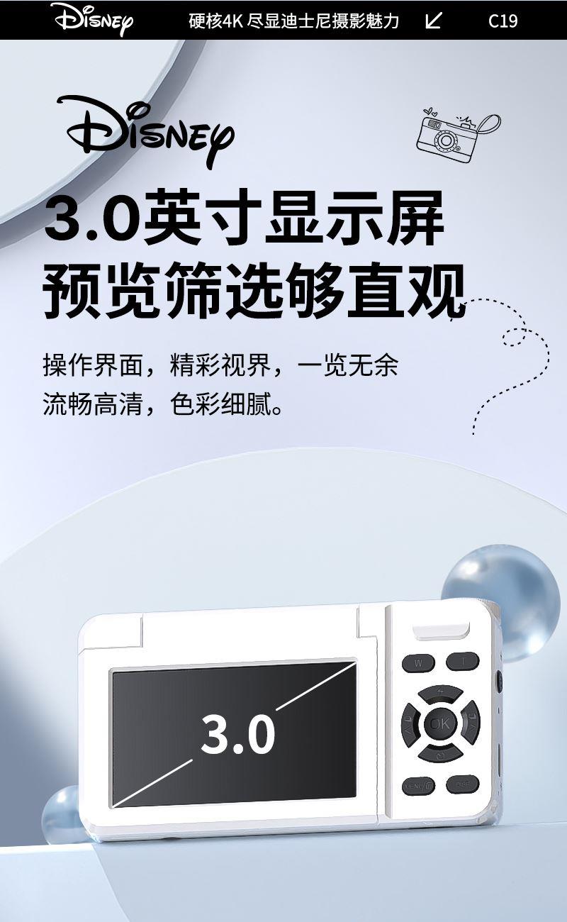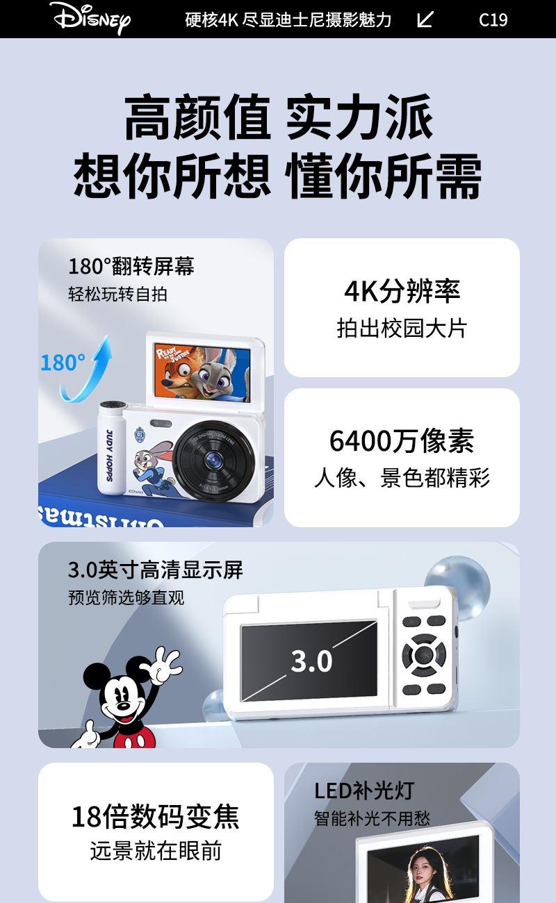 产品型号:C19翻转屏CCD数码相机 屏幕尺寸:3.0"IPS高清屏 视频分辨率:4K、2K、1080P、720P 像素:2000W 产品功能:拍照/录像 产品材质:ABS+锌合金 产品尺寸:113×61×20mm 电池容量:2000mAh 产品款式:米奇/米妮/朱迪/史迪仔 充电接口:TYPE-C 充电电压:直流DC-5V/1A 存储方式:TF卡;支持:128GB 拍照时间:约4小时;录像时间:约1.5小时