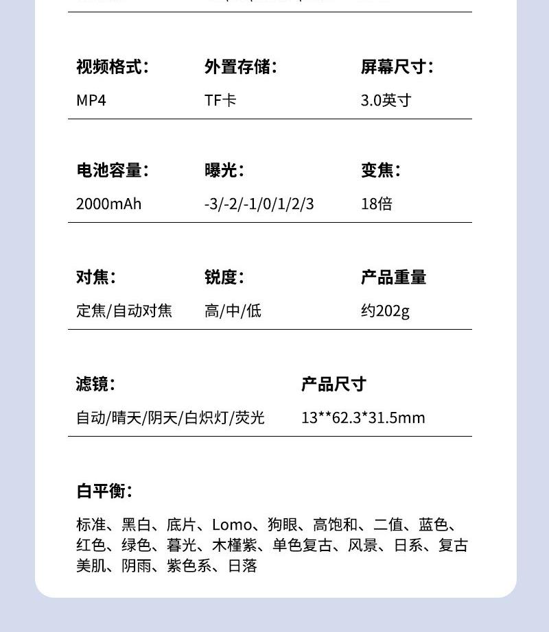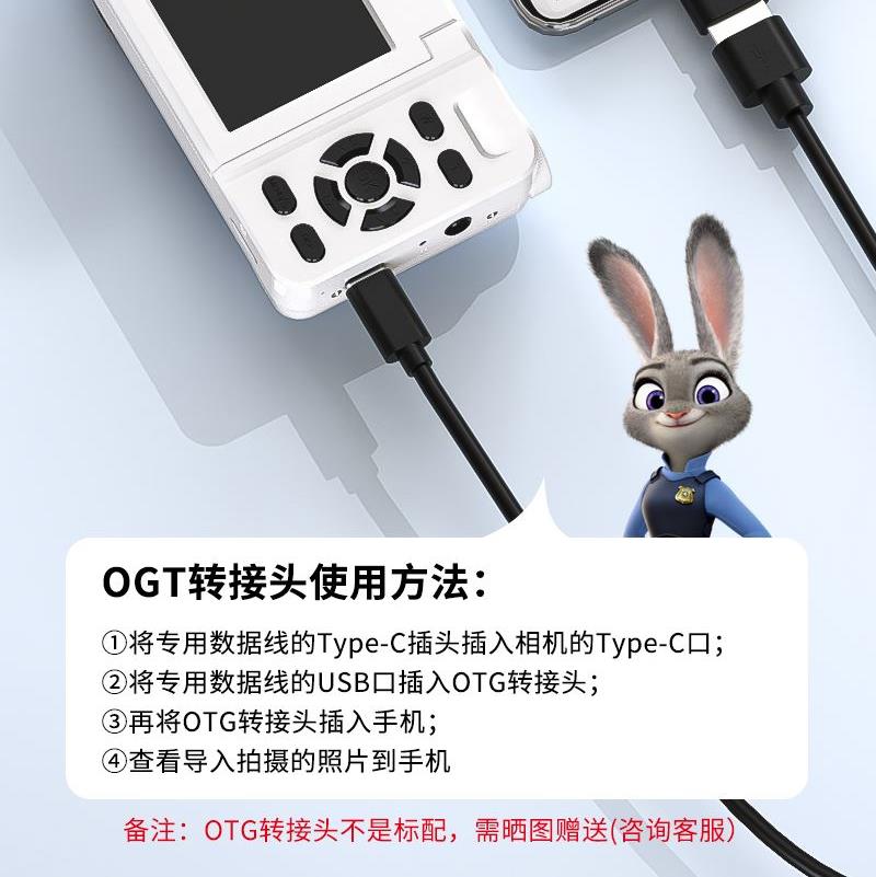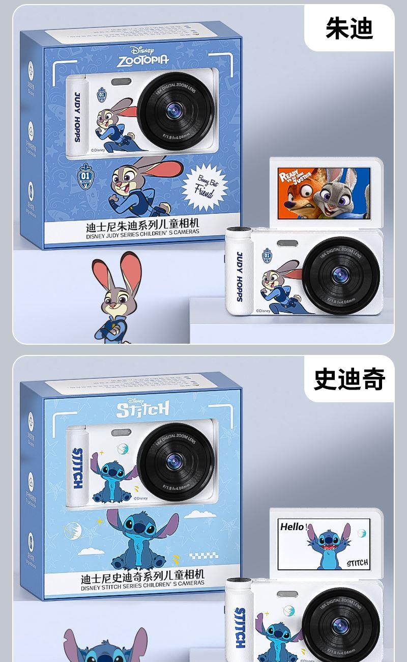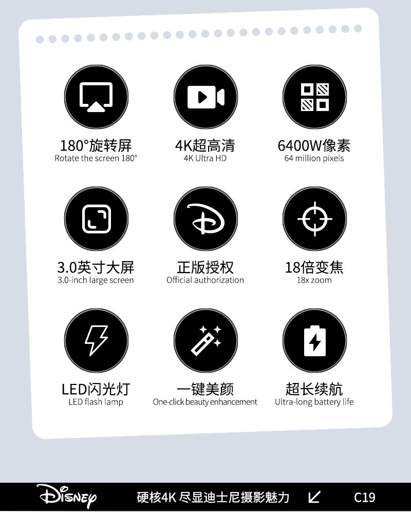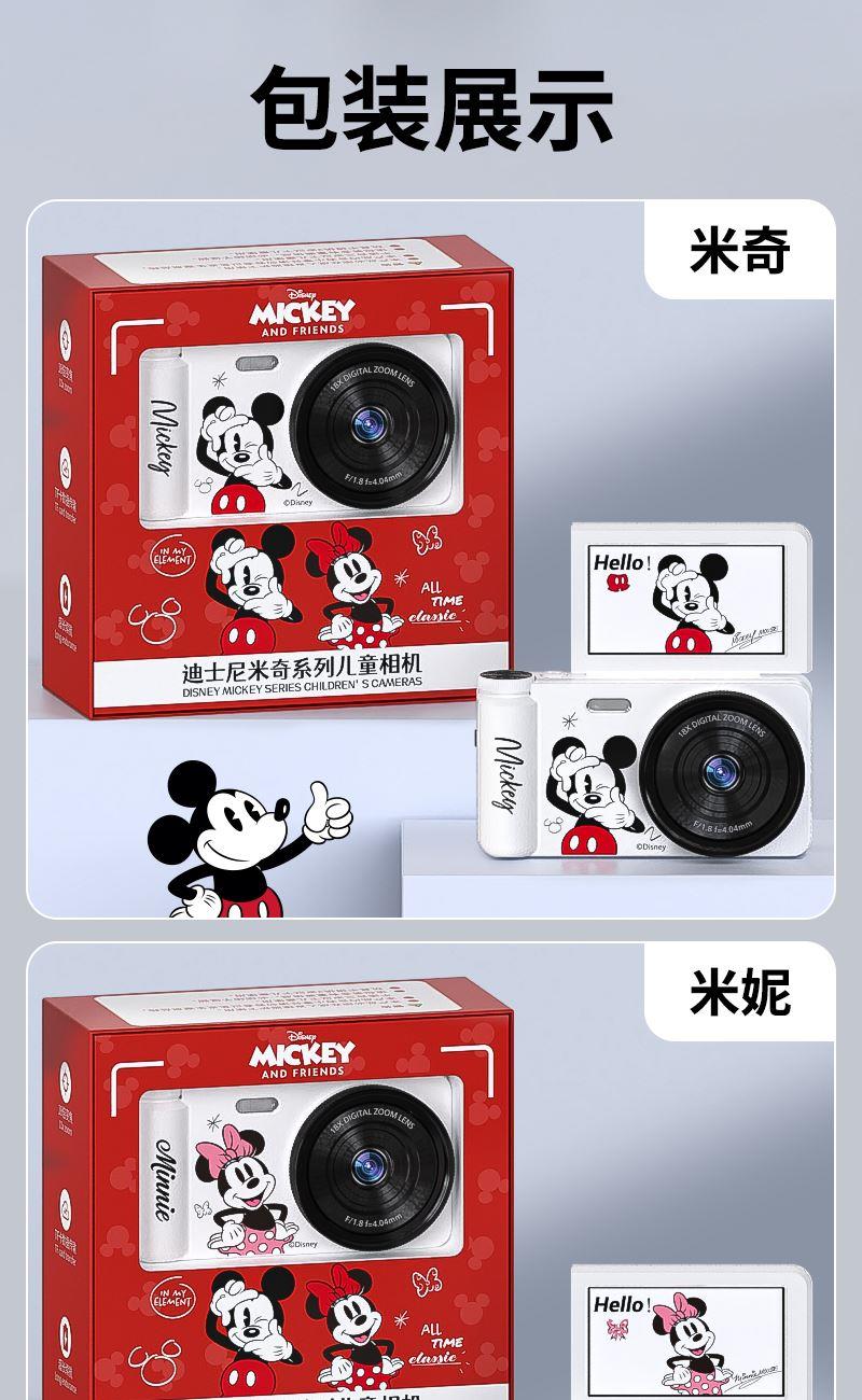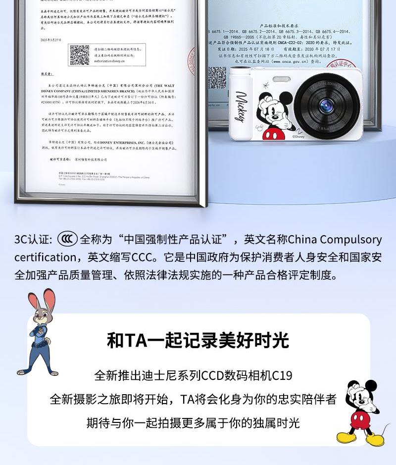 产品型号:C19翻转屏CCD数码相机 屏幕尺寸:3.0"IPS高清屏 视频分辨率:4K、2K、1080P、720P 像素:2000W 产品功能:拍照/录像 产品材质:ABS+锌合金 产品尺寸:113×61×20mm 电池容量:2000mAh 产品款式:米奇/米妮/朱迪/史迪仔 充电接口:TYPE-C 充电电压:直流DC-5V/1A 存储方式:TF卡;支持:128GB 拍照时间:约4小时;录像时间:约1.5小时