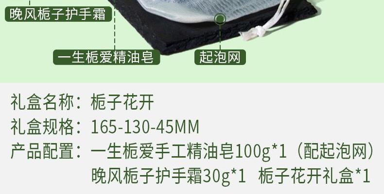 礼盒规格:135*45*165mm 产品配置:栀子花精油皂* 栀子花护手霜*1 推荐理由: 栀子花开,把春日的温柔送给你。 栀子花,寓意“美好与希望”、“喜悦与纯洁”。 一生栀爱护手霜+精油皂搭配的美肤套装,春日礼赠传递一份沁人心脾的温暖关怀。