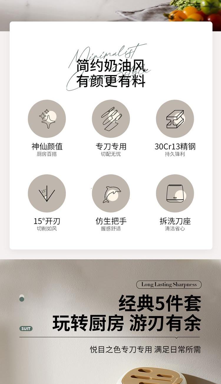 产品配置:切菜刀、三德刀、水果刀、 剪刀、刀座 刀身材质:30Cr13不锈钢(食品接触用) 包装方式:彩盒+邮购盒+外箱 1、刀具材质采用30Cr13不锈钢,硬度强、韧性高、不易生锈; 2、V型刀刃角度工艺,多达8道手工开刃工序,使刀刃平滑均匀; 3、人性化刀柄设计,符合人体工程学原理,握感舒适,长时间使用也轻松自如; 4、经由多道淬火热处理与回火工艺,刀刃锋利; 5、45度刀背磨抛,让您使用倍感舒适; 6、搭配时尚刀座,收置刀具,节约空间,干净整齐。
