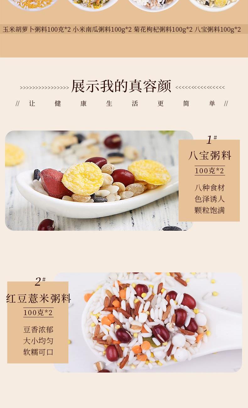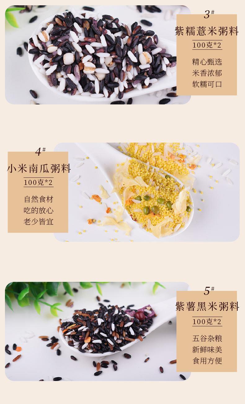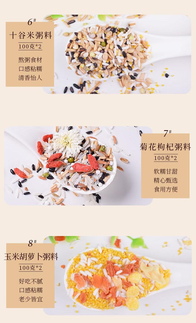 小米南瓜粥料100克*2 紫糯薏米粥料100克*2 菊花枸杞粥料100克*2 紫薯黑米粥料100克*2 八宝粥料100克*2 红豆薏米粥料100克*2 十谷米粥料100克*2 玉米胡萝卜粥料100克*2 朵朵花粥礼盒
