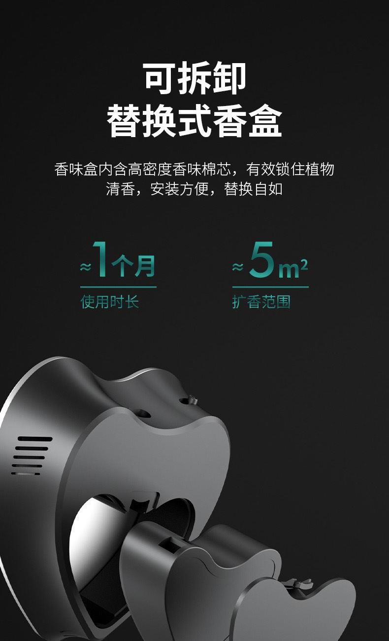 颜色:黑色、绿色 供电方式:Type-C充电 电池容量:500mAh 主机包装:11.5*4.4*12cm/148g 外箱尺寸:57.5*23*50cm/100台/15kg 香膏包装:7*5.8*2cm/31g 香膏外箱:28*28*16cm/100块/3.5kg 产品标配:彩盒、主机、香膏、说明书、数据线 内置震动传感芯片,智能随车启停 内置电池,涡轮扇叶快速主动散香 高强度耐高温机身,可拆卸替换香盒 配纯天然植物活萃植物香膏,安全可靠,母婴可用