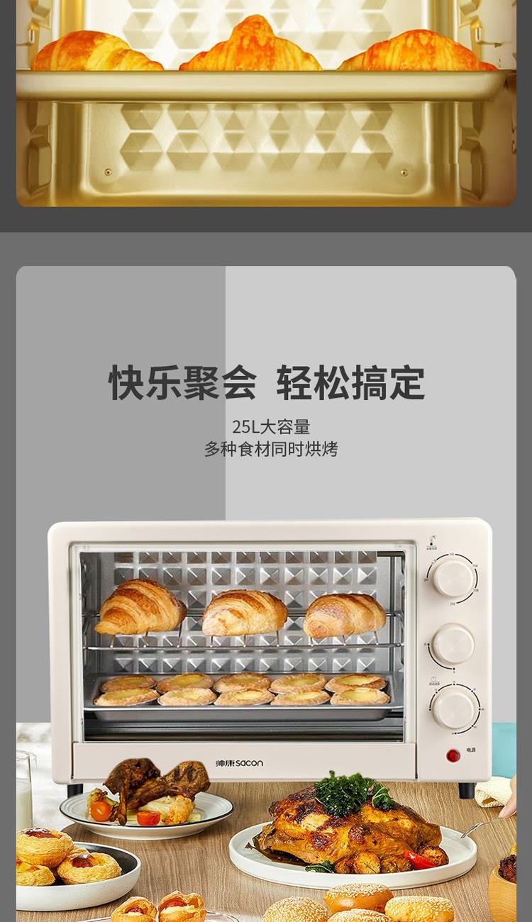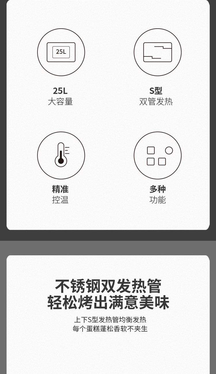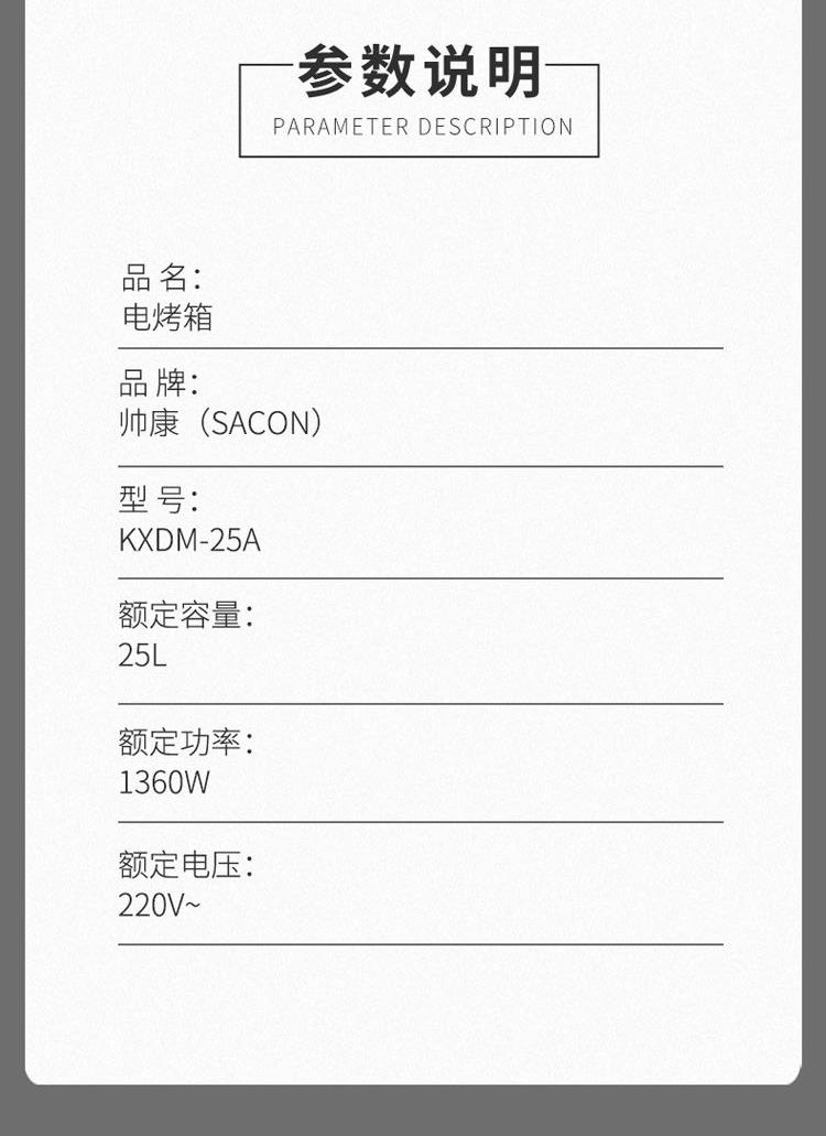 类别:微烤一体 底盘类型:平板加热 容量:25升 功能:烧烤 开门方式:下拉门 控制方式:机械式 内胆材质:涂层内胆 能效等级:3级 微波功率:1360瓦特 烧烤功率:1360 额定电压:220伏特 腔体尺寸(高*宽*深):425*310*280毫米 产品尺寸:425*310*280毫米 净重:4千克