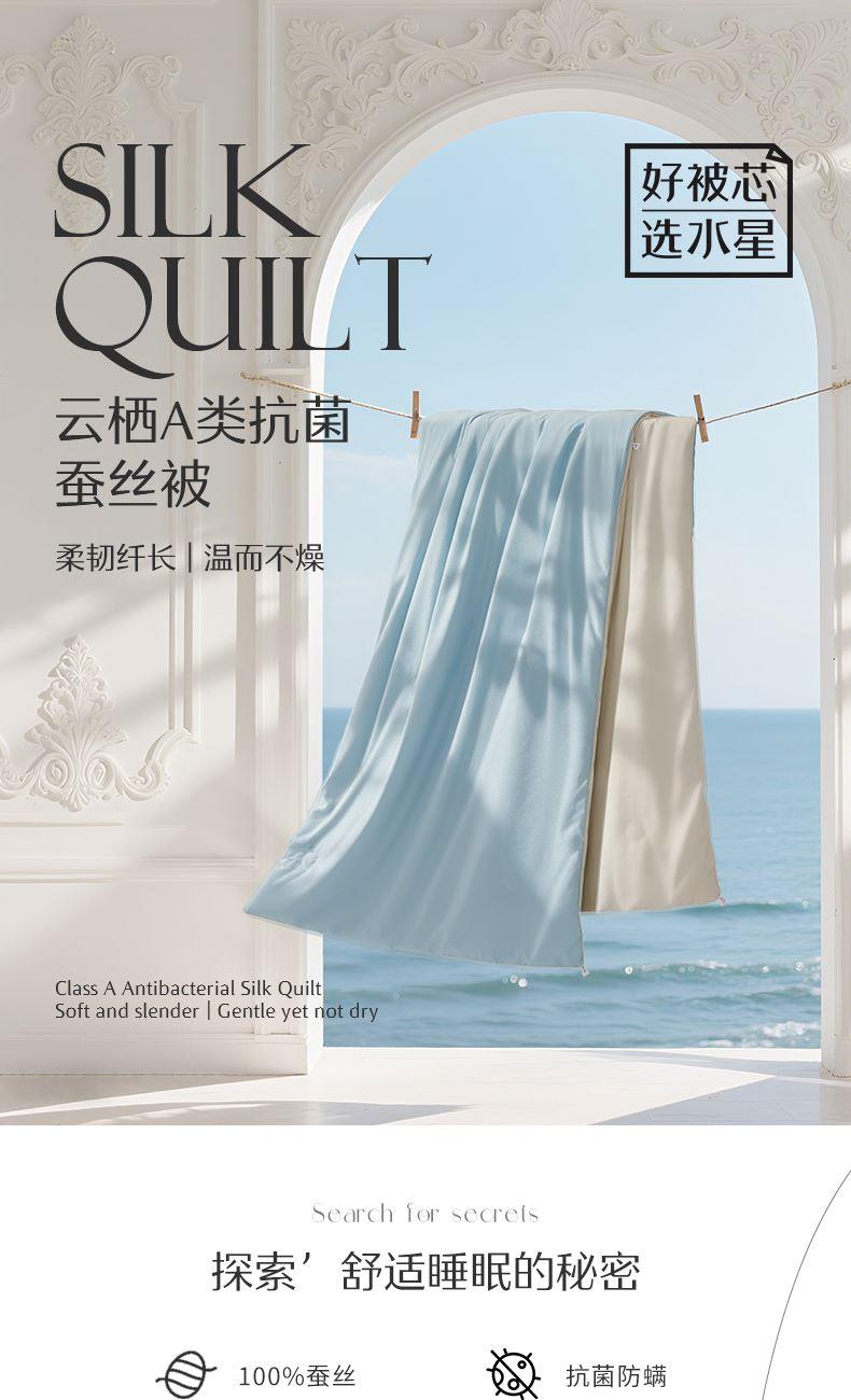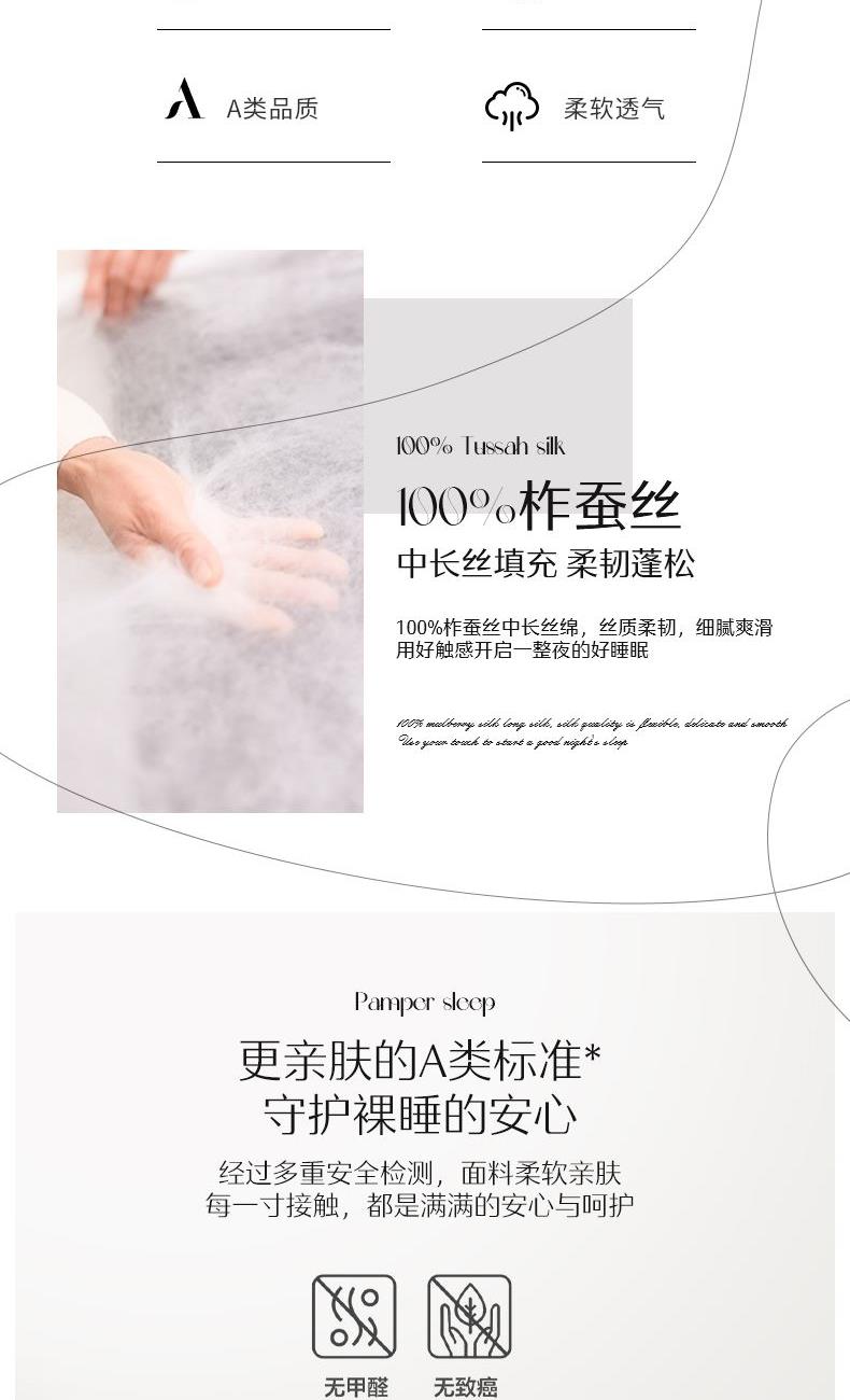 1.【A类安全标准】 A类安全标准,守护睡眠健康。 2.【柞蚕丝填充,自然有机,健康舒适】 柞蚕丝填充,轻盈透气、调温保暖。 3.【品质面料,柔软透气更亲肤】 高品质面料,触感柔软细腻,亲肤透气 4.【水星防螨科技,抑制细菌螨虫,健康舒适】 水星科技防螨,守护睡眠健康。