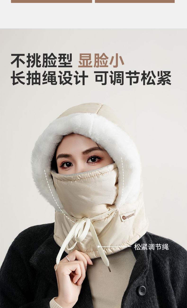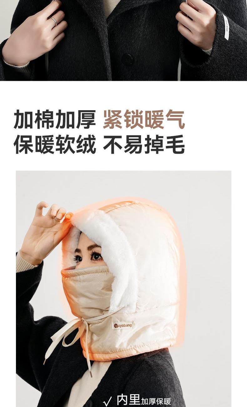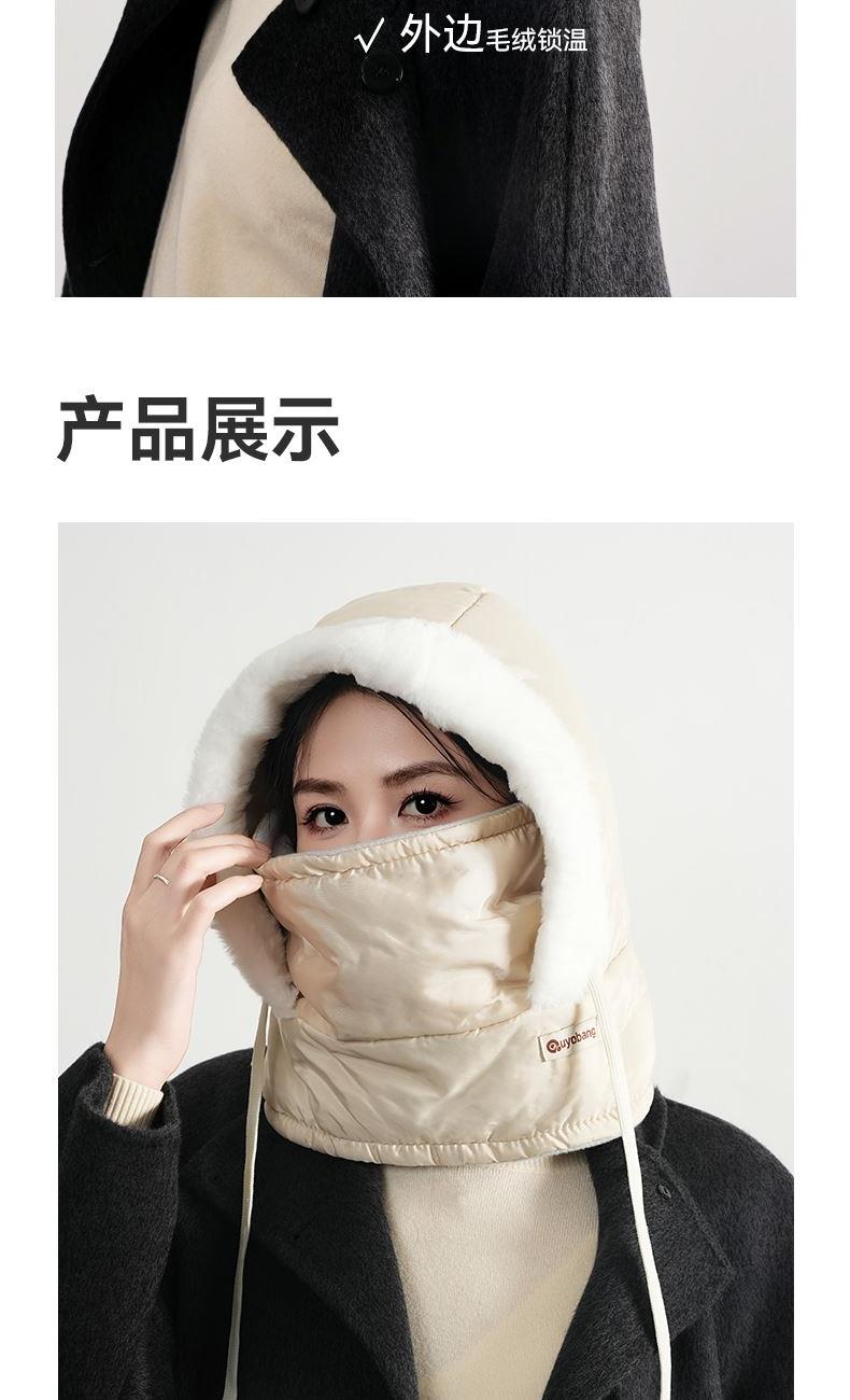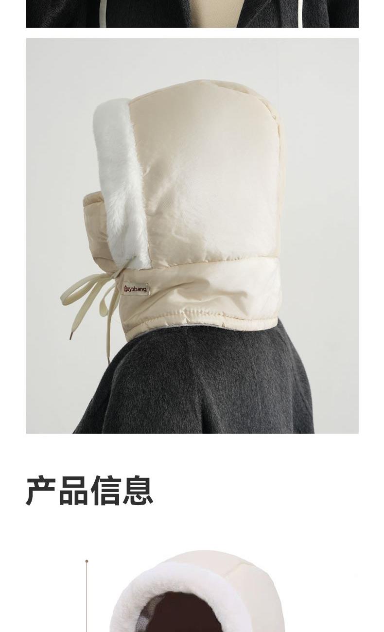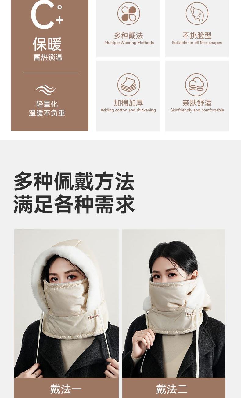 材质 涤纶 颜色 米白色 尺寸 30*30*35cm 重量 0.1kg 保暖三合一,加长护颈,从头暖到脖子 冰川级防水科技,雪水泼溅瞬间滚落,融雪不渗透内衬 内里加厚加绒,防寒保暖,佩戴舒适不掉毛 长抽绳设计,可调节松紧