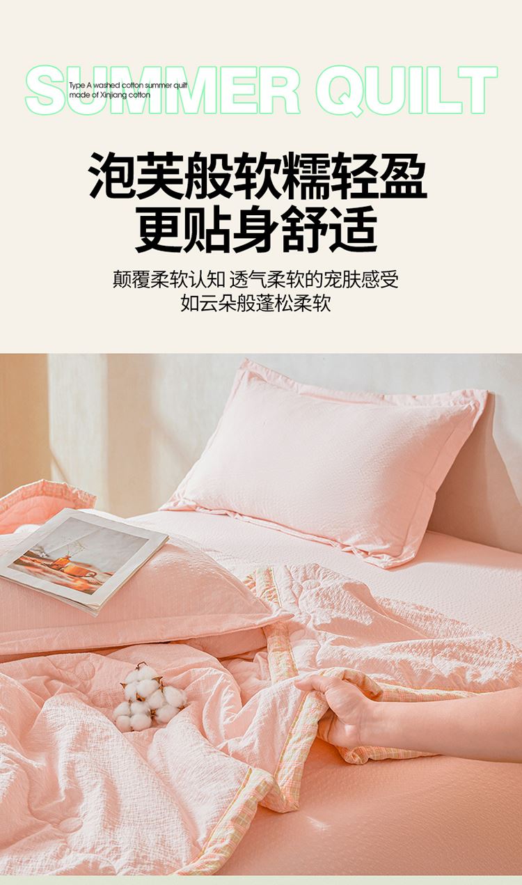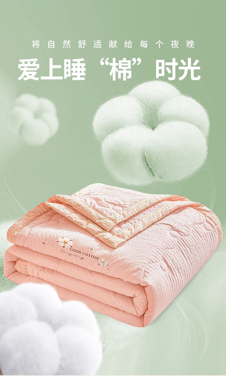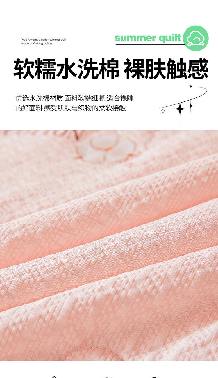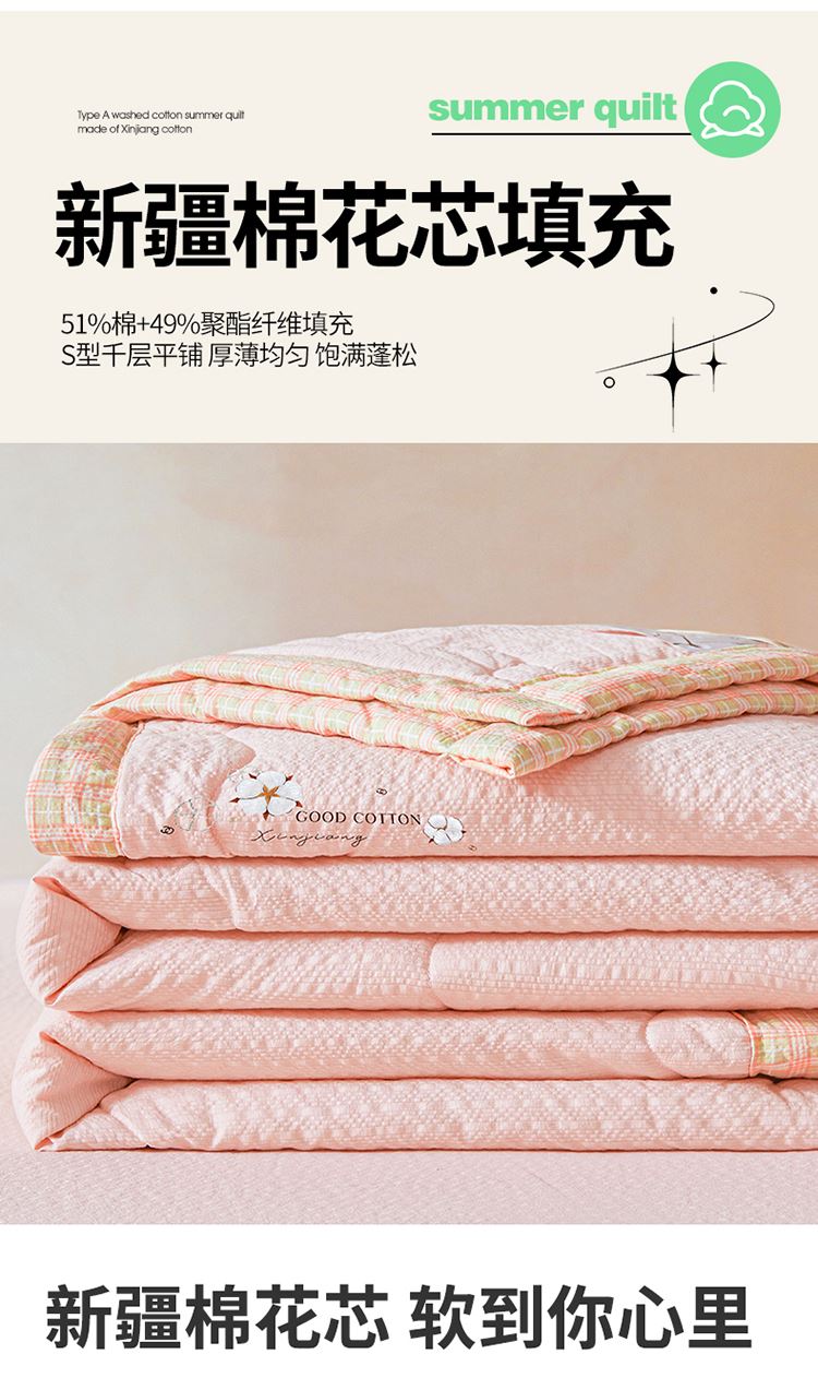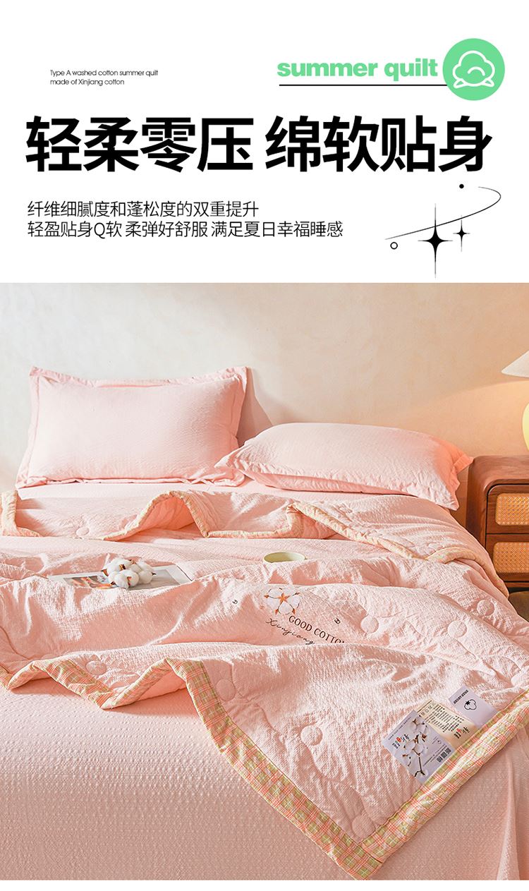 规格:200*230cm 面料:泡泡纱(聚酯纤维) 填充:51%棉花+49%羽丝棉 重量:1.5kg 卖点: 1、棉花填充,睡得安心,轻薄不压身,裸睡也舒服 2、水洗绵面料,软糯亲肤不扎身,透气不闷汗,夏天盖着超清爽。 3、简约耐看,夏天卧室必备