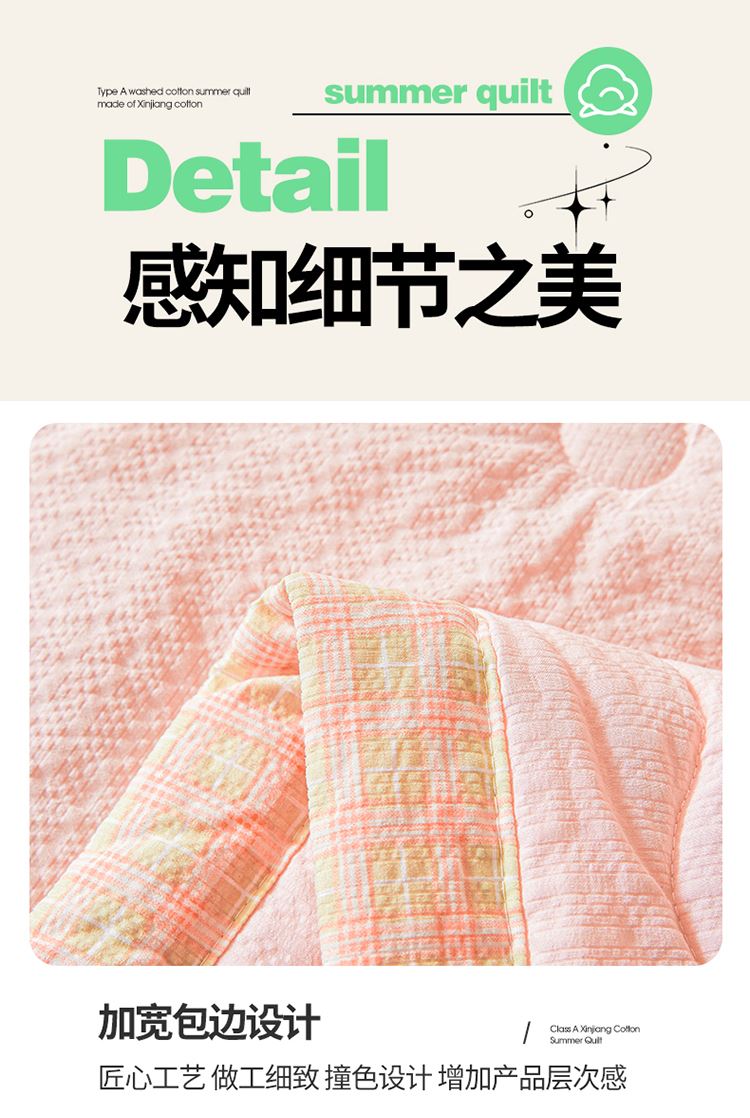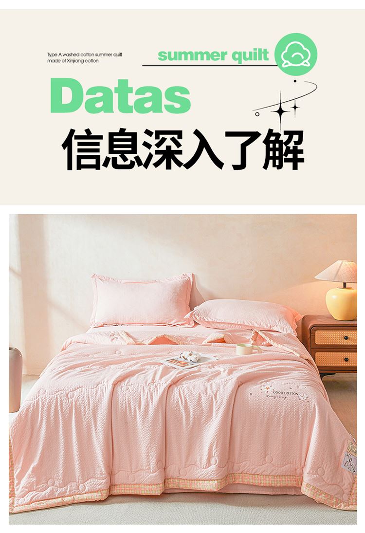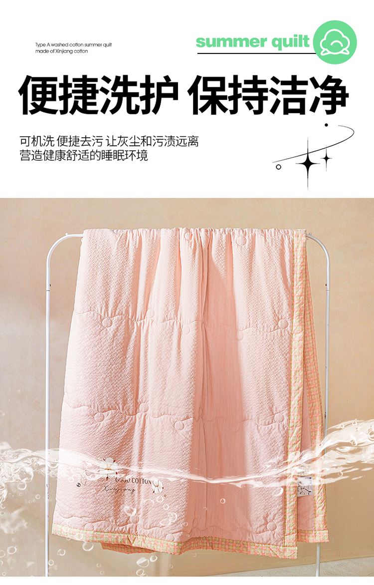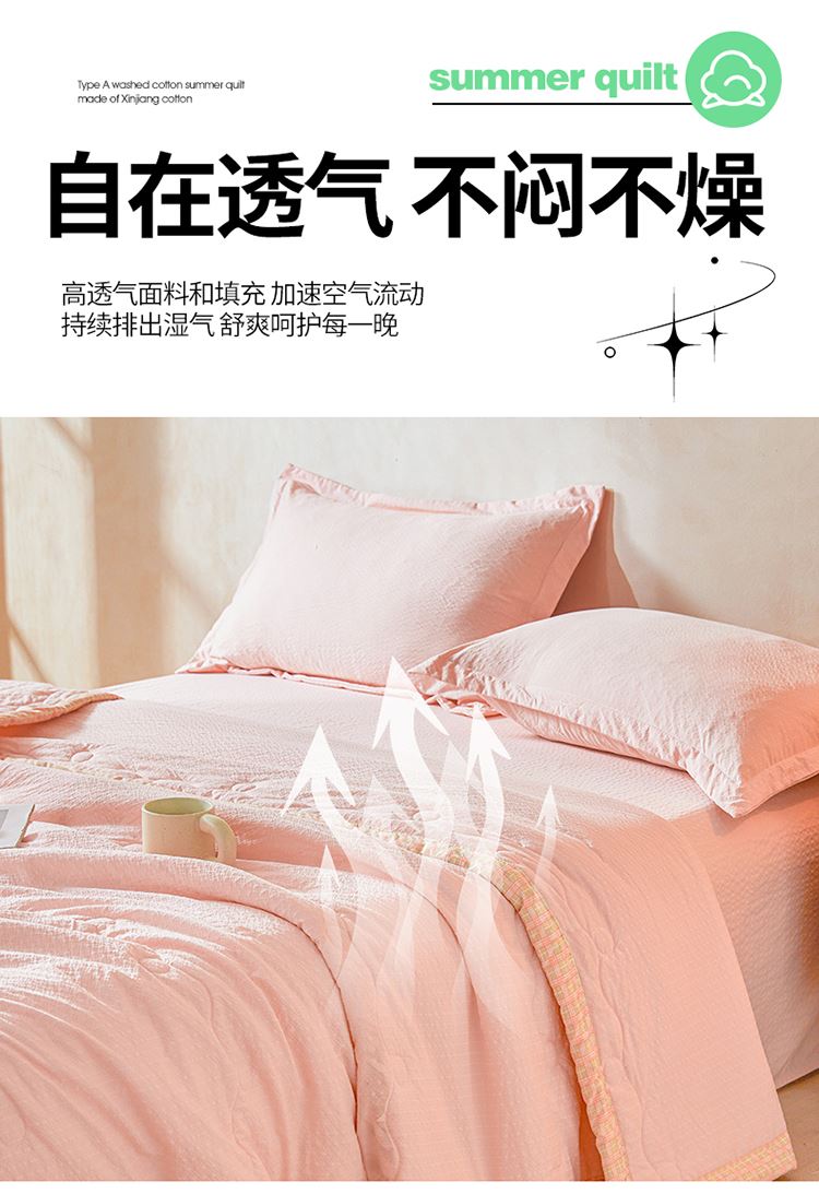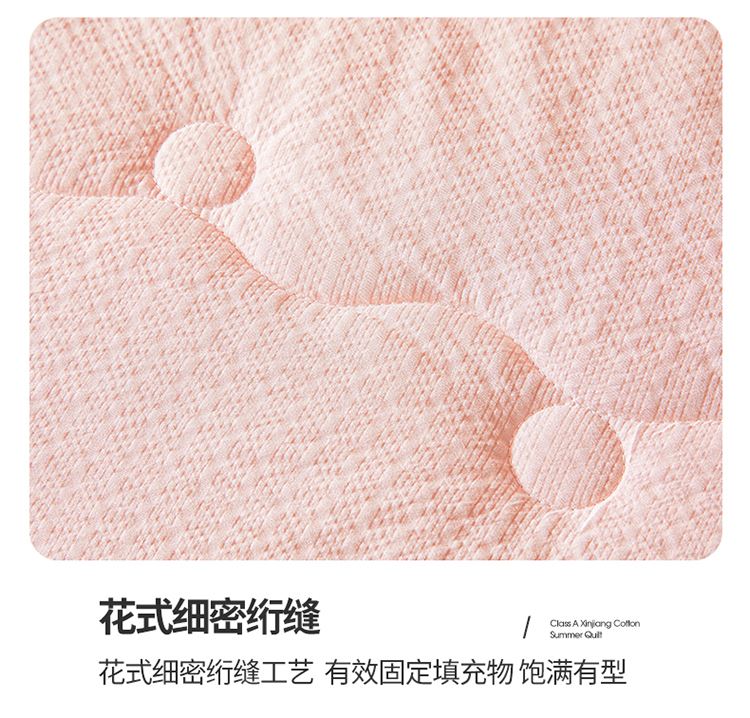 规格:200*230cm 面料:泡泡纱(聚酯纤维) 填充:51%棉花+49%羽丝棉 重量:1.5kg 卖点: 1、棉花填充,睡得安心,轻薄不压身,裸睡也舒服 2、水洗绵面料,软糯亲肤不扎身,透气不闷汗,夏天盖着超清爽。 3、简约耐看,夏天卧室必备