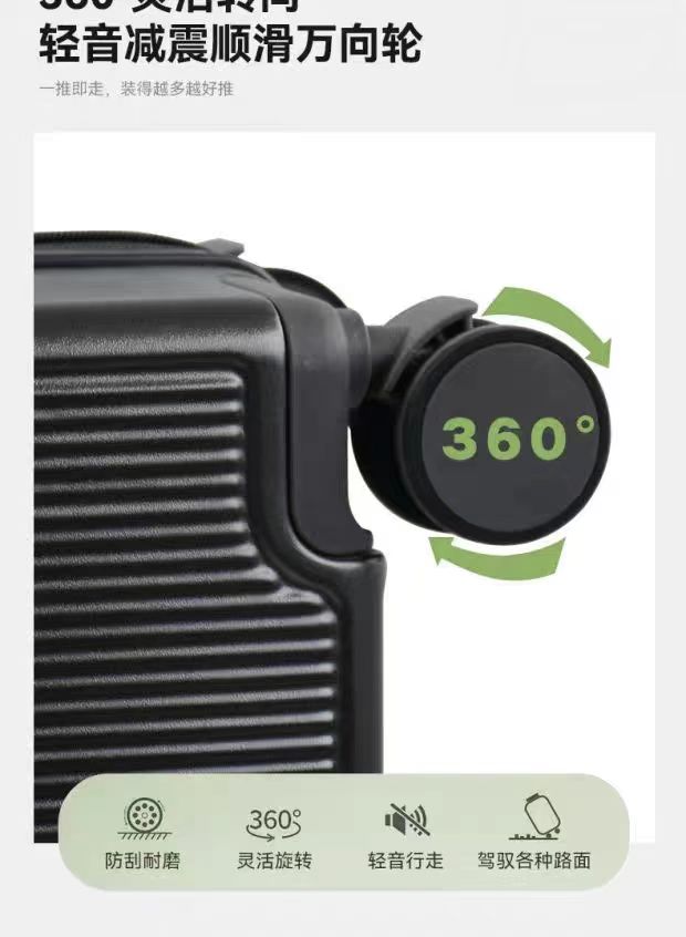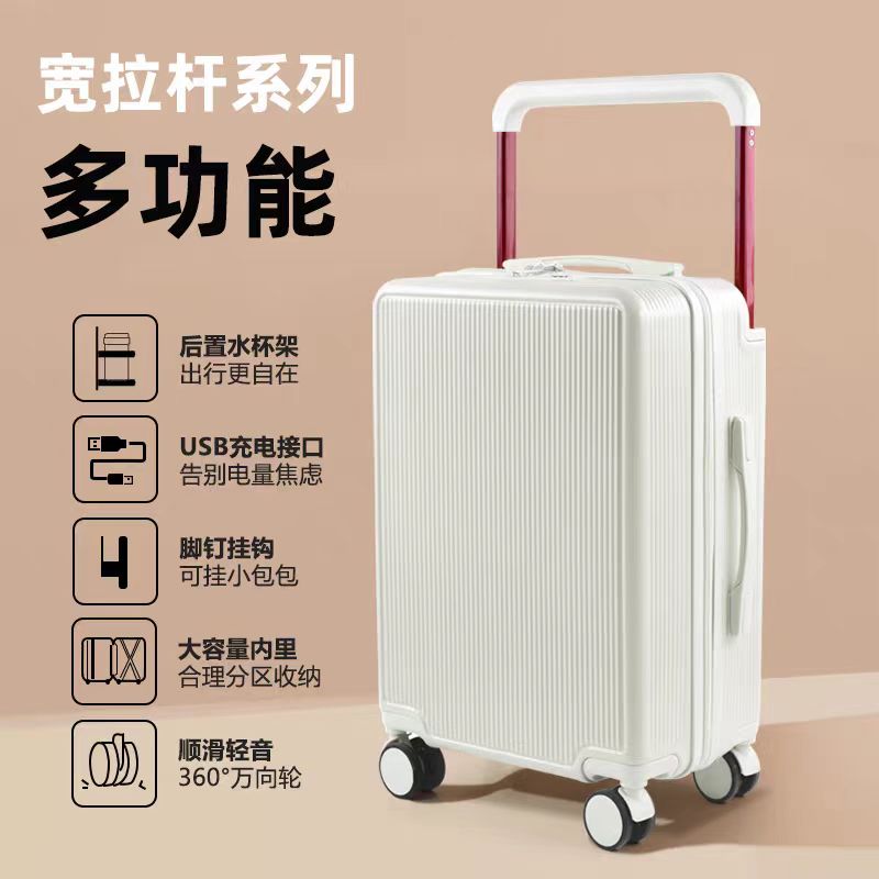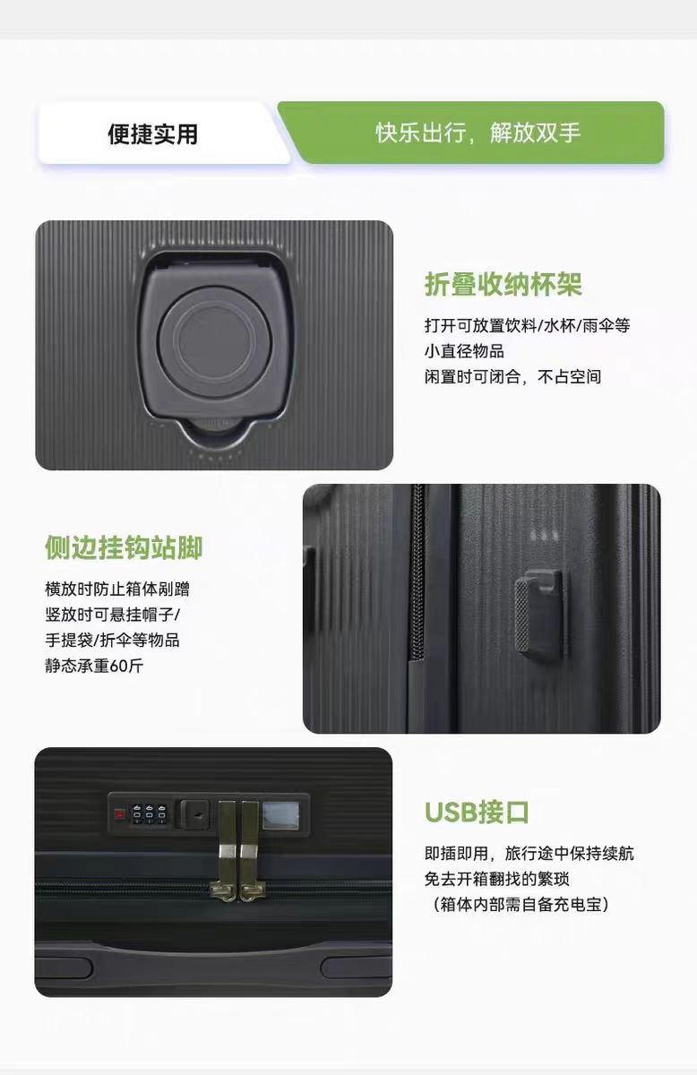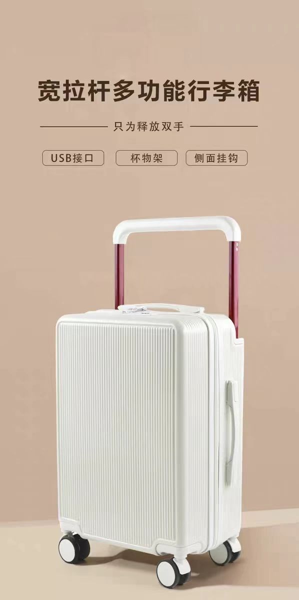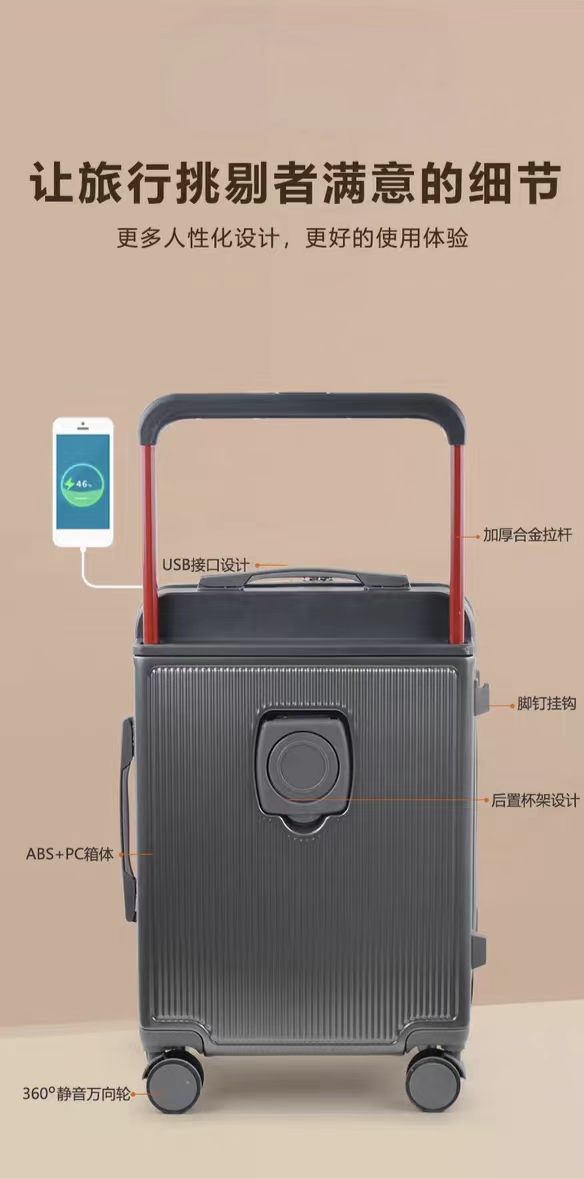 三层防刮拜尔复合材质坚韧耐磨,细腻处理,质感丰富,受力均匀省力又稳固,后置拉杆更省空间,箱内空间使用率更高;后置可折叠便携杯架,咖啡、水杯、雨伞都可放这,更多隐藏功能期待你的解锁,360度轻音减震万向轮,畅滑省力,多路面行走不卡顿、不费劲,旅途优雅不打扰;三位一体密码锁,安全出行有保障,大容量网袋内衬,分区收纳更合理,外置USB接口,释放双手轻松出行无负担~