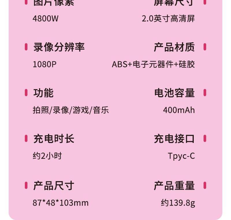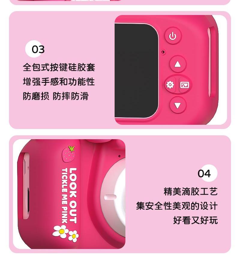 产品型号:c25儿童相机 屏幕尺寸:2.0"IPS高清屏 产品功能:拍照/录像/音乐播放 产品材质:ABS+PC+硅胶 电池容量:400mAh 产品款式:草莓熊/米奇/米妮 充电电压:直流DC-5V/1A 存储方式:TF卡 拍照时间:约4小时 录像时间:约2.5小时 自带语言:英语,日语,德语,中文简体,中文繁体 法语,意大利语,西班牙语,韩语,俄语