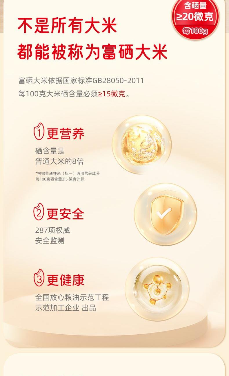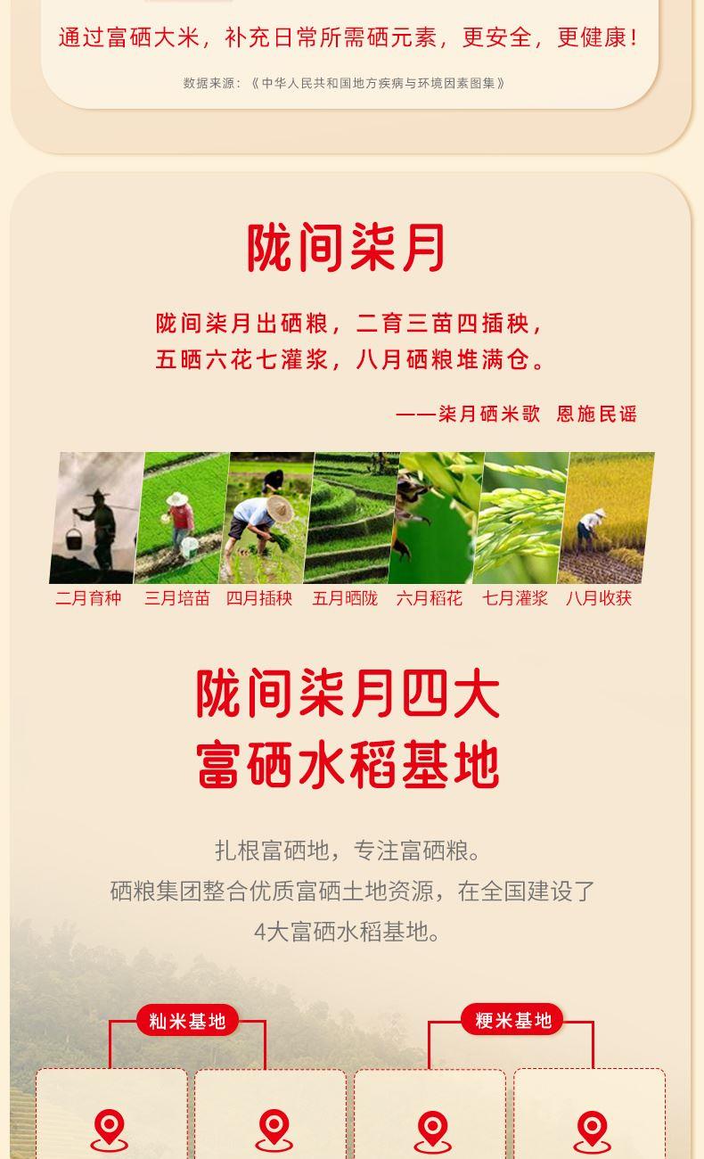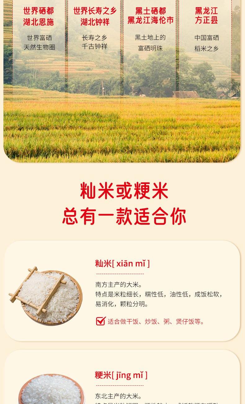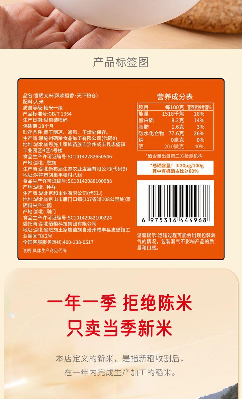 产品信息 品 名:富硒大米(风吹稻香·天下粮仓) 规 格:500g 箱 规 30袋/箱 包 装:单层真空包装 产品特色 1、源自世界硒都·湖北恩施,南方籼米; 2、鲜稻现碾,纤细苗条,晶莹洁白,软硬适中,饭粒松软; 3、富有机硒认证,每100g平均硒含量≥20ug;