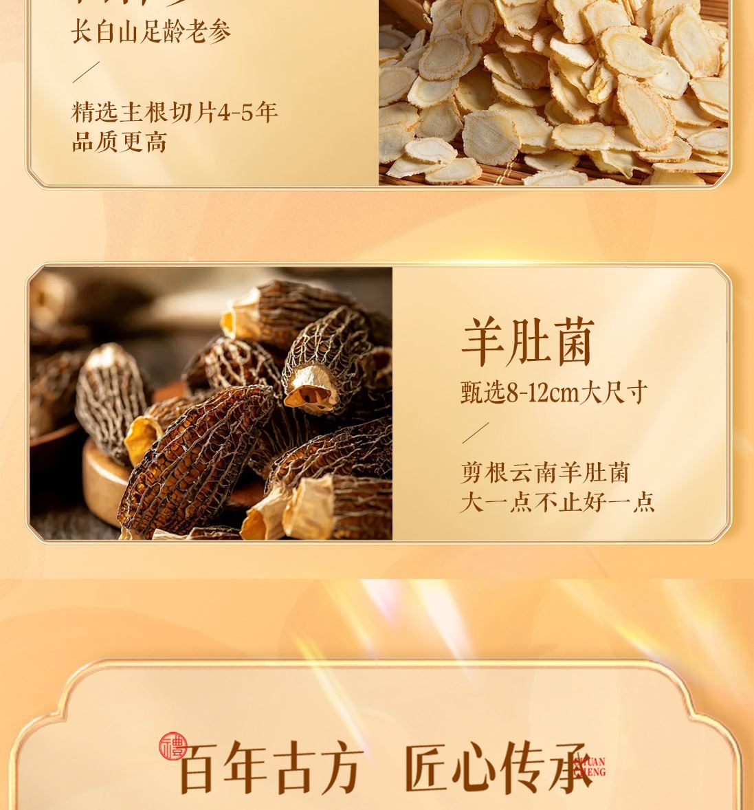 配置:羊肚菌(9-11cm)34g、鲍鱼96g、西洋参50g 商品规格:180g/盒 产品尺寸:305*305*97mm 保质期:12个月 京东自营销量好评1w+,源头工厂,支持项目授权,项目保护