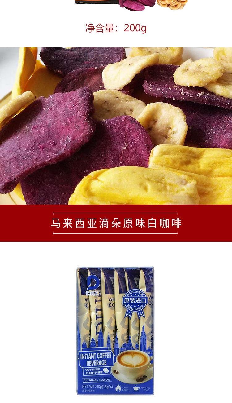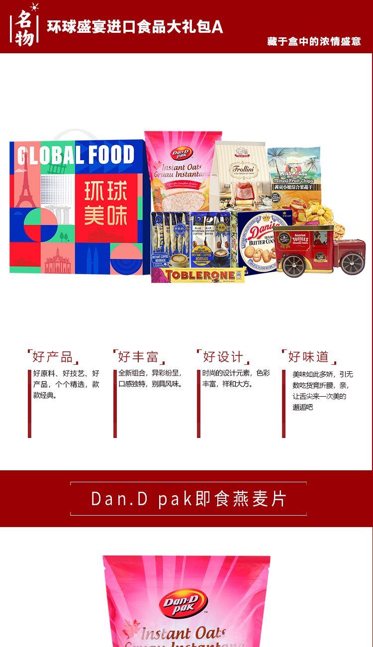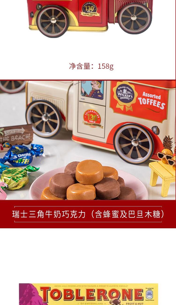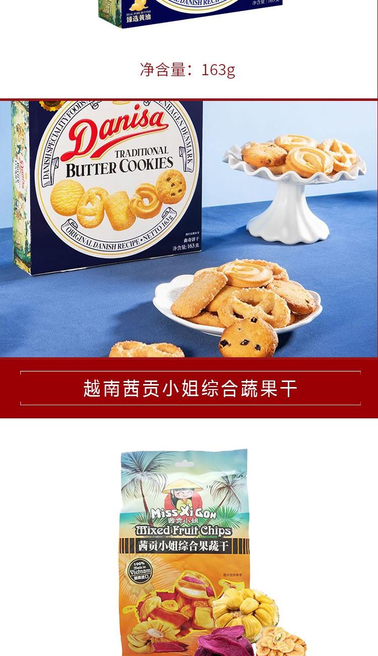 英国沃尔克斯什锦太妃糖(130周年纪念版红色)158g 瑞士三角牛奶巧克力(含蜂蜜及巴旦木糖)100g 意大利维趣多可可榛子味饼干225g 印尼皇冠丹麦曲奇饼干163g盒装 越南茜贡小姐综合蔬果干200g 马来西亚滴朵原味白咖啡90g 马来西亚滴朵蓝山风味咖啡90g 越南进口丹帝即食燕麦片1000g 名物精美包装盒:360*360*190mm