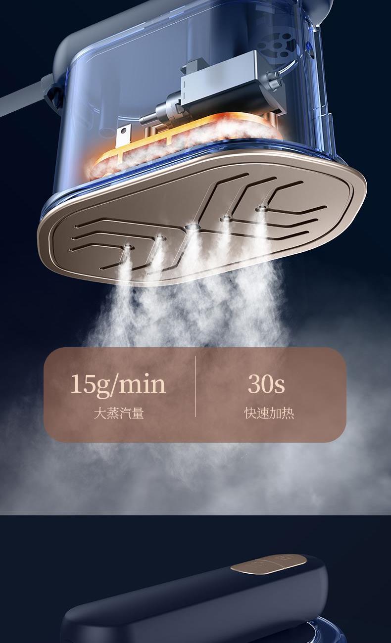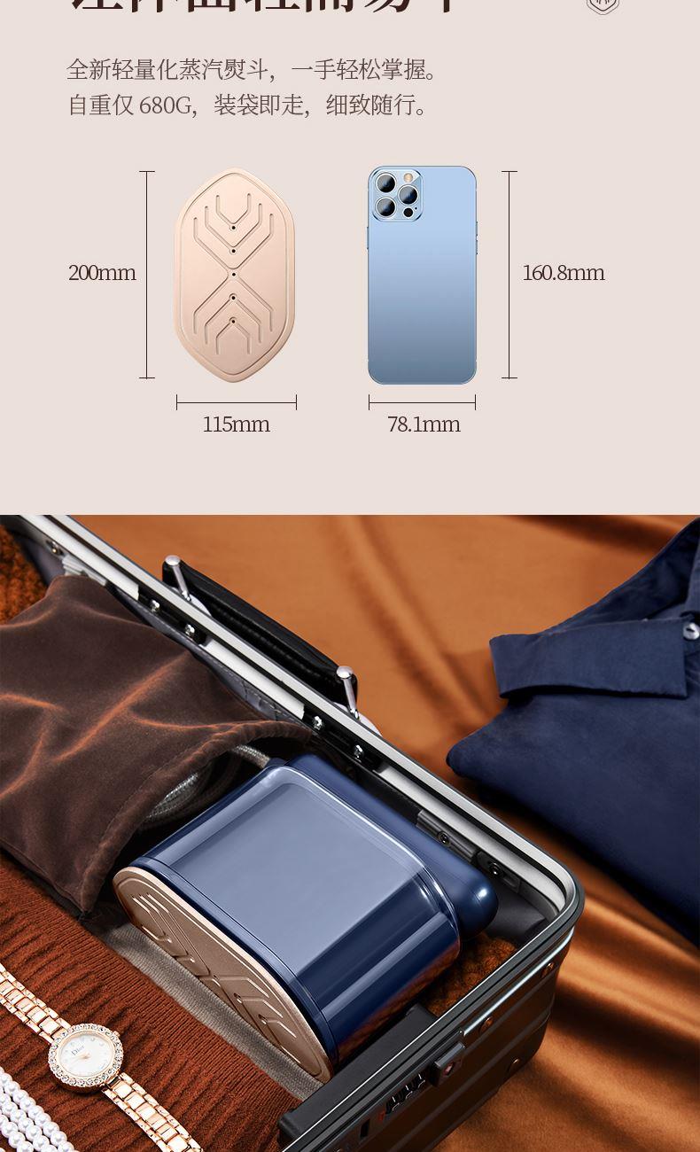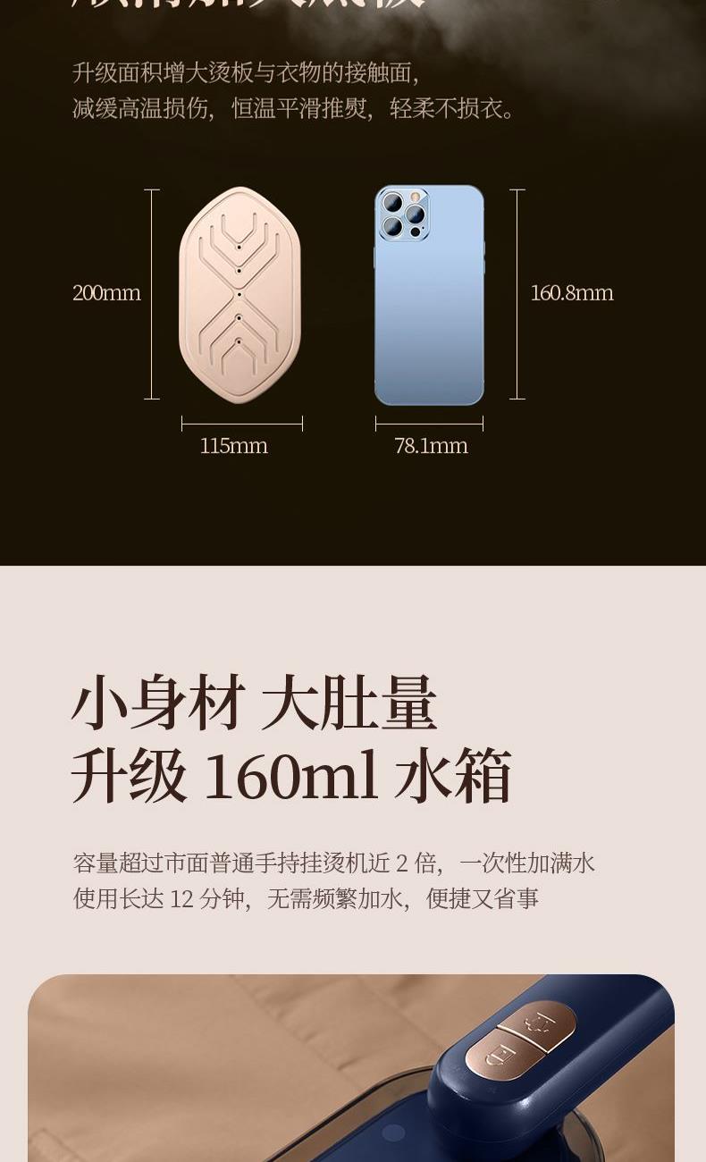 长*宽:200mm*115mm 功率: 1001W(含)-1500W 干湿双熨,平挂二合一, 全新轻量化蒸汽烫斗,一手轻松掌握, 自重仅680G,装袋即走,细致随行