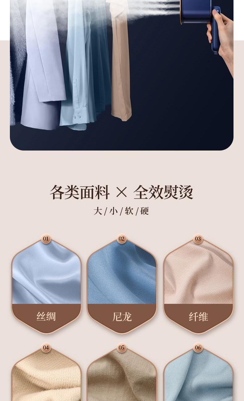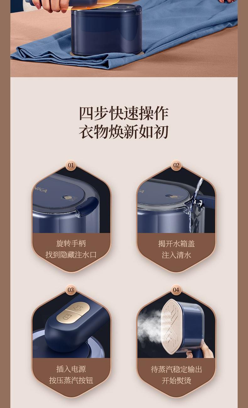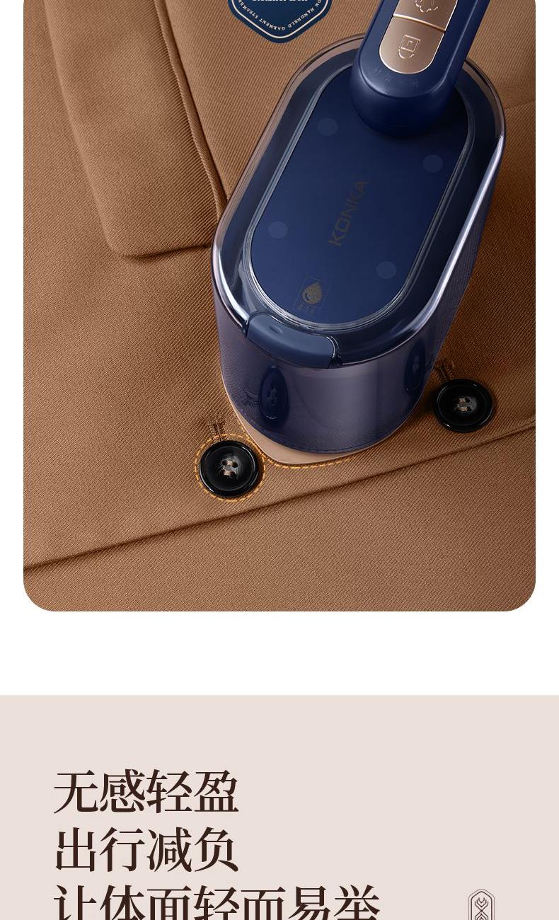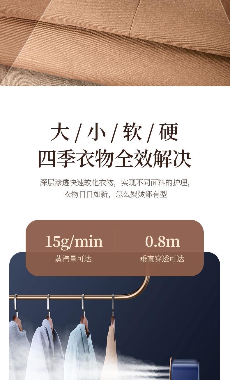 长*宽:200mm*115mm 功率: 1001W(含)-1500W 干湿双熨,平挂二合一, 全新轻量化蒸汽烫斗,一手轻松掌握, 自重仅680G,装袋即走,细致随行