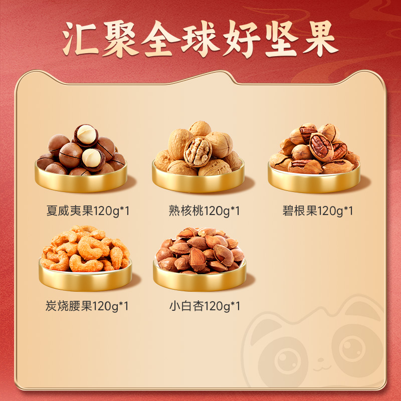 克重:600克 内配: 1.腰果120g*1袋 2.碧根果120g*1袋 3.小白杏120g*1袋 4.熟核桃120g*1袋 5.夏威夷果120g*1袋 礼盒规格:260*68*350mm 保质期:8月