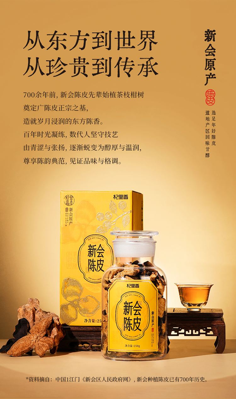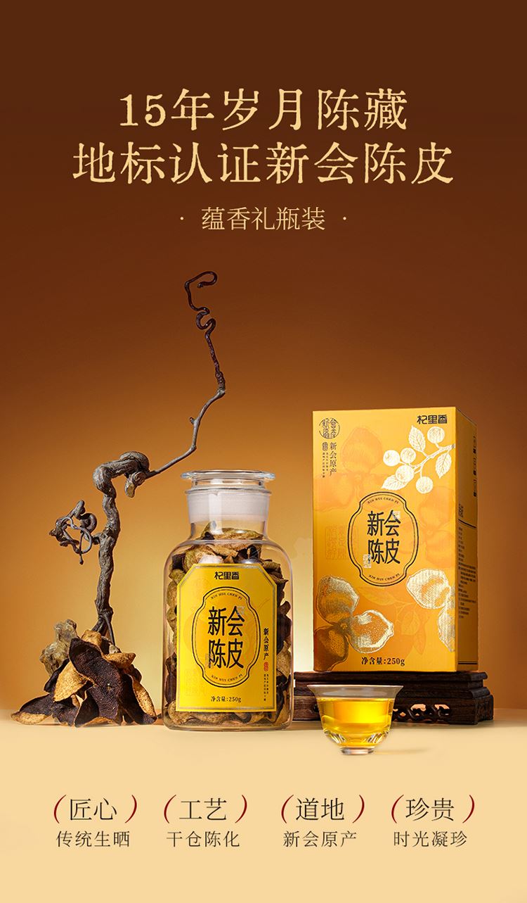 产名:新会陈皮 净含量:250克(15年) 原料产地:广东省江门市新会区 贮存条件:密封置阴凉干燥通风处 品种:大红皮 等级:一等品地:宁夏银川保质期:18个月 礼盒尺寸:170*165*315mm 礼袋尺寸:200x180x355mm 温馨提示: 1.新会陈皮贮存时间越长越醇香,使用价值越高。 2.如有受潮或雨天天气较长,应及时翻日西(建议一年翻晒两次)。 3.请勿与有异味物品同放、勿放入冰箱内存放。